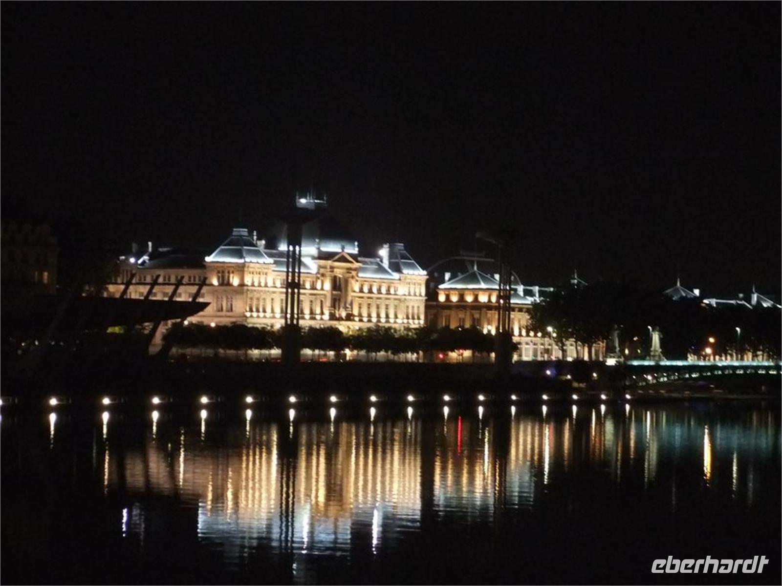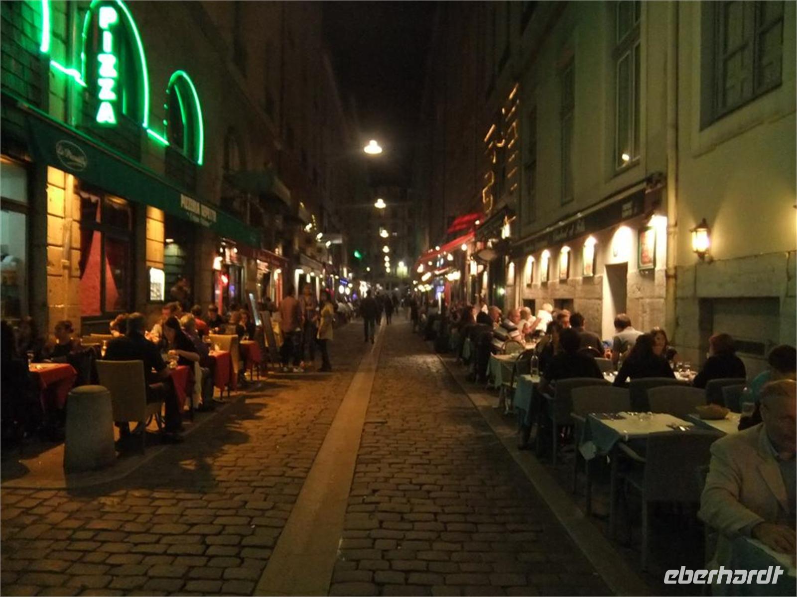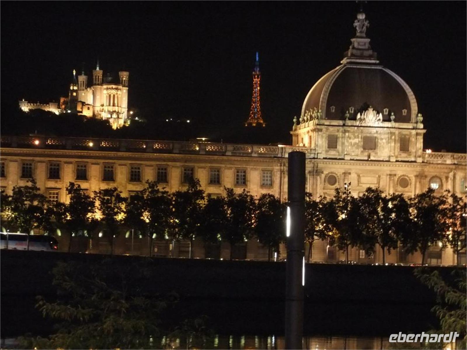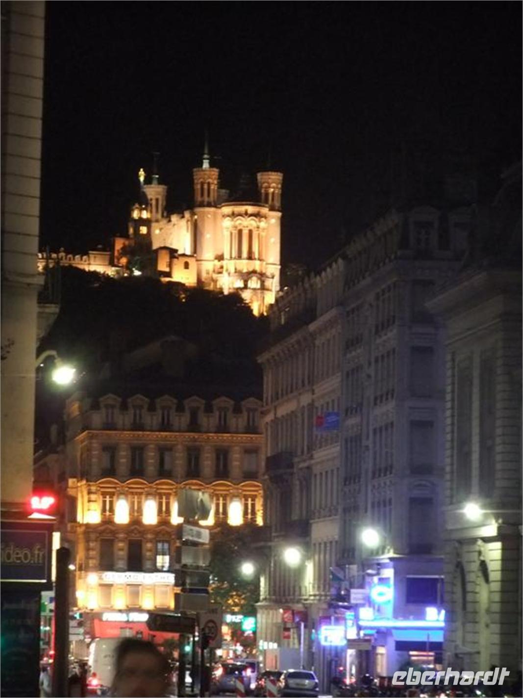 der Verband Groß-Lyon Sieger geworden. Wir essen in einem Restaurant außerhalb des Hotels, das sind höchstens 10 Minuten Fußweg. Aber welche wundervollen Minuten beim Gang durch die belebte Gasse vor der place Bellcour, in der sich Restaurant an Restaurant reiht, die Gäste sitzen an der Tischen der Straße, über die hell erleuchtete Rhonebrücke mit dem Blick auf die hell angestrahlte Basilika, den kleinen "Eiffelturm" und die repräsentativen Gebäude. Die Lichterstadt Paris hat eine echte Konkurrenz bekommen.