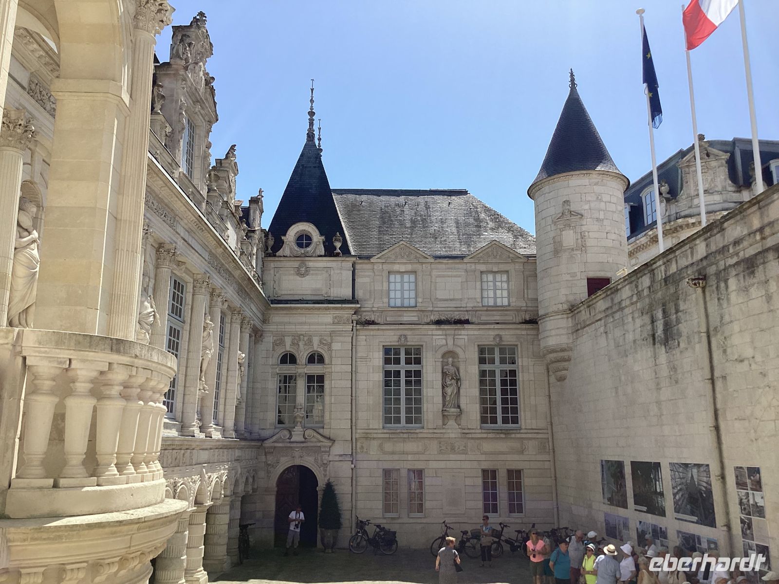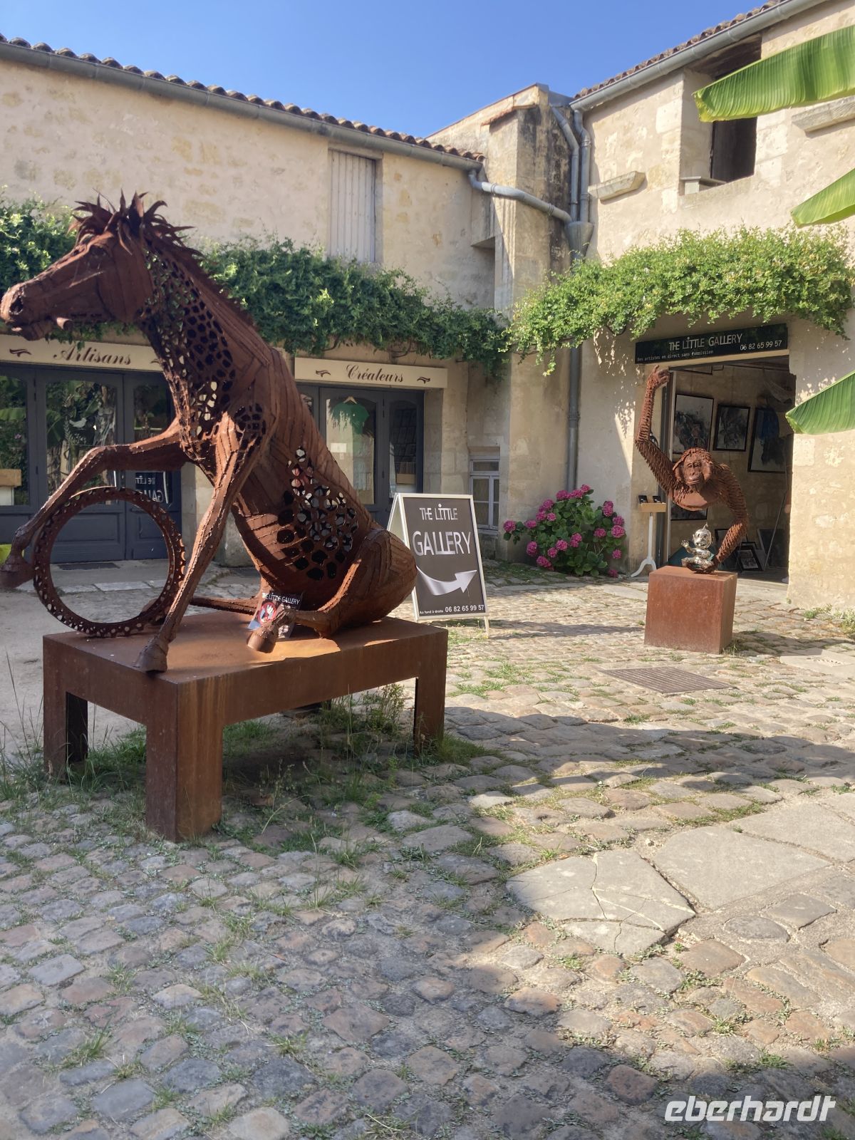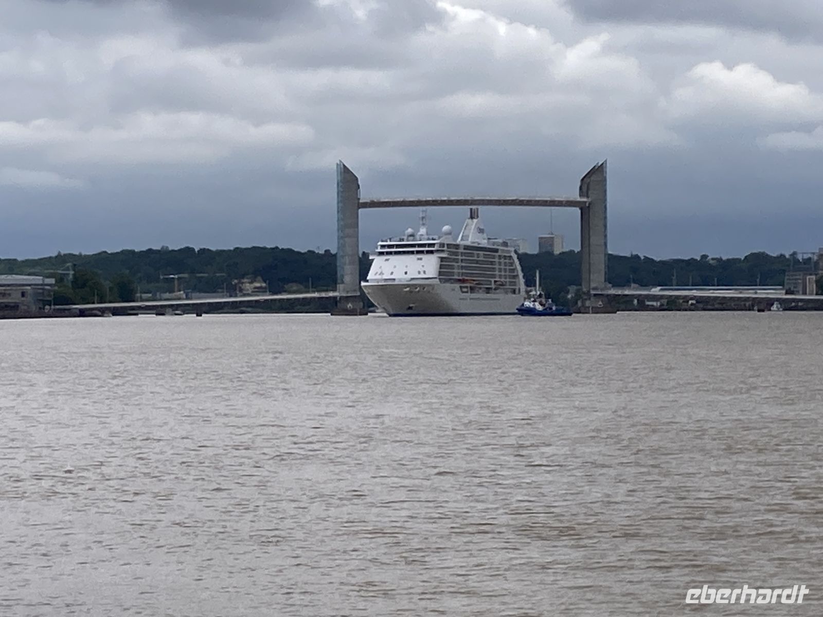 Wir starten nach dem Frühstück zu unserem Tagesausflug und dies in einem französischen Bus mit französischen Chauffeur. Unsere Umtriebe waren von Erfolg gekrönt. Mit Hilfe unserer Zahlmeisterin Luana konnte ein Ersatzbus für heute organisiert werden. Unser Fahrer hat sich indessen auf den Weg in Richtung Lyon gemacht, um auf halber Strecke mit einem anderen Fahrer den Bus zu tauschen. Ab morgen ist unser Bus dann blau und hat eine funktionierende Klimaanlage. Genießen wir also den heutigen Ausflug, der uns zunächst zu einen Industriedenkmal führt. Ähnlich wie in Bilbao gibt es hier eine Schwebefähre. Sie ist allerdings nur für Fußgänger und Radfahrer zugelassen. Heute jedoch schwebt leider gar nichts, denn es ist Revisionstag. Auf einer Schautafel sehen wir jedoch, wie es funktioniert. Weiter geht es nun nach Rochefort. Diese Stadt, die vor allem ein Militärischer Stützpunkt war, ist für zwei Dinge bekannt. Zum einen befindet sich hier die Königliche Seilerei. Zum anderen ging Rochefort in die Filmgeschichte mit den Desmoiselles de Rochefort ein. Die beiden Damen sind natürlich auch in der Stadt verewigt. Der Nachmittag ist für La Rochelle reserviert. Diese Stadt war immer schon ein besonderer Hafen. Vor allem im 16. und 17. Jahrhundert war hier ein Zentrum des Protestantismus und bot den Hugenotten nicht nur wirtschaftliches Auskommen, sondern auch einen Ort der Glaubensfreiheit. In La Rochelle treffen wir überall auf Geschichte. Türme und Stadttore aber auch Arkaden, die über drei Kilometer Schutz vor Regen, heute aber vor der Sonne bieten. In La Rochelle könnten wir problemlos noch viel mehr Zeit verbringen, aber langsam müssen wir wieder den Rückweg antreten, schließlich legt unser Schiff heute wieder ab.