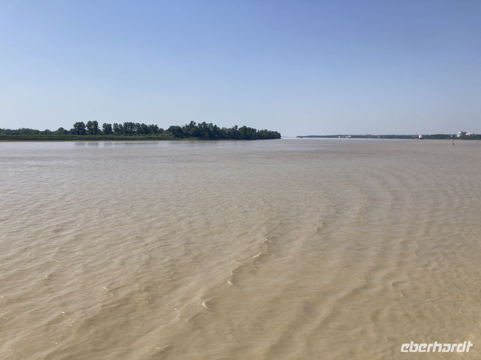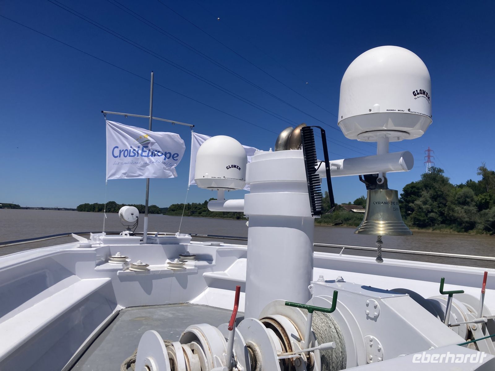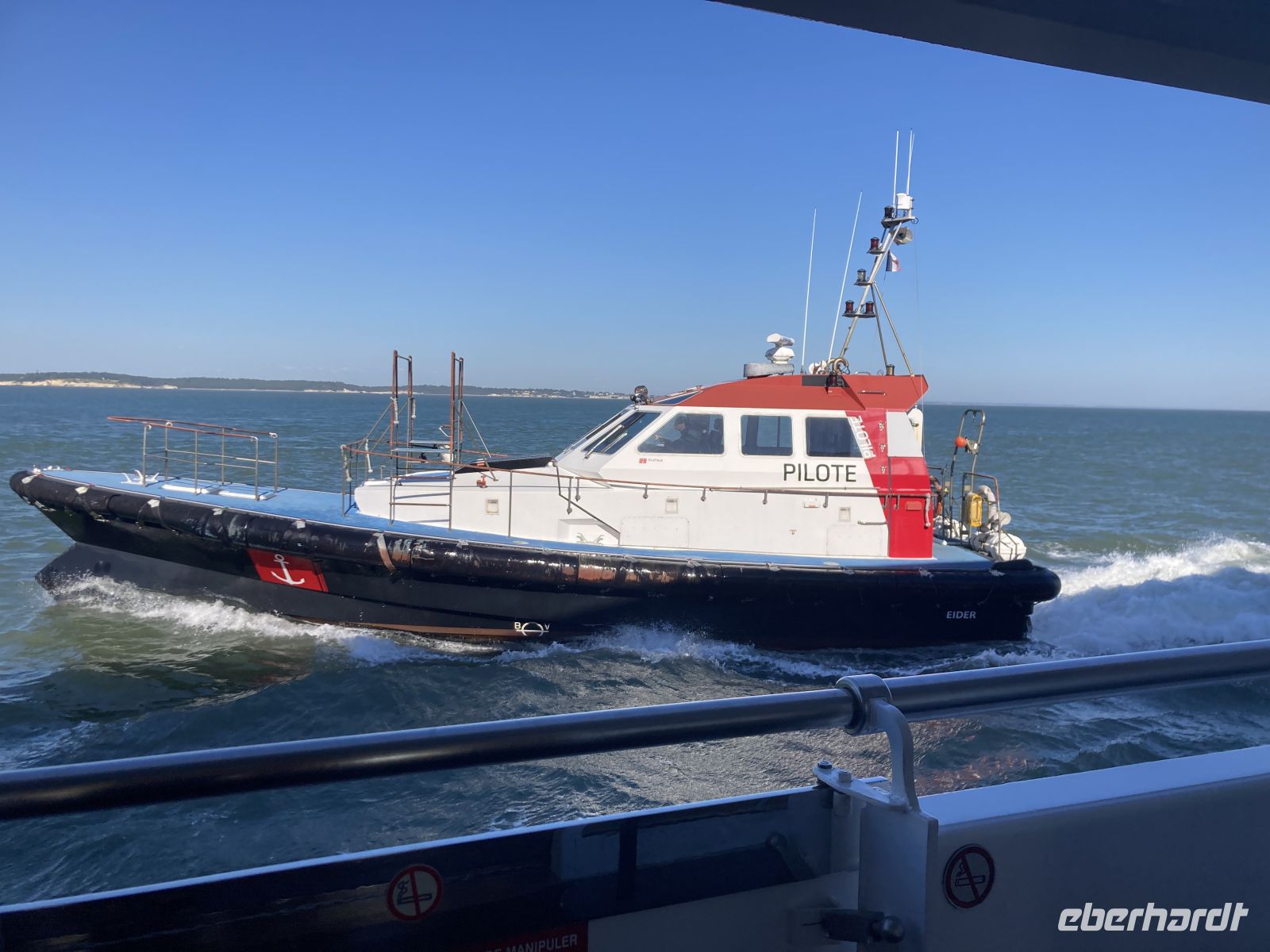 Obwohl wir eigentlich schon auf der Seite von Royan sind, muss unser Schiff die Seite wechseln. Wir werden nun ein Stück auf der linken Uferseite fahren, um dann ziemlich gerade Kurs auf Royan zu nehmen. Damit dies jedoch gelingt, bekommen wir nun sogar einen Lotsen an Bord. Ein bisschen fühlt es sich nun an, wie auf einem Hochseeschiff. Aber keine Angst, es schaukelt deutlich weniger und wir gelangen mit Lotsen und Kapitän souverän zu unserer Anlegestelle.