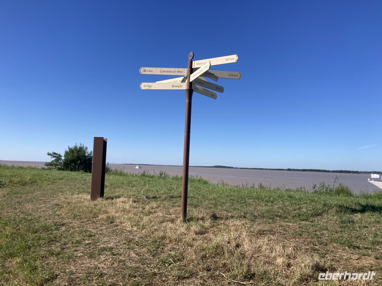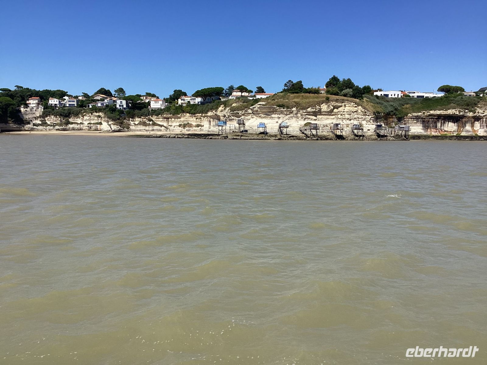 Der Sonntagvormittag steht erneut im Zeichen des Weines. Wohl eines der bekanntestes Weinanbaugebiete werden wir nun mit dem Médoc kennenlernen. Wer bislang glaubte, nur an der Loire stünden viele Schlösser, wird hier eines besseren belehrt. Zugegeben, sie wurden nicht unbedingt von Königinnen und Königen bewohnt, doch so manches Bauwerk würde auch Blaublütern zur Ehre gereichen. Heute werden die Anwesen meist mit einem bestimmten Wein genannt und auch wir verkosten hier selbstverständlich den edlen Rebensaft. Wieder zurück an Bord gibt es noch die Gelegenheit den Festungbau von Vauban zu erkunden. Gleich drei Stück gibt es hier an der Garonne und der Gironde. Die drei bildeten eine Art Verteidigungslinie, die es Frankreich unter Ludwig IV ermöglichte, Angriffe insbesondere von den Engländern frühzeitig zu erkennen und dann abzuwehren. Nachdem wir nun die Garonne ein Stück kennenlernen durften, stehen heute einige Manöver auf dem nautischen Programm. Nicht nur, dass wir von der Garonne in die Gironde fahren werden, uns erwarten auf dem Wege zu unserem heuten Tagesziel auch noch die größte Flussmündung Westeuropas. Wir werden Zeugen wie die Gironde immer breiter wird und tatsächlich ist hier auch schon ein Wellengang zu spüren. Zunächst fährt die Cyrano am rechten Ufer entlang. Die Strände und Buchten sind bei diesen heißen Temperaturen schon gut besucht. Sehr schön zu sehen sind auch die Felswände, die aus einem weichen Kalkstein bestehen. Hier wurden Höhlen in diesen Stein gehauen, die als Vorratskeller oder Garage genutzt werden.
