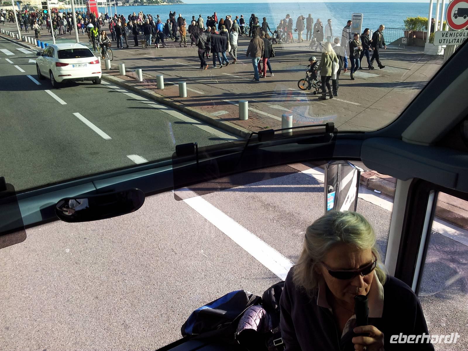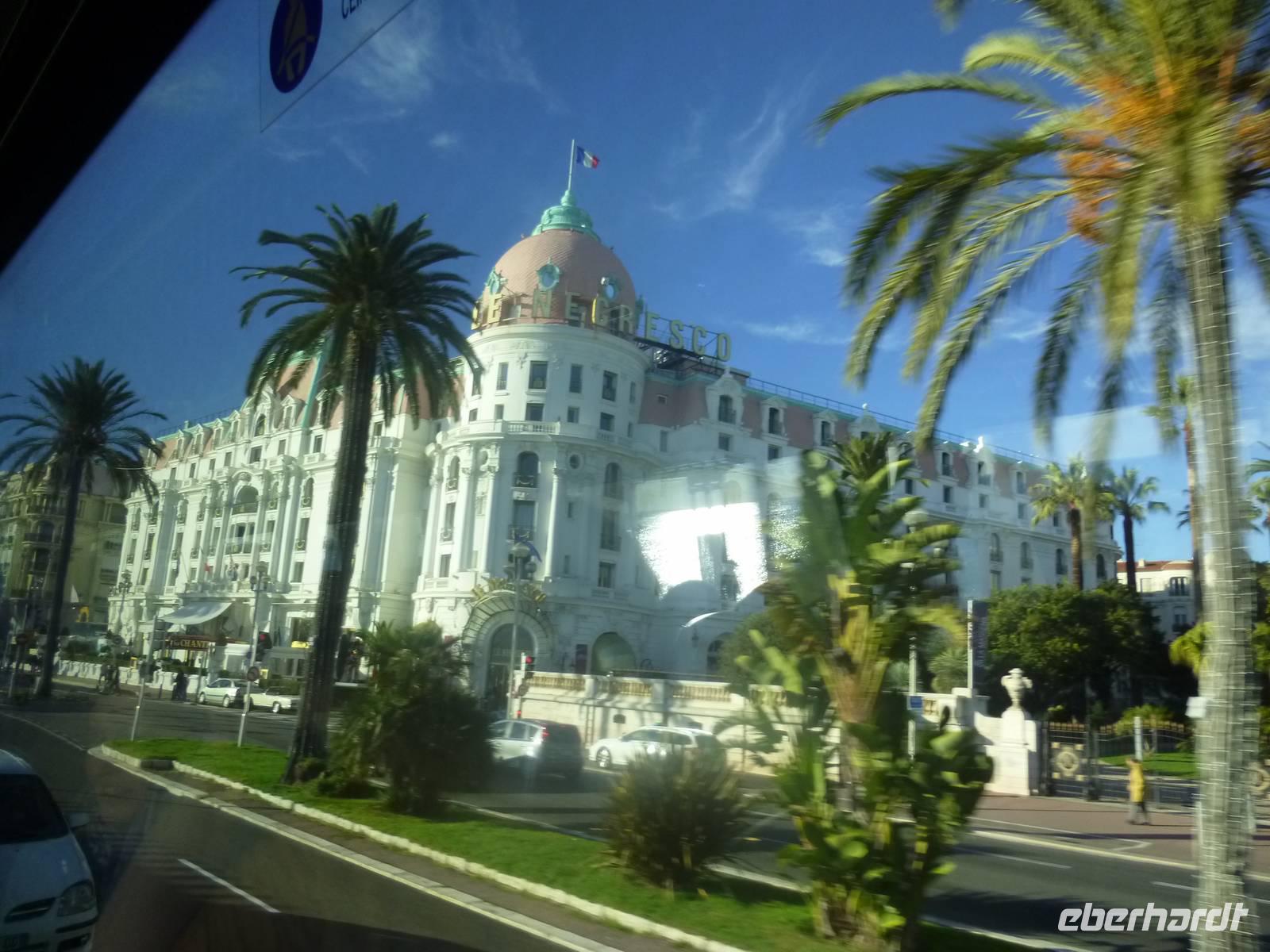 Heute ist unser Rückflug und unsere erlebnisreiche Reise endet leider. Aber vorher hatten wir den ganzen Vormittag in Nizza um die letzten Eindrücke oder Einkäufe zu machen. Als Überraschung von Eberhardt bat ich allen meinen Gästen an zu Fuß bis zum 5-Sterne Hotel „Negresco" zu gehen um dort einen Kaffee zu genießen. Wir mussten alle Regenschirm oder Regenjacke mitbringen da sich Nizza mit Regentränen von uns verabschieden wollte. Wir mussten nur drei Minuten im Hotel warten damit sie für uns drei Tische im Restaurant vorbereiteten. Wir waren allein und es war einfach sehr schön. Als wir uns später alle wieder trafen hatte jeder von uns erzählt was man mit der freien Zeit gemacht hatte, um die letzten Stunden in Nizza zu genießen: einige waren im berühmten Musem „Musee Matisse", andere wieder im „Chez Freddy" wie am zweiten Tag zum Mittagessen und andere wollten einfach durch die Straßen von Nizza schlendern um ein anderes Nizza zu erkundigen. Emily brachte uns gut, wie immer, zum Flughafen.