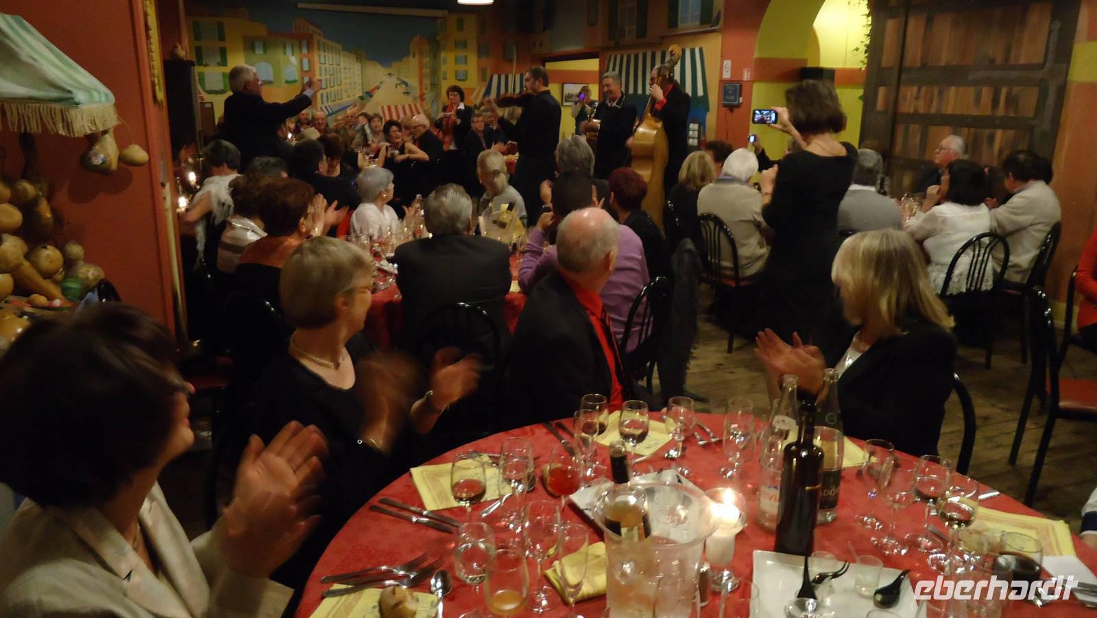Kurz vor 20 Uhr trafen wir alle ganz elegant angezogen im Hotel und gingen zu Fuß zum Restaurant. Es erwartete uns ein vier-Gänge-Silvestermenü in der eleganten nizzianischen Brasserie „Le Ligurie". Wir konnten hier gesellig in das Neue Jahr hinein feiern. Alle Getränke waren an diesem Abend inkludiert und während des Essens hatten wir immer eine musikalische Unterhaltung, ein Trio welches von Tisch zu Tisch ging und musizierte. Das Dessert wurde um 23:30 Uhr serviert und der Champagner zum Antoßen kurz vor Mitternacht.