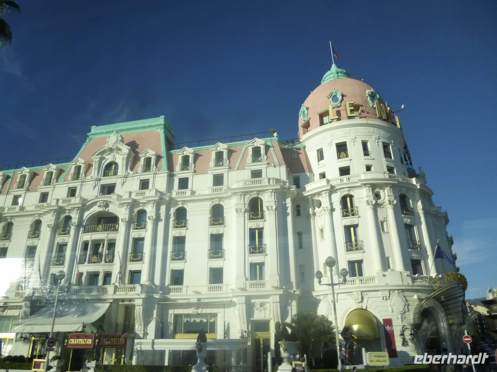 In den nächsten Tagen hatten wir Glück mit dem Wetter, aber heute bei der Ankunft begrüßte uns Nizza mit einem heftigen Regen. Um 17:30 Uhr machten wir das Check-in im Hotel "Ellington". Das gehobene 4-Sterne Hotel liegt in einem eleganten Viertel im Herzen der Stadt, nur 5-10 Minuten vom Strand und den Einkaufsvierteln entfernt und bietet lockere Eleganz mit subtilem Stil. Das Hotel bietet eine hübsche Architektur im typischen Nizza Stil aus den 1920igern und hat uns allen beim ersten Eindruck gut gefallen.