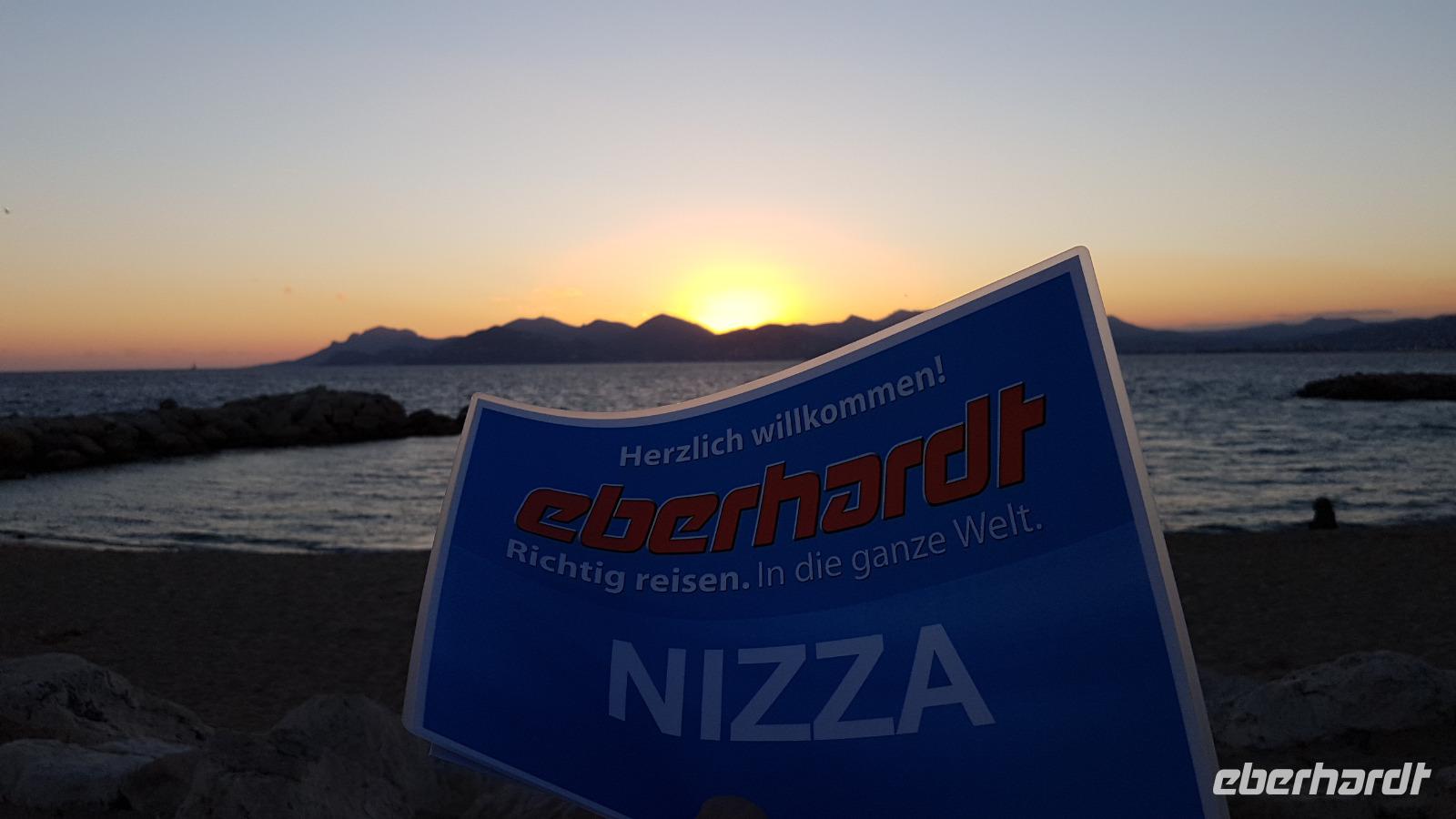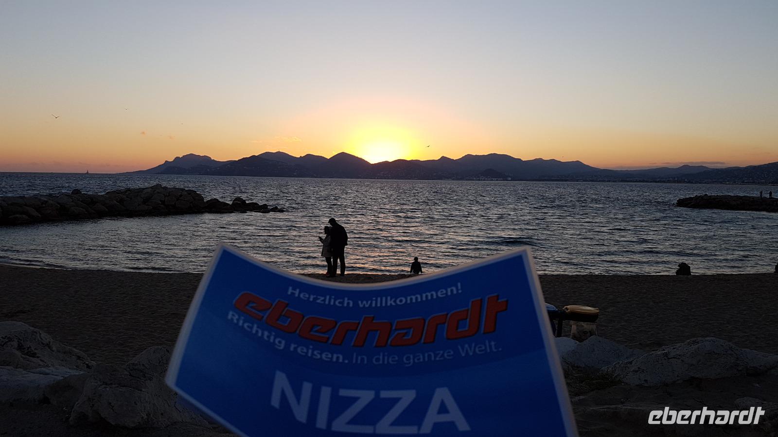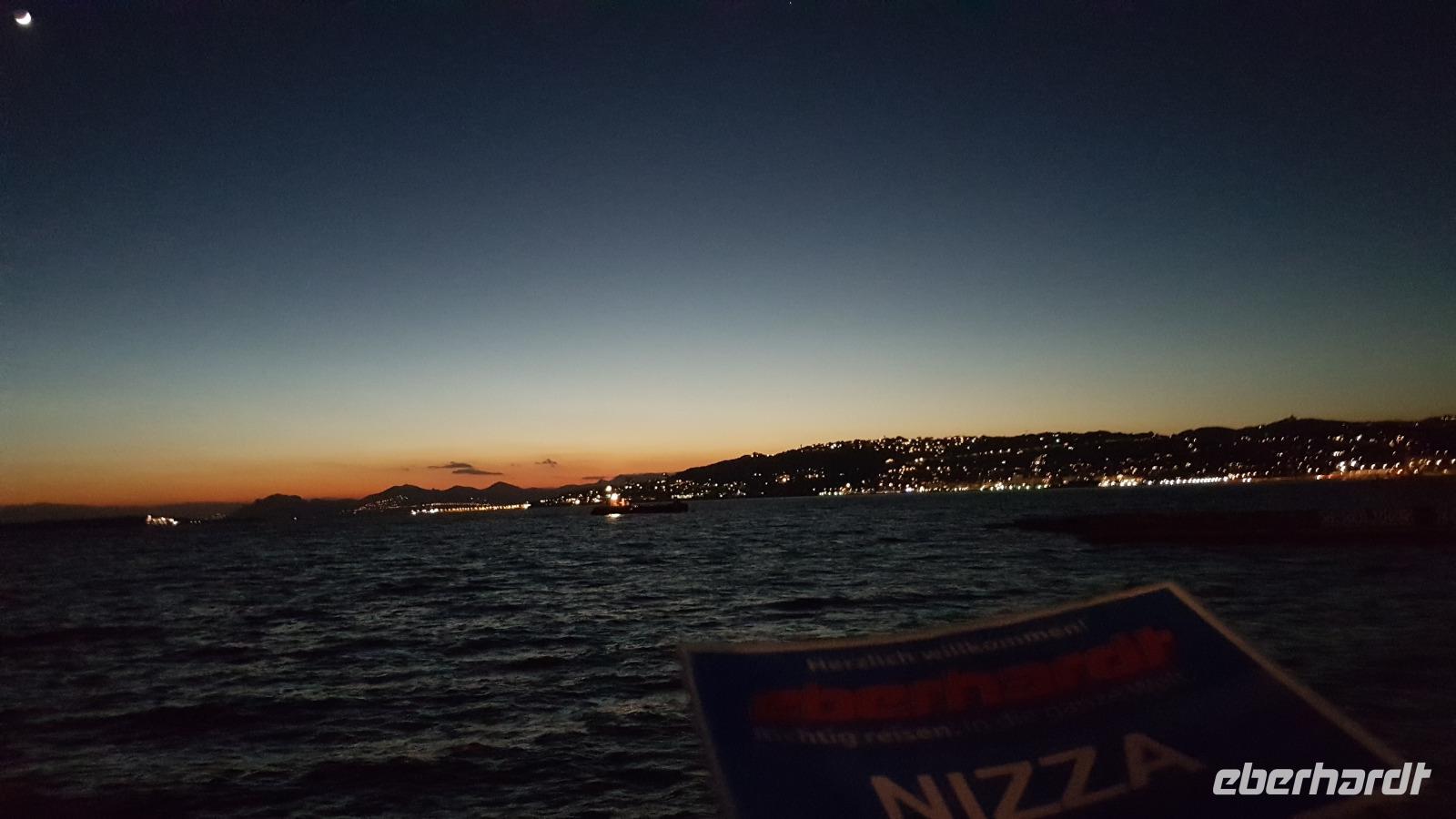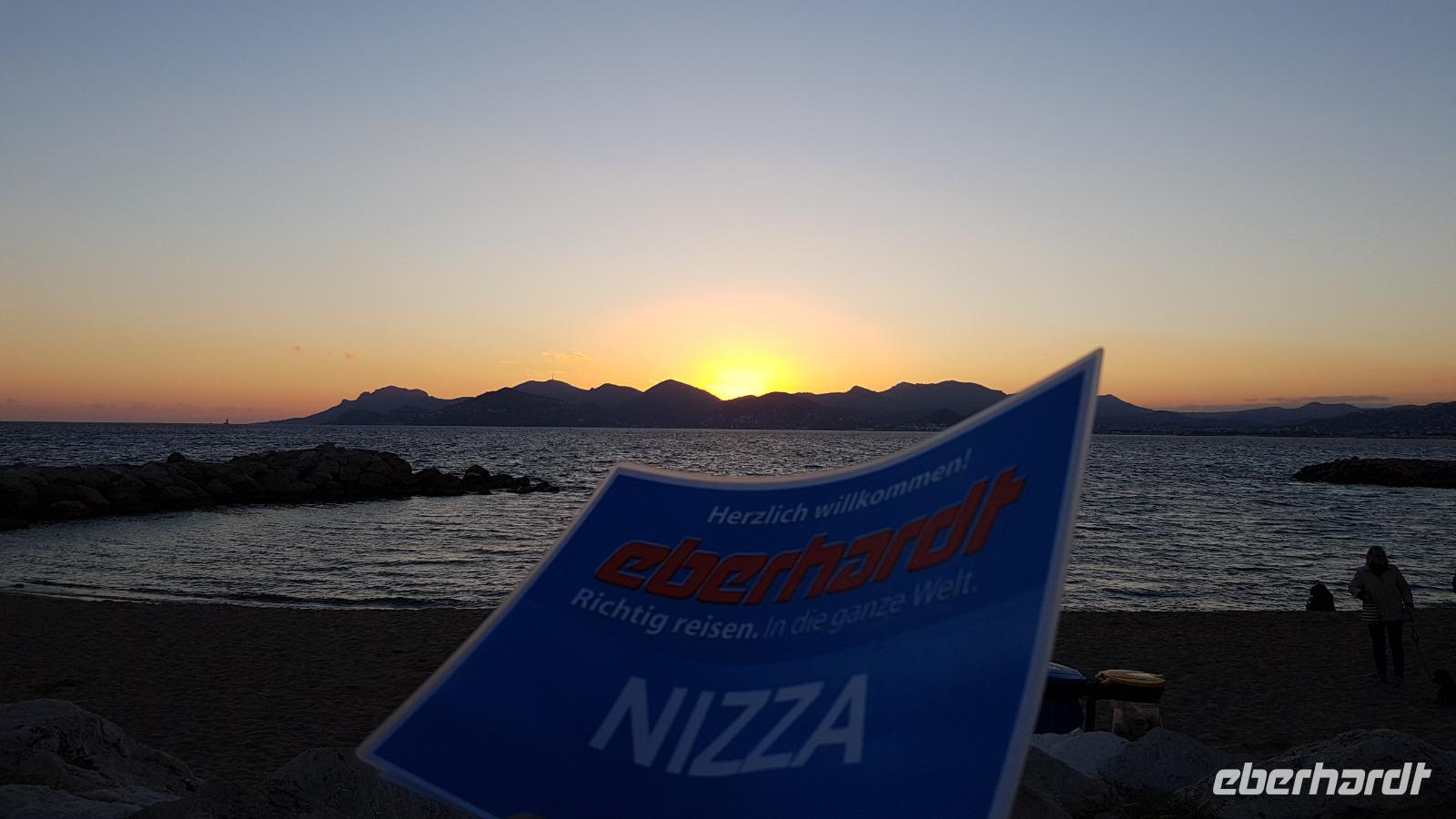Am Abend genossen einige von uns noch ein Abendessen in einer typisch nizzaischen Brasserie. Das heutige Abendessen liegt in der Nähe vom Hotel und wir trafen uns um kurz vor 20 Uhr, um zu Fuß bis zum „L´Authentic" Restaurant zu spazieren. Das Menü war lecker und während des Essens haben wir versucht uns alle einmal kurz vorzustellen, damit wir uns langsam kennen lernen und wissen, wie wir heißen oder woher wir kommen. Auf dem Rückweg zum Hotel machten wir einen Spaziergang bis ans Meer und zur Promenade, um das Mittelmeer zu genießen. Wir wollten das Meer sehen und entlang der „Promenade des Anglais" schlendern. Wir genossen einen herrlichen Sonnenuntergang. Ich zeigte einigen Gästen, wo ein Supermarkt bis 22 Uhr geöffnet hat, falls man Wasser oder Obst besorgen möchte. Schon im Hotel wünschten wir uns allen eine gute erste Nacht.