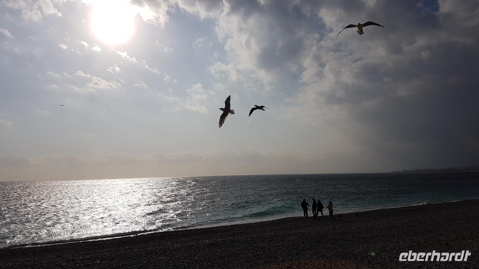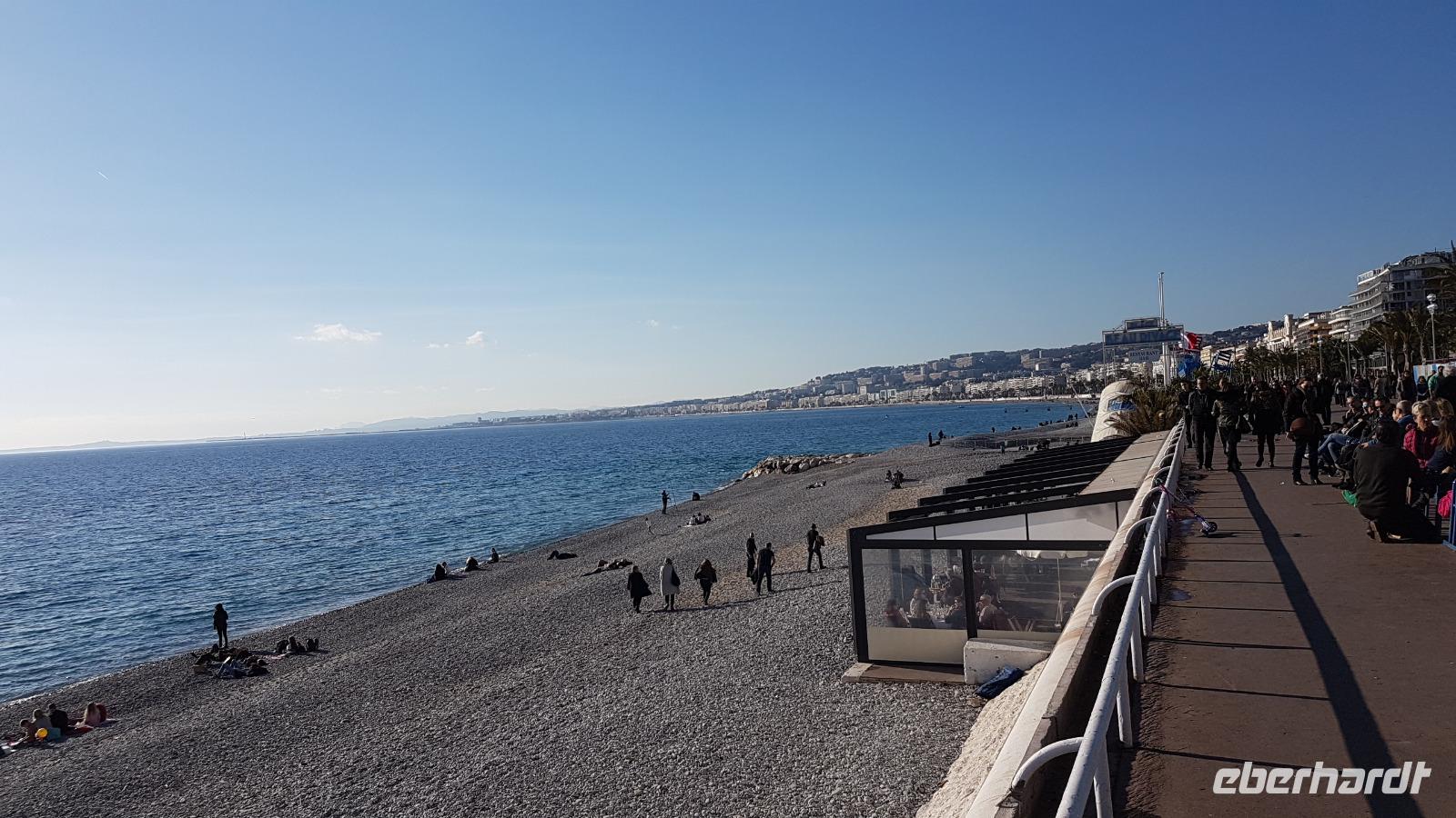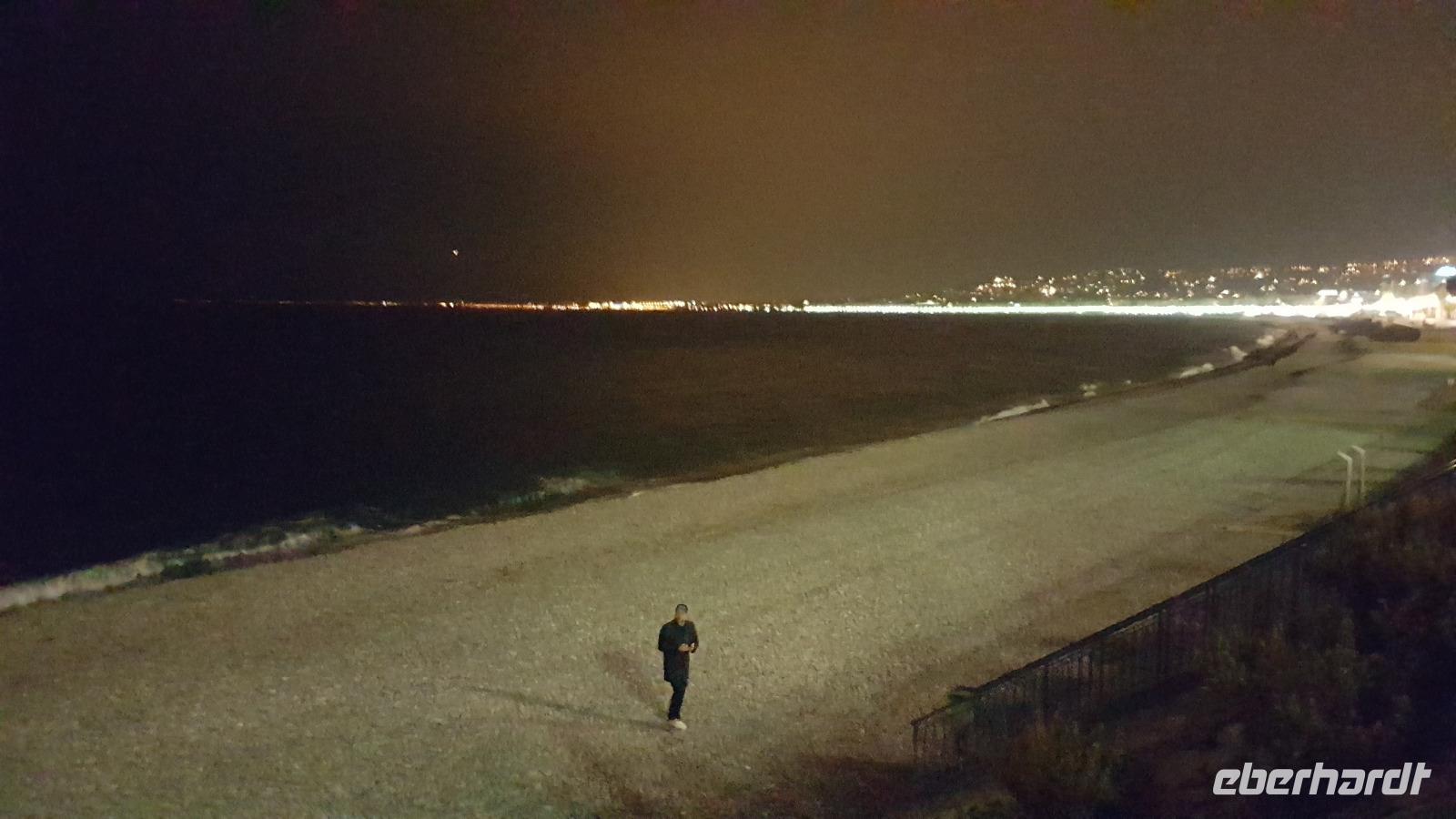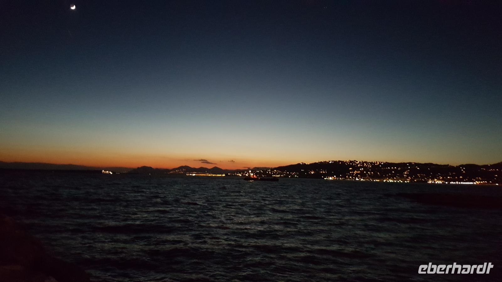 Am Abend genossen einige von uns noch ein Abendessen in einer typisch nizzaischen Brasserie. Das heutige Abendessen liegt in der Nähe vom Hotel und wir trafen uns um kurz vor 20 Uhr, um zu Fuß bis zum „L´Authentic" Restaurant zu spazieren. Das Menü war lecker und während des Essens haben wir versucht uns alle einmal kurz vorzustellen, damit wir uns langsam kennen lernen und wissen, wie wir heißen oder woher wir kommen. Auf dem Rückweg zum Hotel machten wir einen Spaziergang bis ans Meer und zur Promenade, um das Mittelmeer zu genießen. Wir wollten das Meer sehen und entlang der „Promenade des Anglais" schlendern. Wir genossen einen herrlichen Sonnenuntergang. Ich zeigte einigen Gästen, wo ein Supermarkt bis 22 Uhr geöffnet hat, falls man Wasser oder Obst besorgen möchte. Schon im Hotel wünschten wir uns allen eine gute erste Nacht.
