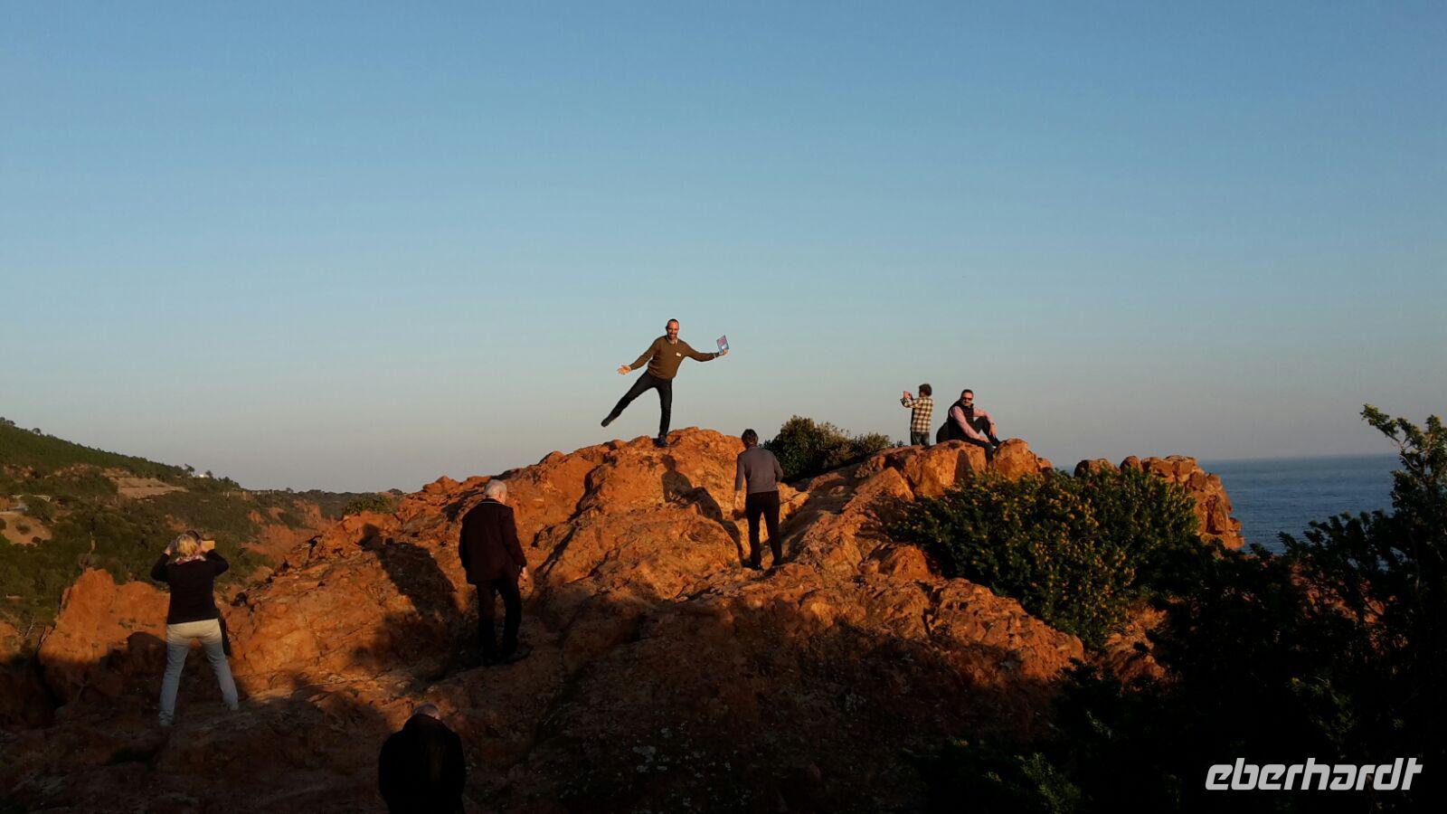 Richard machte wieder ein tollen Foto-Stopp auf dem Weg, direkt am Meer und mit einer eindrucksvollen steilen Küste des Esterelgebirges. Weiter entlang dieser Küstenstraße und des Esterelgebirges mit seinem eindrucksvollen rötlichen Felsen ging die Reise zurück nach Nizza, wo wir schon um 18 Uhr im Hotel waren und danach trafen wir uns wie immer zum Abendessen. Heute nicht so weit entfernt vom Hotel. Anschließend trafen wir uns in der Mini-Bar mit Lounge vom Hotel, um den Tag ausklingen zu lassen.