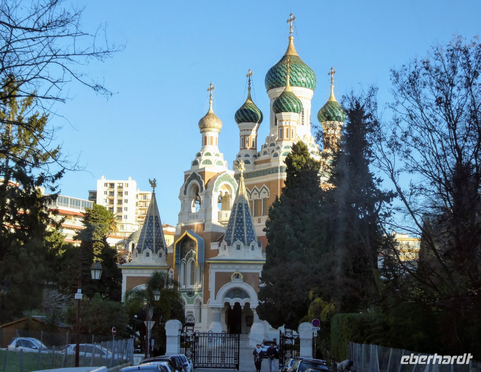 Wir starten unsere Rundfahrt in wohl einem der vornehmsten Viertel von Nizza in Cimiez, welches etwas erhöht auf einem Hügel liegt. Dort sind die Häuser der alteingesessenen und wohlhabenden Familien Nizzas. Auf dem Weg dorthin streifen wie die russisch-orthodoxe Kirche die majestätischen mit ihren vergoldeten Kuppeln grüßt. Bei dem traditionsreichen Hotel "Regina", welches schon im 19.Jahrhundert, also als der Tourismus an der Küste gerade einmal begann, seine Pforten eröffnete, steigen wir aus. Wie uns Richard erzählt, hatte man das Meer damals noch nicht entdeckt und man zog sich eher auf die Anhöhen zurück. Queen Victoria bewohnte hier im Hotel wohl eine ganze Etage.