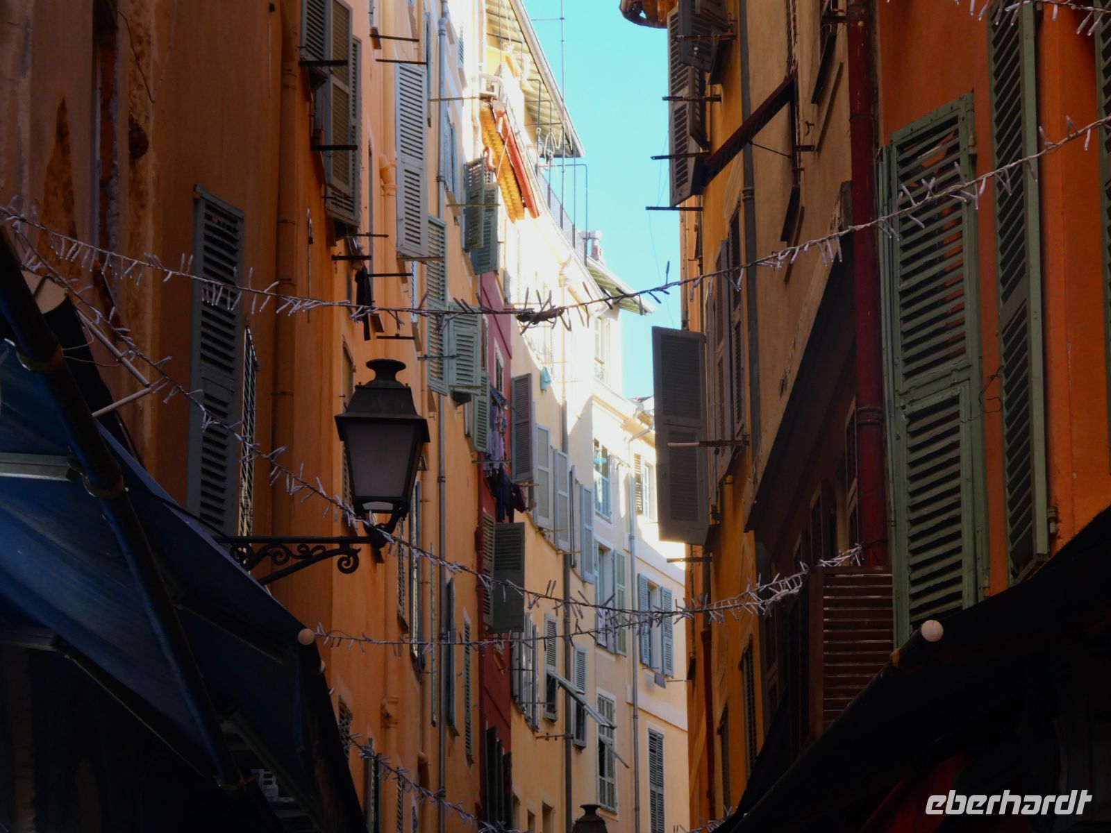 Danach geht es in die Altstadt von Nizza, wo die Gassen eng sind und wenig Sonnenstrahlen in die Stadt lassen. Im Sommer angenehm, heute ein wenig frisch. Wir bummeln durch die Gassen und bekommen so manch interessantes Detail erklärt. Auch erhalten wir einen kleinen Einblick in die Spezialitäten von Nizza, wie z.B. Socca, eine Art Pizza aus Kichererbsenmehl.