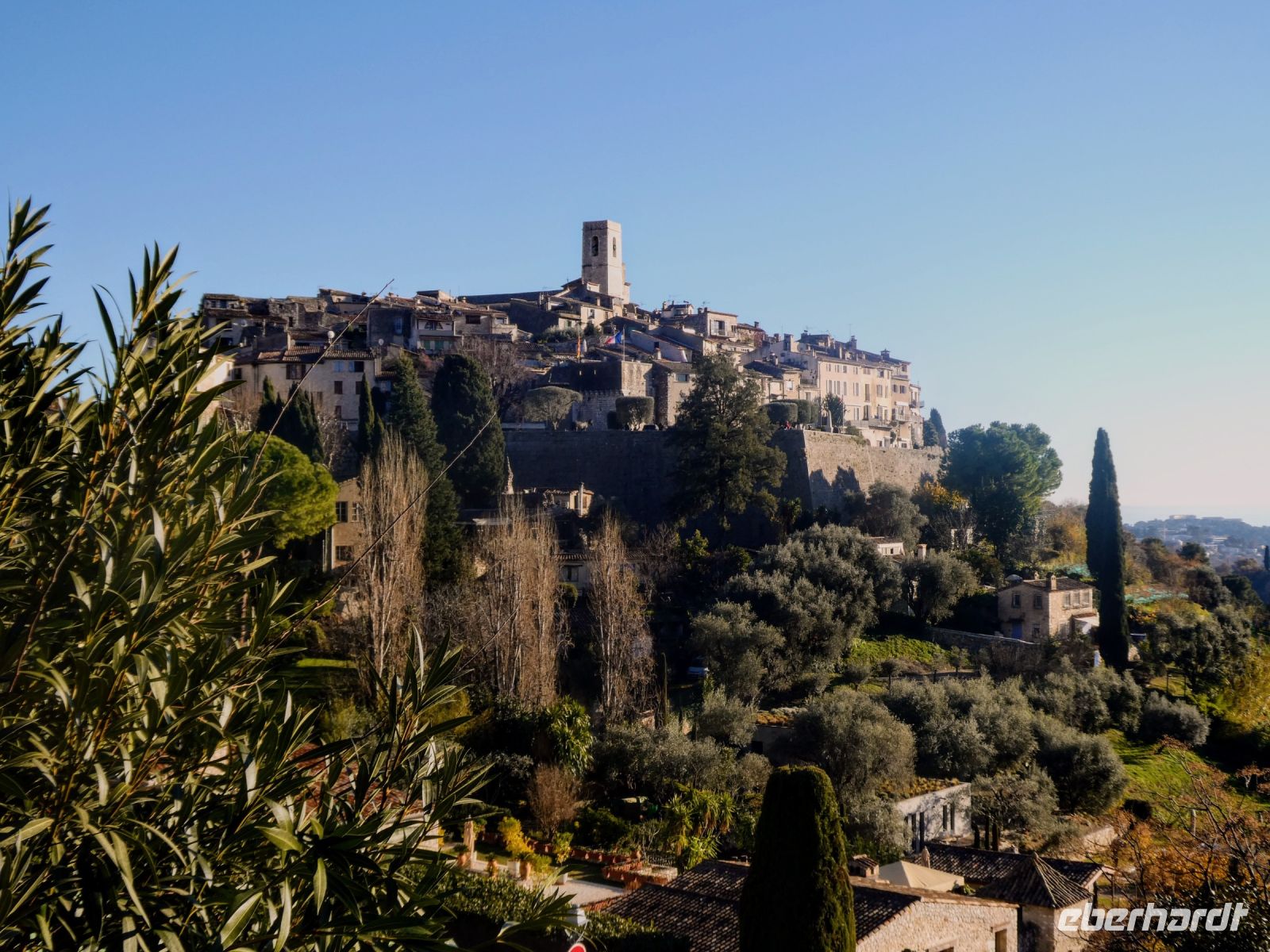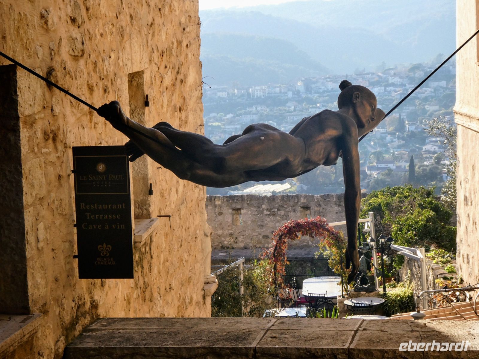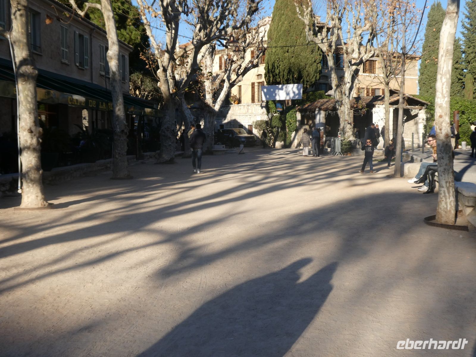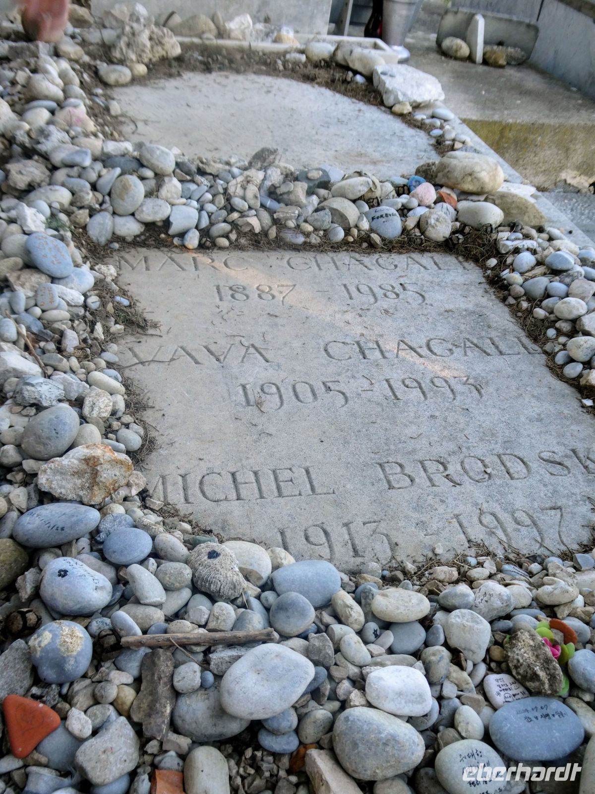 Vom Parkplatz der etwas außerhalb des Ortes liegt schlendern wir am berühmten Restaurant La Colombe d'Or vorbei. In dem Restaurant trafen sich viele Künstler und Leinwandstars. Ebefalls der Bouleplatz hat eine gewisse Bekanntheit durch Lino Ventura und Ives Montant die hier diesem Sport nachgingen, der hier Petanque heißt. Es liegen zahlreiche Restaurants nebenan. Wir betreten den Ort durch die Stadtmauer den Ort der hauptsächlich durch seine Kunstschaffenden bekannt wurde, allen voran Marc Chagall, der hier lebte und auch auf dem Friedhof begraben ist. Wir spazieren durch die engen Gassen entlang zahlreicher Galerien, die auf Käufer hoffen bis zum Aussichtspunkt an dessen Ende sich der alte Friedhof befindet. Das Grab ist unsschwer zu erkennen, da es aufgrund der Religionszugehörigkeit Chagalls eine üppige Steinsammlung aufweist und auf Blumenschmuck verzichtet wird. Wir denken an das Werk des Künstlers und an seine fantastischen Glasfenster die zahlreiche Kathedralen Europas zieren. Seine farbenfrohen Bilder hat fast jeder vor Augen.