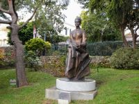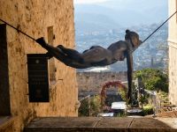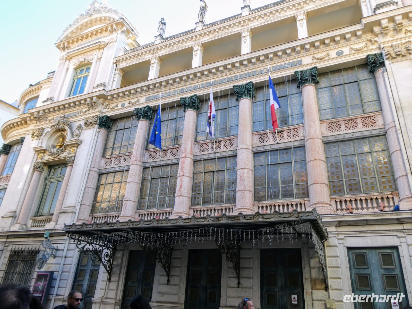 Anschließend spazieren wir gemeinsam entlang der Strandpromenade vorbei am Opernhaus, welches seine Hauptfassade auch vom Meer abgewandt zur Stadtseite hat. Allerdings grüßt auf der Rückseite eine kleine Kopie der Freiheitsstatue zur Erinnerung an ihren Erschaffer. In Frankreich gibt es einige davon in verschiedenen Größen. An der Promenade können wir zeitgenössische Kunst betrachten und viel Volk tummelt sich hier. Am Place Massena mit dem Brunnen "Fontaine du Soleil" mit einer Apollo-Statue besteigen wir schließlich wieder unseren Bus um nach St.Paul de Vence zu fahren.