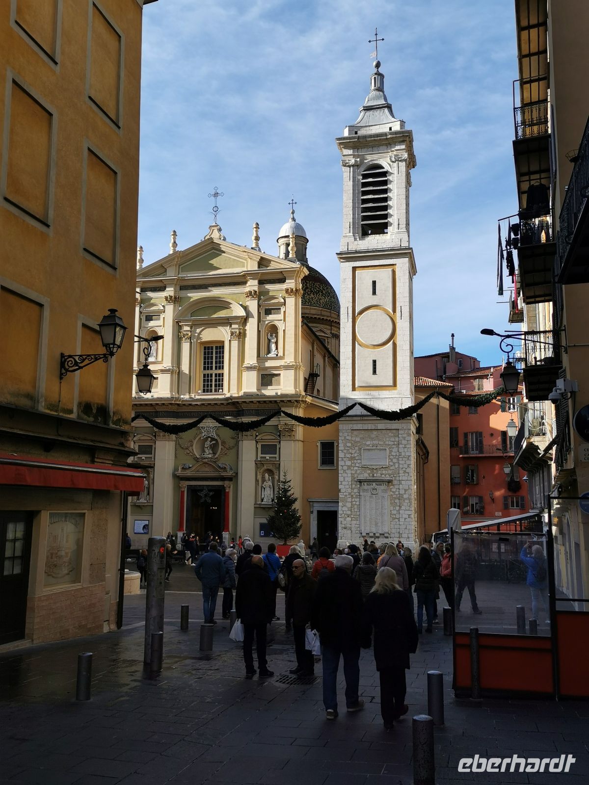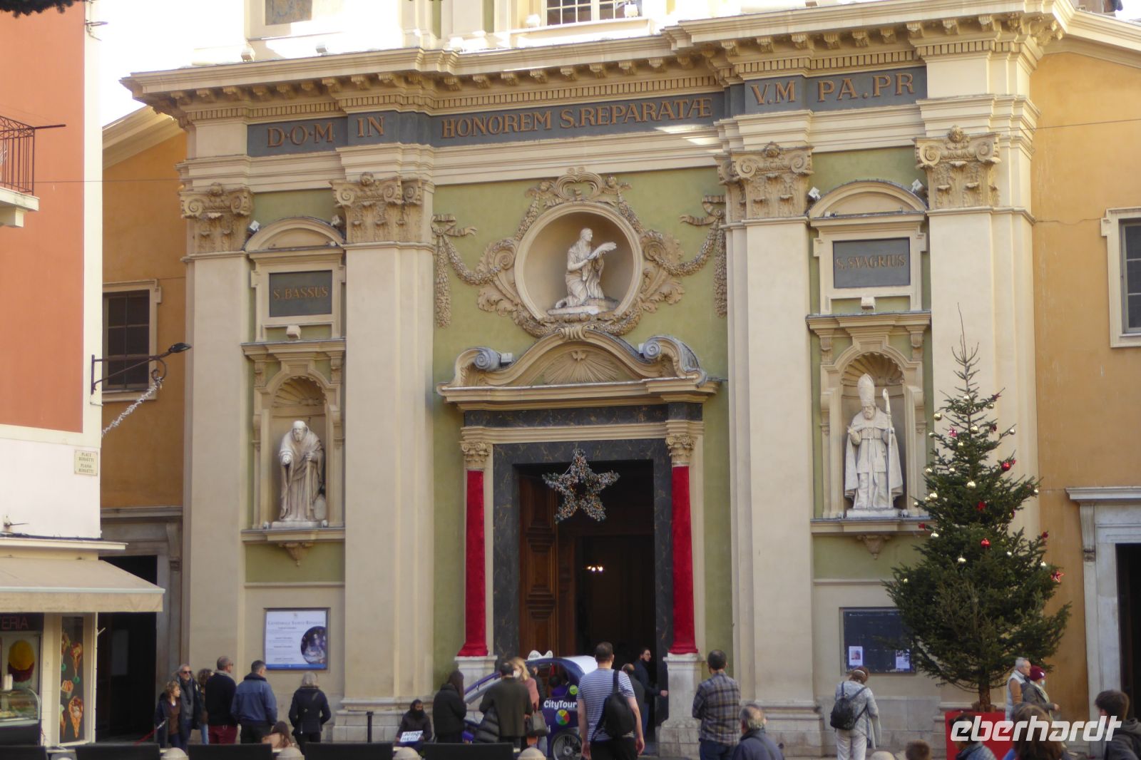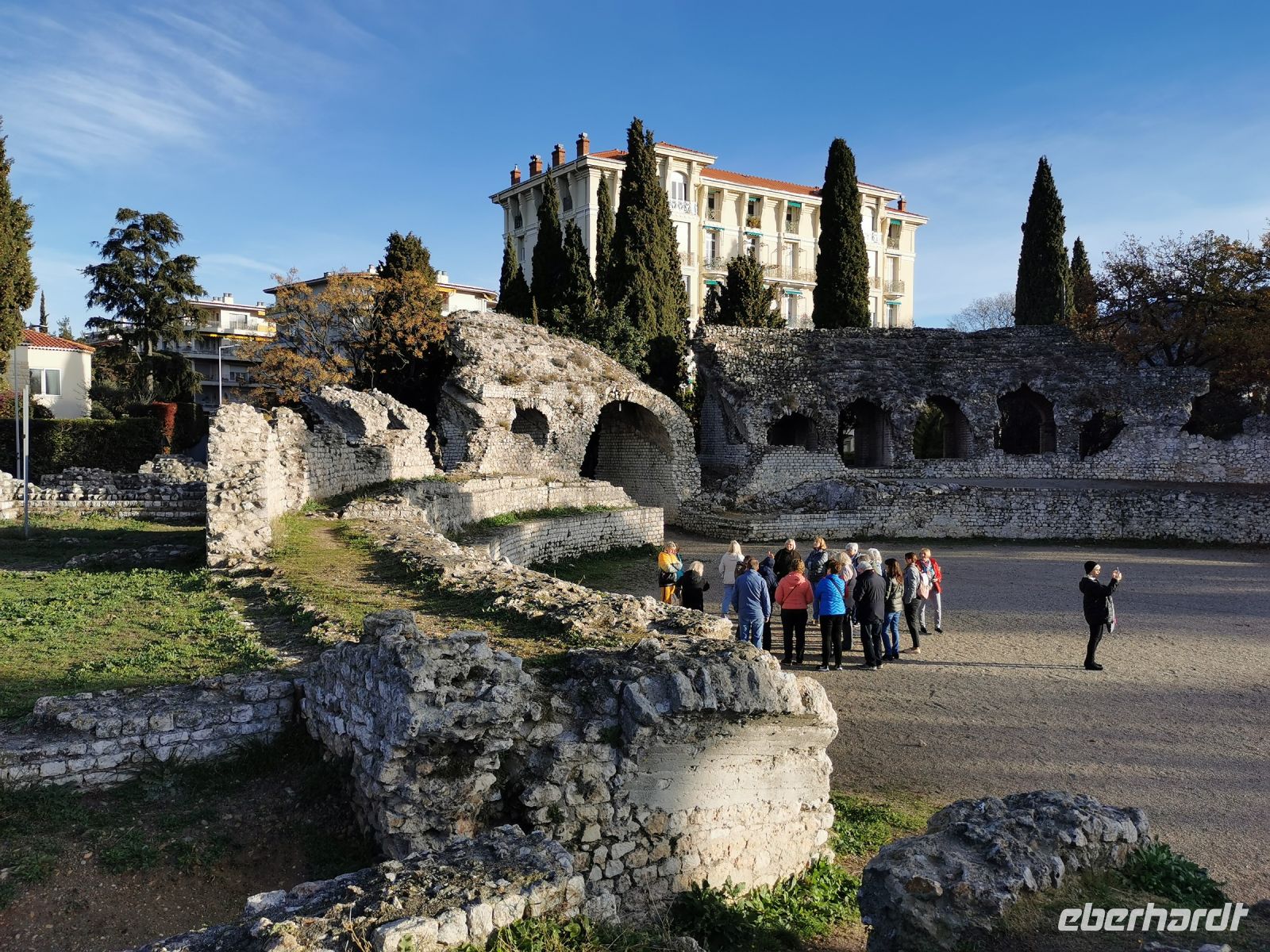 Die Rückfahrt entlang der Küste führte uns durch den noblen Küstenort Sainte Maxime, der mit die exklusivsten Wohnlagen an der Mittelmeerküste zu bieten hat. Das Königshaus von Schweden besitzt hier eine der herrschaftlichen Strandvillen. Schnell erreichten wir Fréjus, die Stadt, die ihren Namen von Gaius Julius Caesar höchst persönlich erhalten hat: aus Forum Julii wurde mit der Zeit Fréjus. Aus der römischen Zeit sind bis heute ein Amphitheater, die Reste eines Aquädukt, der Leuchtturm und die Thermenanlagen erhalten. Vom Bus aus konnten wir einen kurzen Blick auf die Ausgrabungen werfen und uns so die Größe der antiken Stadt vorstellen. Heute ist die Stadt klassifiziert als Stadt der Kunst und der Geschichte. Unser Weg führte uns ins historische Zentrum zum mittelalterlichen Kathedralbezirk mit der romanischen Kathedrale St. Léonce und dem vorromanischen Baptisterium aus dem fünften Jahrhundert. Nach der Besichtigung zog es uns schnell weiter in die stillen Gassen, denn der ganze Platz vor der Kathedrale wurde von weihnachtlichen Evergreens beschallt.