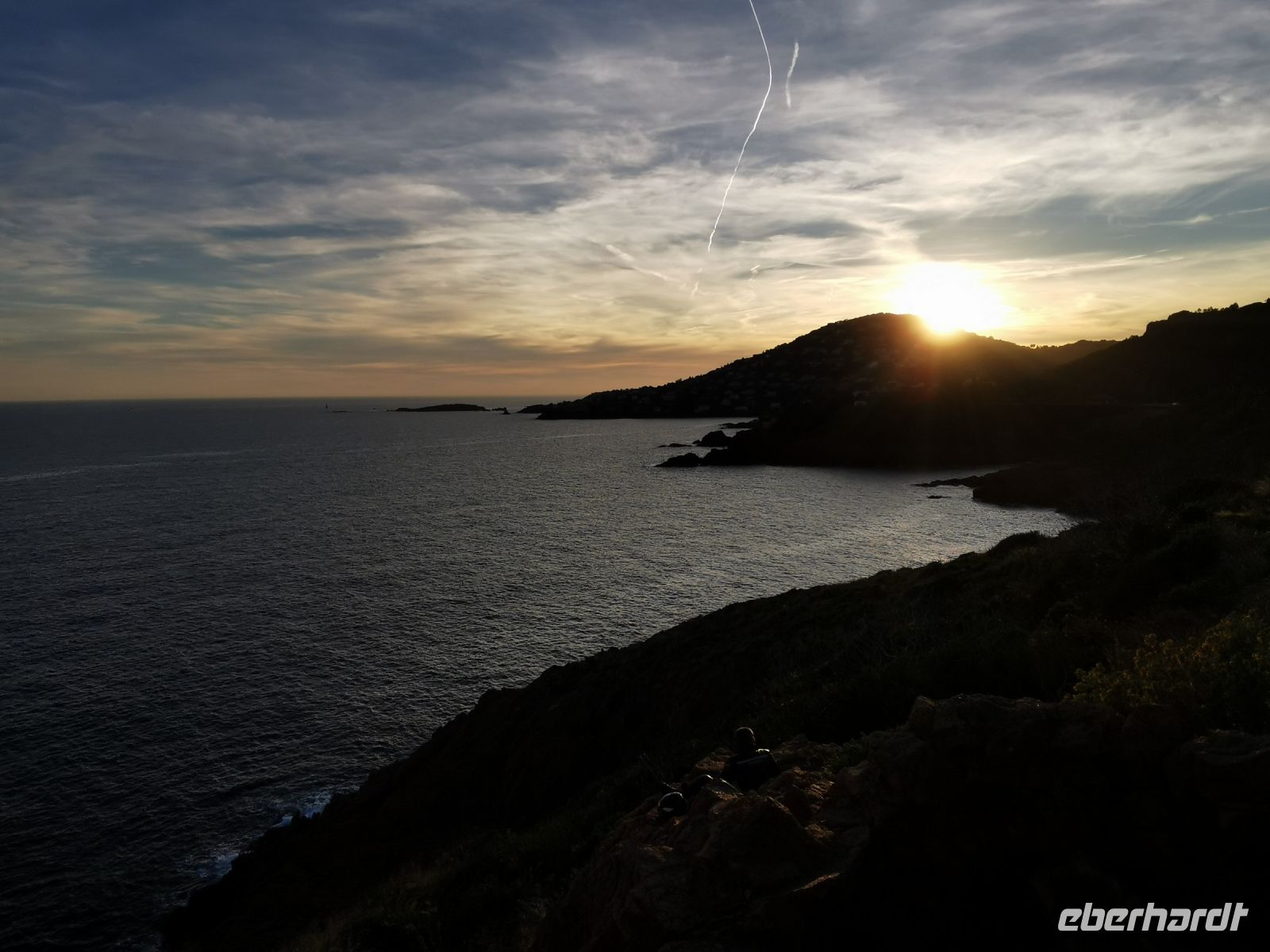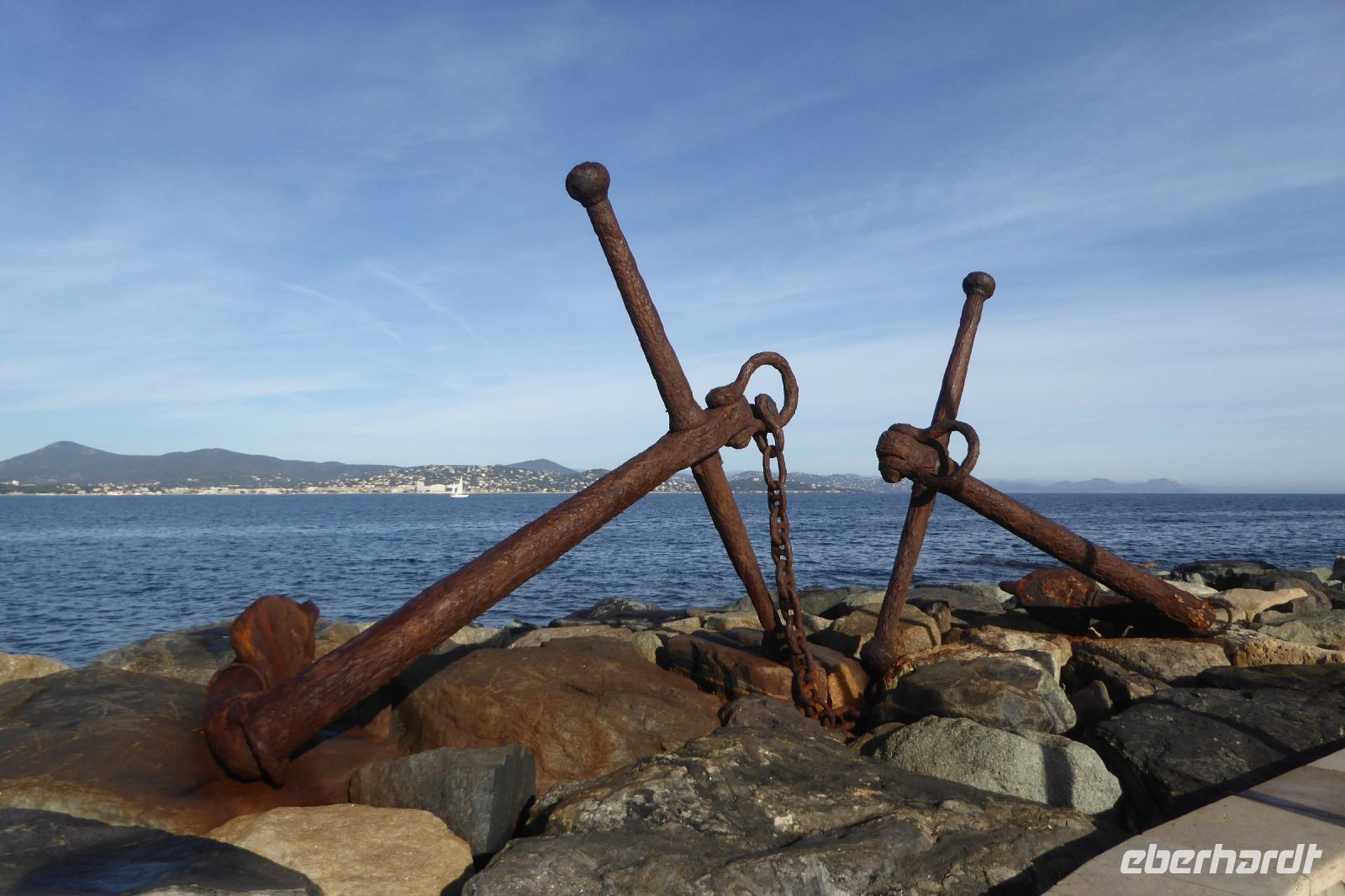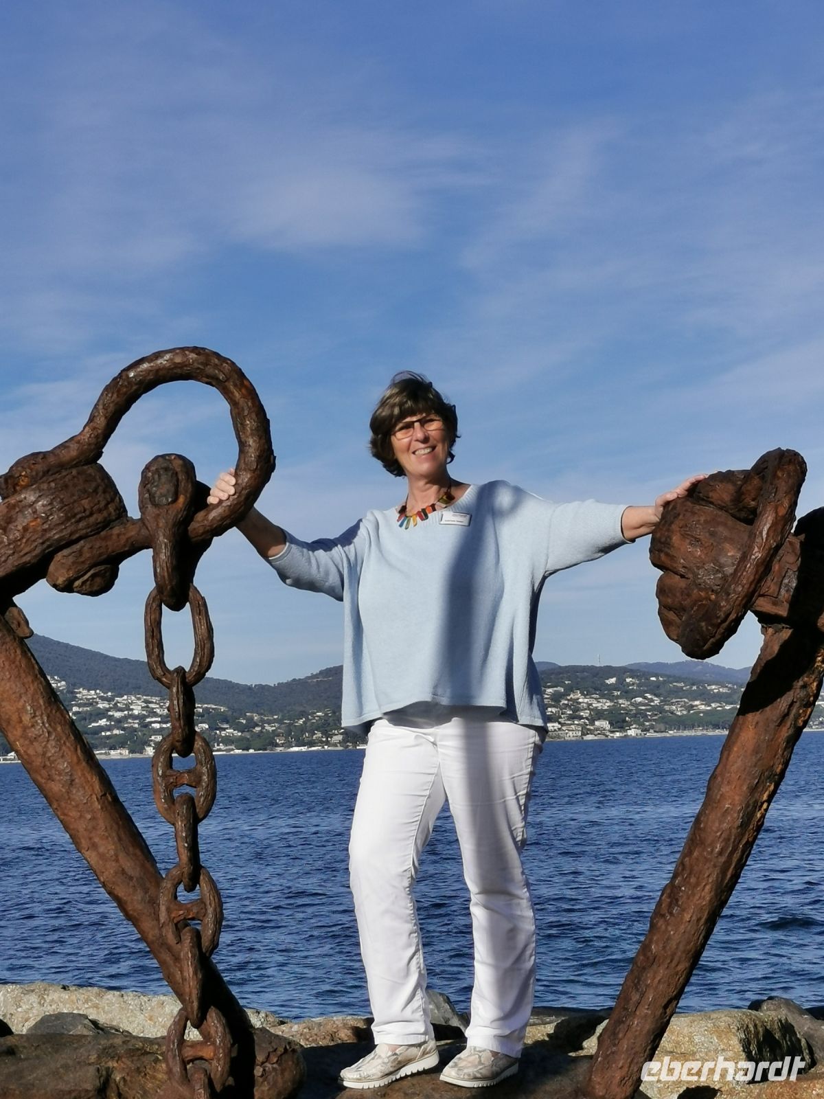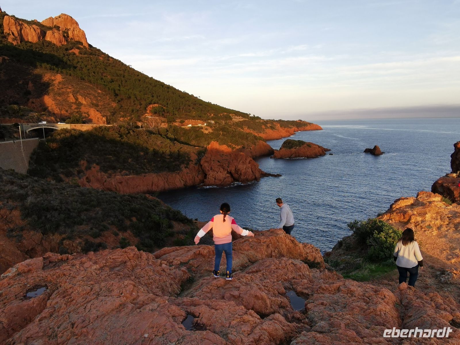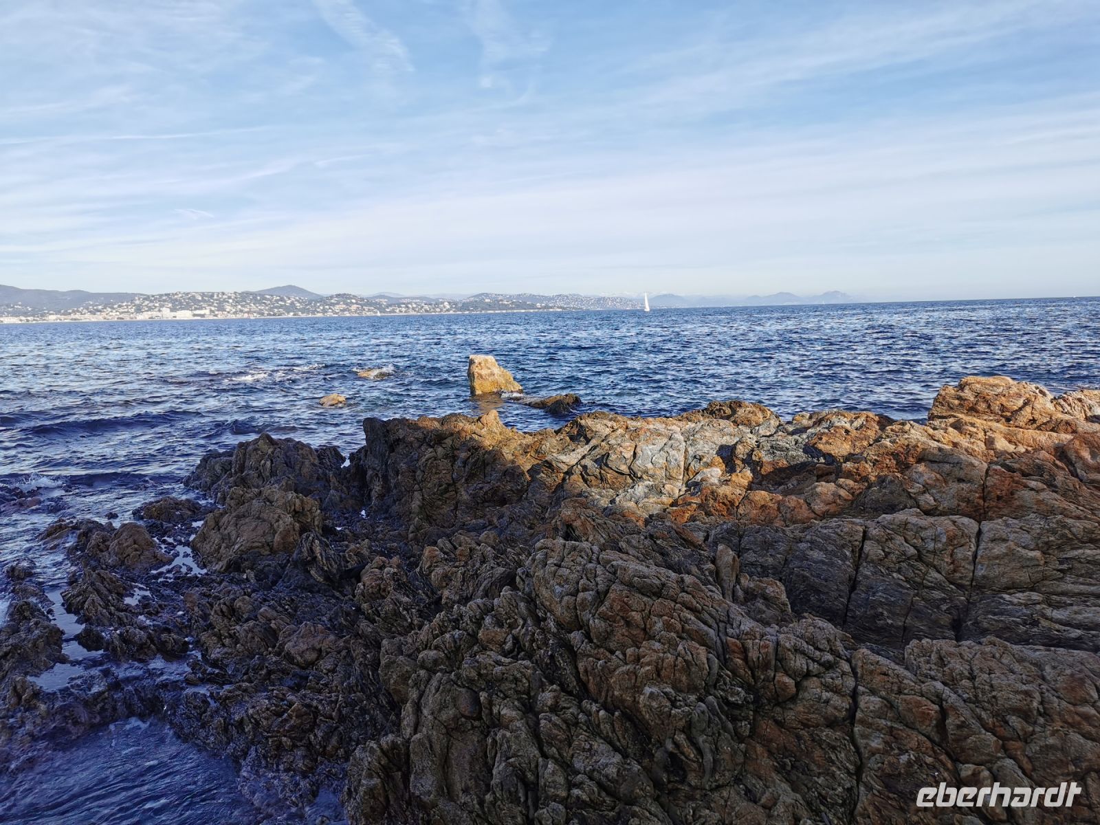 Kurvenreich schlängelt sich die schmale Straße entlang der felsigen Küste, vorbei an Saint-Raphaël, mit seiner schönen Strandpromenade, auf der bunte Menschenscharen die Nachmittagssonne genossen. Immer wieder hatten wir herrliche Aussichten auf Yachthäfen, Strände und Buchten, Villen und Feriendomizile sowie auf die dem Land vorgelagerten kleinen Inseln. Die Fahrt durch malerische Landschaft führte uns weiter zum schönsten Küstengebirge, dem Estérel. Entstanden durch vulkanische Tätigkeit vor etwa 250 Mio Jahren, besteht das Massiv zum größten Teil aus Basalt und Rhyolithen, denen das Gestein seine eigentümliche rote Farbe verdankt. Silbern blendet die Sonne über dem Meer. Nach einem nur kurzen Fotostopp fiel es uns allen schwer, wieder in den Bus zu steigen.