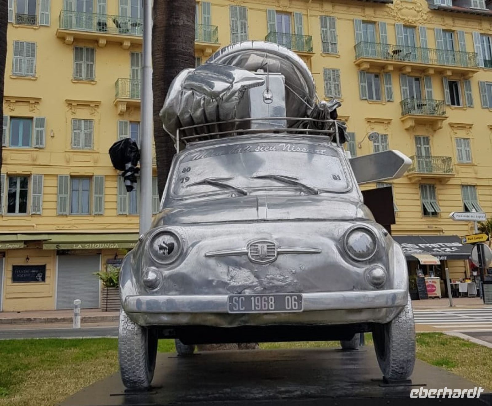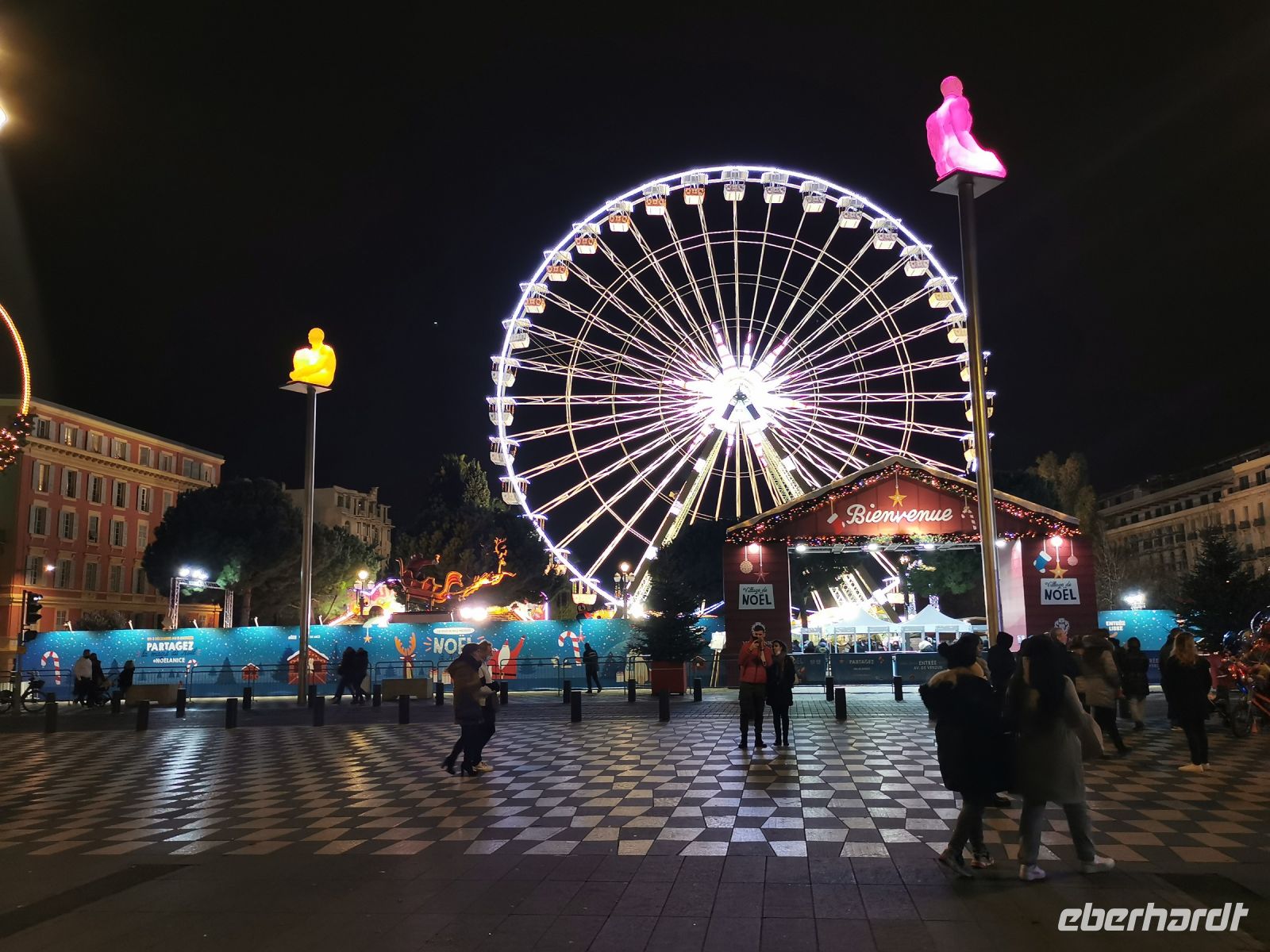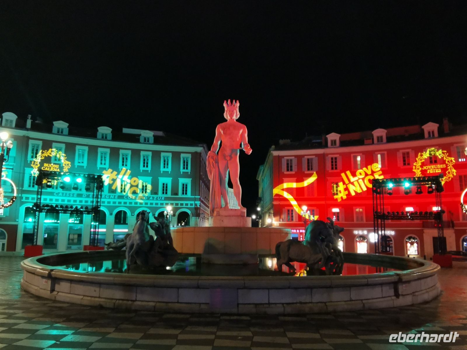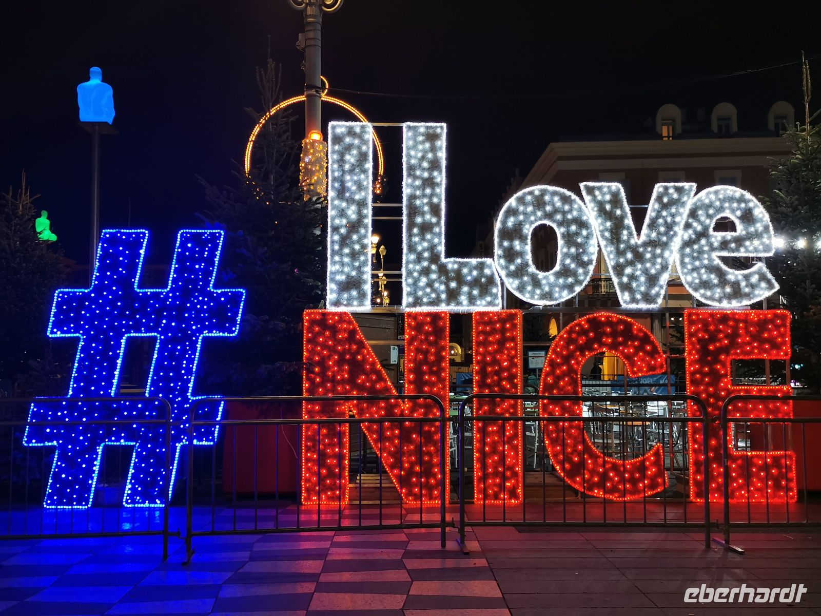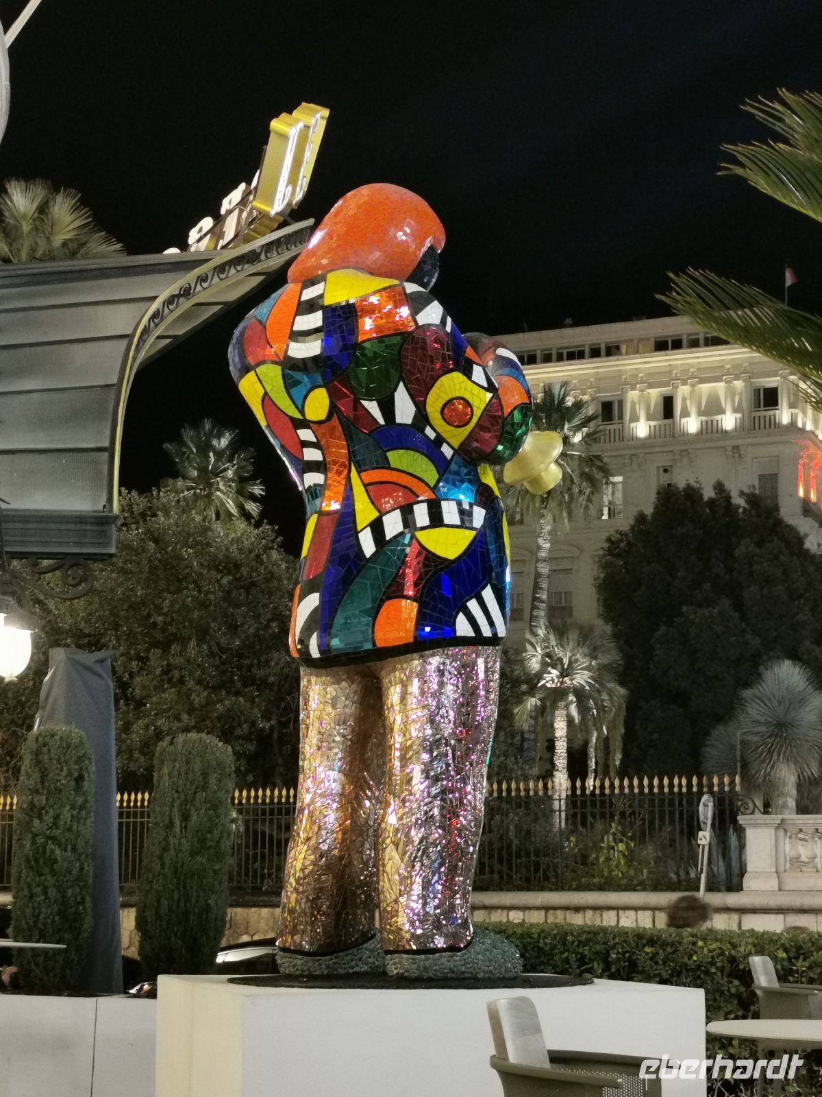 Vor dem Abendessen spazierten wir wieder über die Place Masséna. Hoch über unseren Köpfen schweben die bunten Figuren des spanischen Künstlers Jaume Plensa. Vorbei an der Fontaine du Soleil mit der farbig beleuchteten Apollo Statue bummelten wir durch die festlich beleuchtete Parkanlage bis zum Restaurant Le Gaglio am Rande der Altstadt, wo wir mit erlesenen Gaumenfreunden der Region verwöhnt wurden. Und auch nach diesem opulenten Mahl zog es uns wieder ans Meer zu einem kleinen Spaziergang an der Promenade des Anglais bis hin zum legendären Hotel Il Negresco, vor dem eine fröhlich bunte Statue der französischen Künstlerin Niki de Saint Phalle an den großen Musiker Miles Davis erinnert.