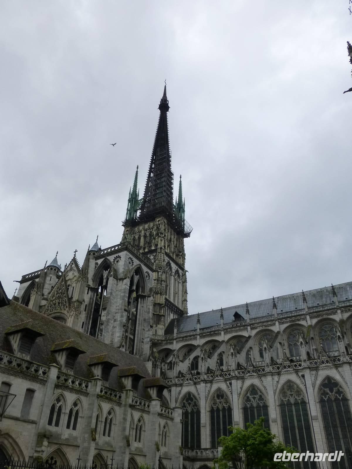 Gestärkt durch das Frühstücksbuffet starteten wir am heutigen Tag nach Rouen. In der Hauptstadt der Oberen Normandie unternahmen wir bei leichtem Regen einen Bummel durch die zauberhafte Altstadt. Rouen zählt durch die Vielzahl von Fachwerkhäusern zu den besuchenswertesten Städten der Normandie. Durch die Fußgängerzone vorbei an der Uhr Gros Horlorge erreichten wir den Alten Marktplatz. Auf diesem wurde am 30.05.1431 die Nationalheilige Frankreich, Jeanne d´Arc, verbrannt. An dieser Stelle befinden sich das Kreuz sowie die gleichnamige moderne Kirche. Anschließend spazierten wir an dem prächtigen Justizpalast vorbei Richtung dem St. Maclou Viertel. In diesem Stadtteil befinden sich noch heute die schönsten Fachwerkhäuser der Stadt. Im ehemaligen Pestfriedhof, dem Aitre St. Maclou ist heute die Schule der Schönen Künste untergebracht. Die Verzierungen an den ehemaligen Beinhäusern weisen auf die damalige Bedeutung dieses Ortes hin.