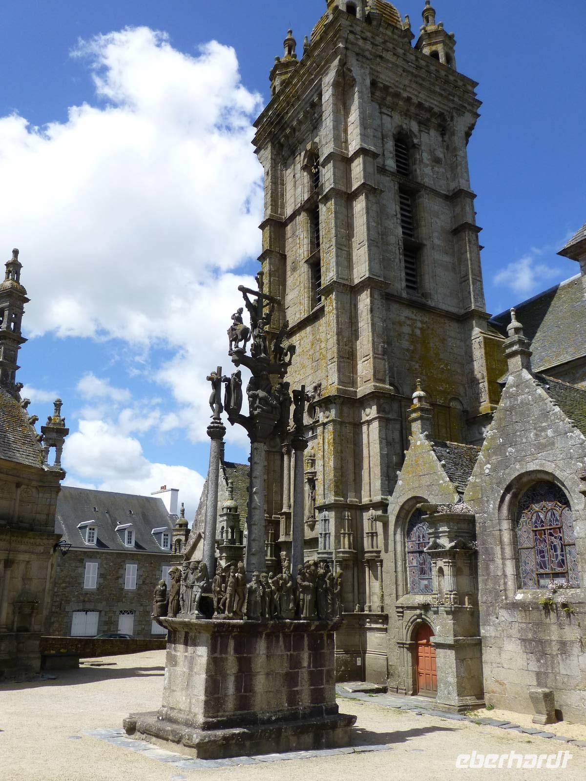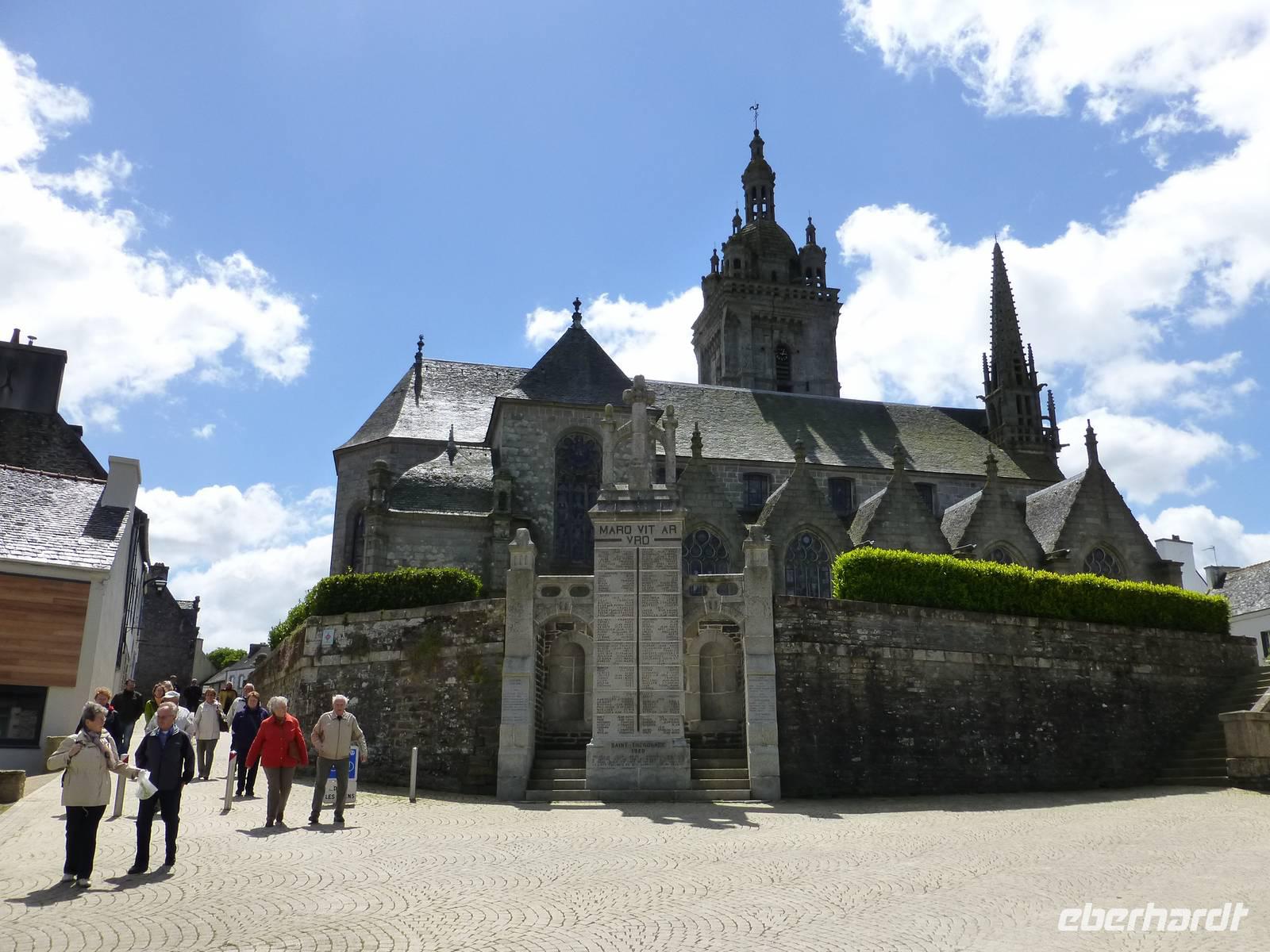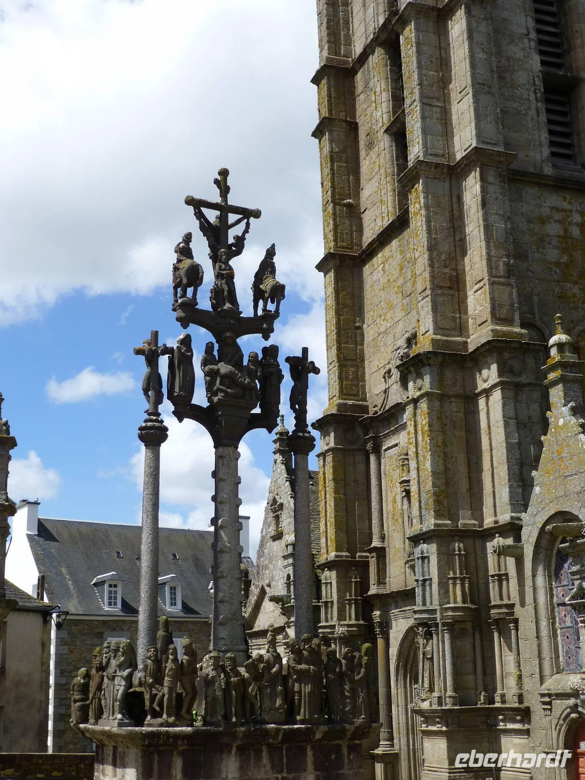 Unsere Weiterfahrt führte uns zu einem der sog. Enclos paroissiaux (heiligen oder umfriedenten Pfarrbezirke), die zwischen 1450 und 1650 in der Bretagne entstanden sind. Sie sind eine kunsthistorische Eigenart der Bretagne und bestehen aus der Kirche, dem Beinhaus, Friedhof, Triumphtor und Kalvarienberg. Zwei von diesen umfriedeten Pfarrbezirken waren über Jahrzehnte hinweg Konkurrenten. So entstanden die schönsten Beispielte dieser bretonischen Kunst. Der erste Stopp war in St. Thegonnec. Nach einem Brand vor einigen Jahren wurde diese Kirche vollständig restauriert und erstrahlt wieder im alten Glanz. Beeindruckend waren die Schnitzkunst der Altäre sowie die Kanzel. Auch in Guimiliau konnten wir einen vollständigen Pfarrbezirk bewundern. Hier hatten wir die Möglichkeit noch einige Spezialitäten zu erwerben.