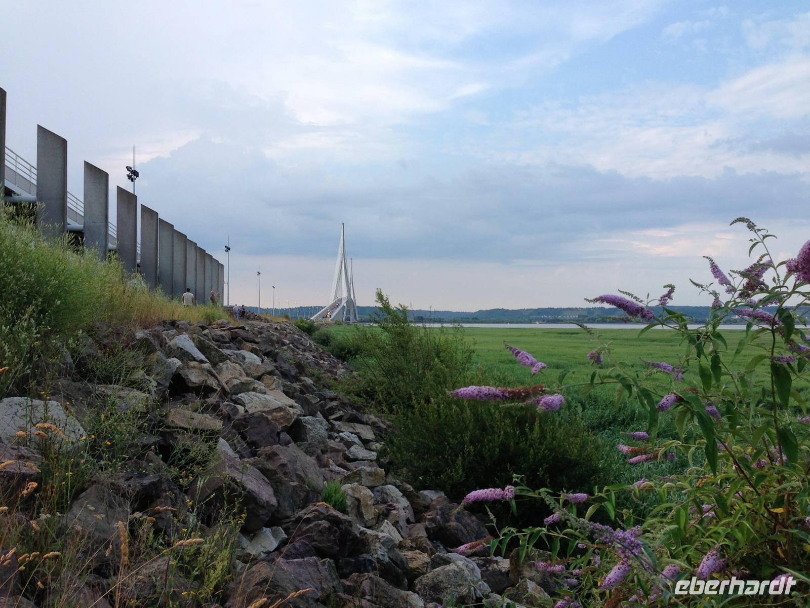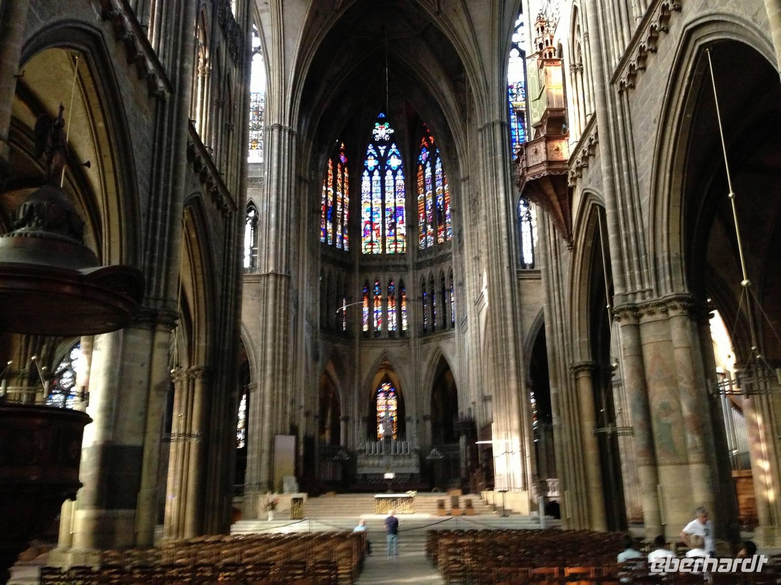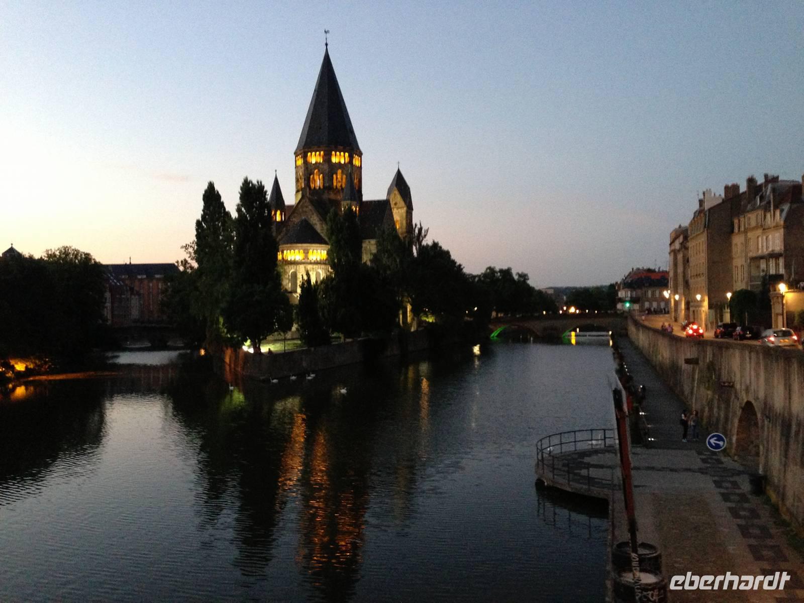 Ohne nennenswerte Verzögerung erreichen wir am frühen Abend Metz. Nach dem Abendessen machen wir einen ausgiebigen Spaziergang durch die quirlige Stadt. Die Bars und Restaurants sind gut besucht, der angenehme Sommerabend lockt in die Cafés unter den Laubengängen an der Place Saint Louis und auf die Place Saint Jaques. Wir umrunden die mächtige gotische Kathedrale und fachsimpeln über den Fortschritt der Restaurierungsarbeiten. Vorbei an der Markthalle führt der Weg hinunter zur Mosel, die in Frankreich natürlich Moselle heißt. Von der Brücke aus hat man einen schönen Blick auf das Theater, dann geht es weiter entlang der Kaimauer. Es wird bereits dunkel und wir bestaunen den stimmungsvoll angestrahlten „Temple Neuf", ein neoromanischer Bau nach Vorbild des Doms von Speyer, der wie ein Schiff mitten im Fluss liegt und ihn mit bugartiger Umfriedung teilt. Im katholischen Frankreich sind die „Temple" genannten protestantischen Kirchen eine Ausnahme.