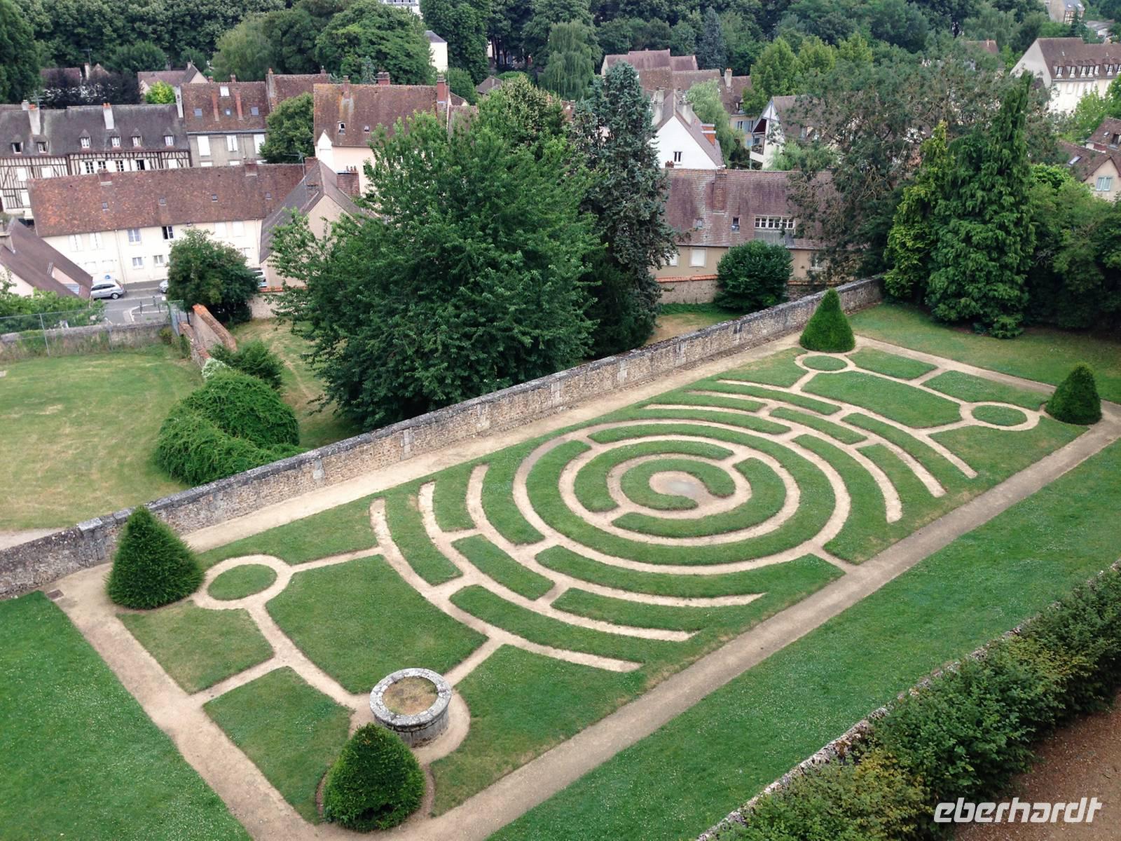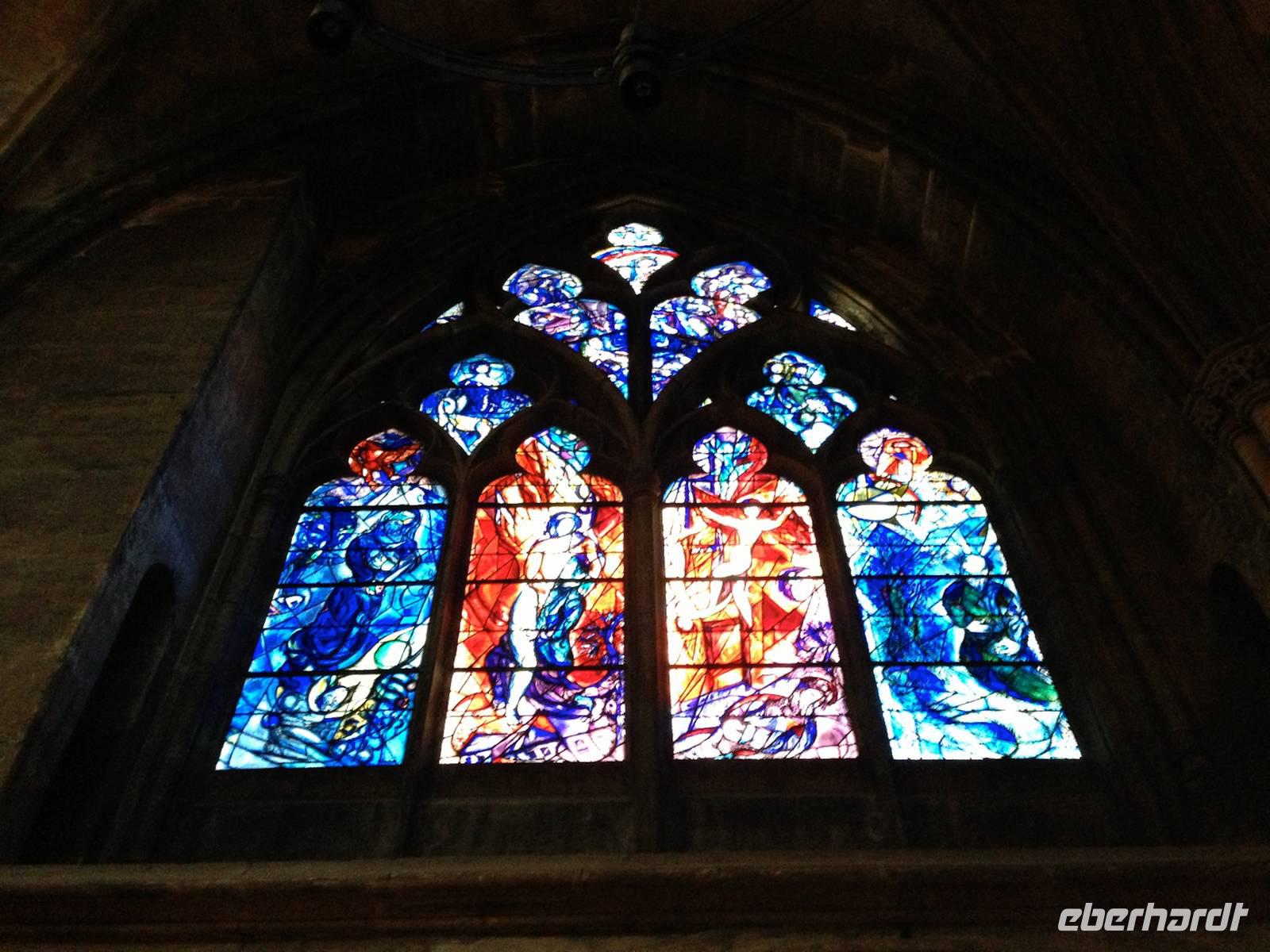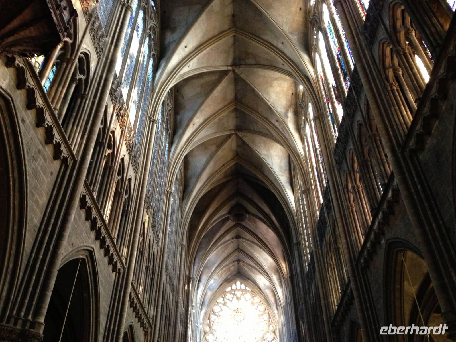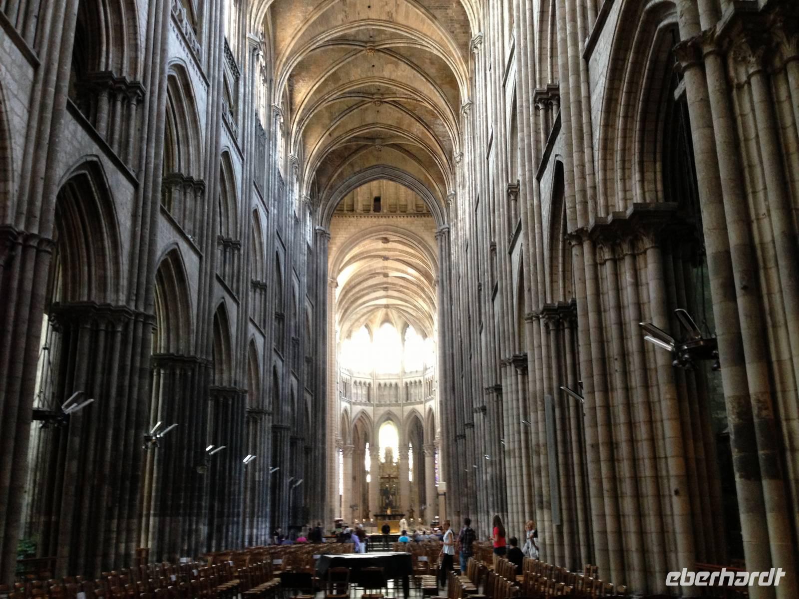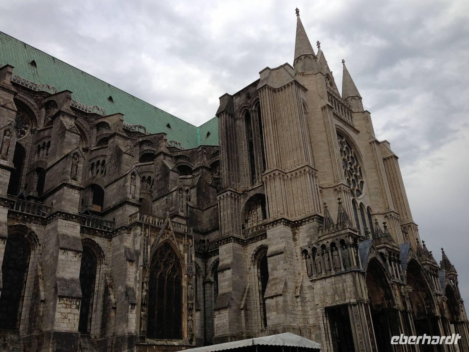 In Chartres strömen alle natürlich zunächst zur weltberühmte Kathedrale, wo gerade eine Trauung stattfindet, welche dem imposanten Raumeindruck eine feierliche Note hinzufügt. Fast zweihundert Fenster (2600 Quadratmeter!) schaffen mit unzähligen bleiverglasten Scheiben in dem berühmten Blau von Chartres. Die grandiose gotische Kathedrale, wurde Musterbeispiel für viele andere Kathedralbauten dieses Baustils. Wir stehen staunend vor dem dreitorigen Königsportal und bewundern die vollständig erhaltene romanisch-frühgotische Bildhauerkunst, die der Zerstörungswut der Französischen Revolution ebenso entgehen konnte wie die gesamte Kathedrale den zahleichen Kriegen im Laufe der Jahrhunderte.