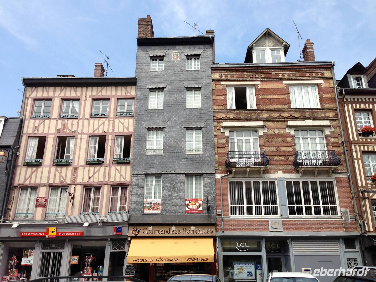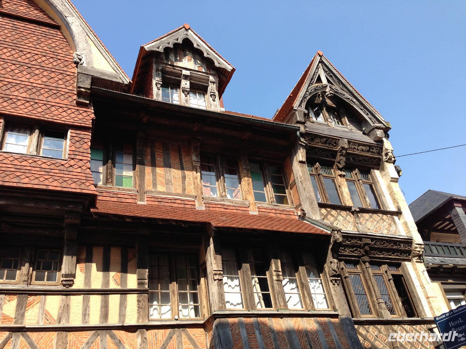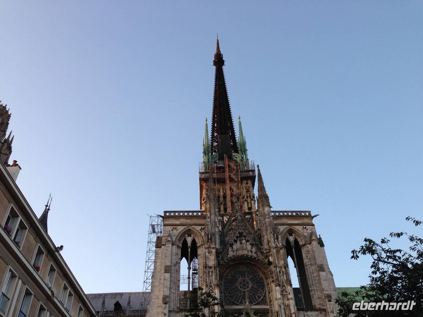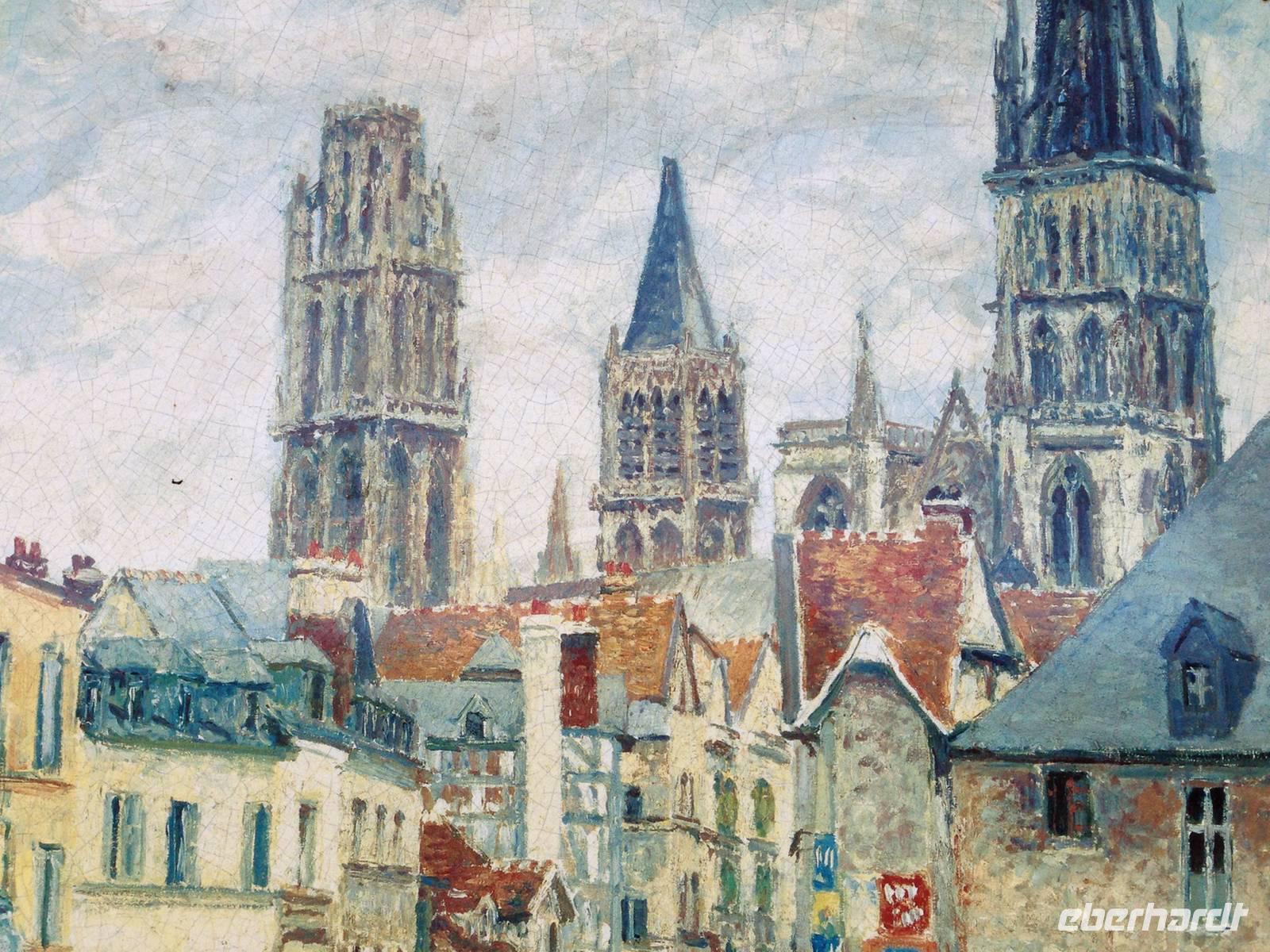 Vor der Kathedrale empfängt uns die örtliche Reiseleiterin , eine „echte Normannin", zur Stadtführung. Sie zeigt uns das schöne Renaissancehaus gegenüber der Kathedrale: Dort, genauer gesagt in einem Raum im zweiten Obergeschoss, sind die berühmten Gemälde entstanden, die wegbereitend für den Impressionismus waren und -ganz pragmatisch gesehen- einen immer gültigen Wetterbericht für die Normandie liefern: Das Wetter ist schön - mehrmals am Tag! (Der Satz gilt für unsere Reise nur eingeschränkt, denn wir sind mitten in eine außergewöhnliche Hitzewelle geraten und erleben Temperaturen, die sonst ehr in der Provence herrschen!)
