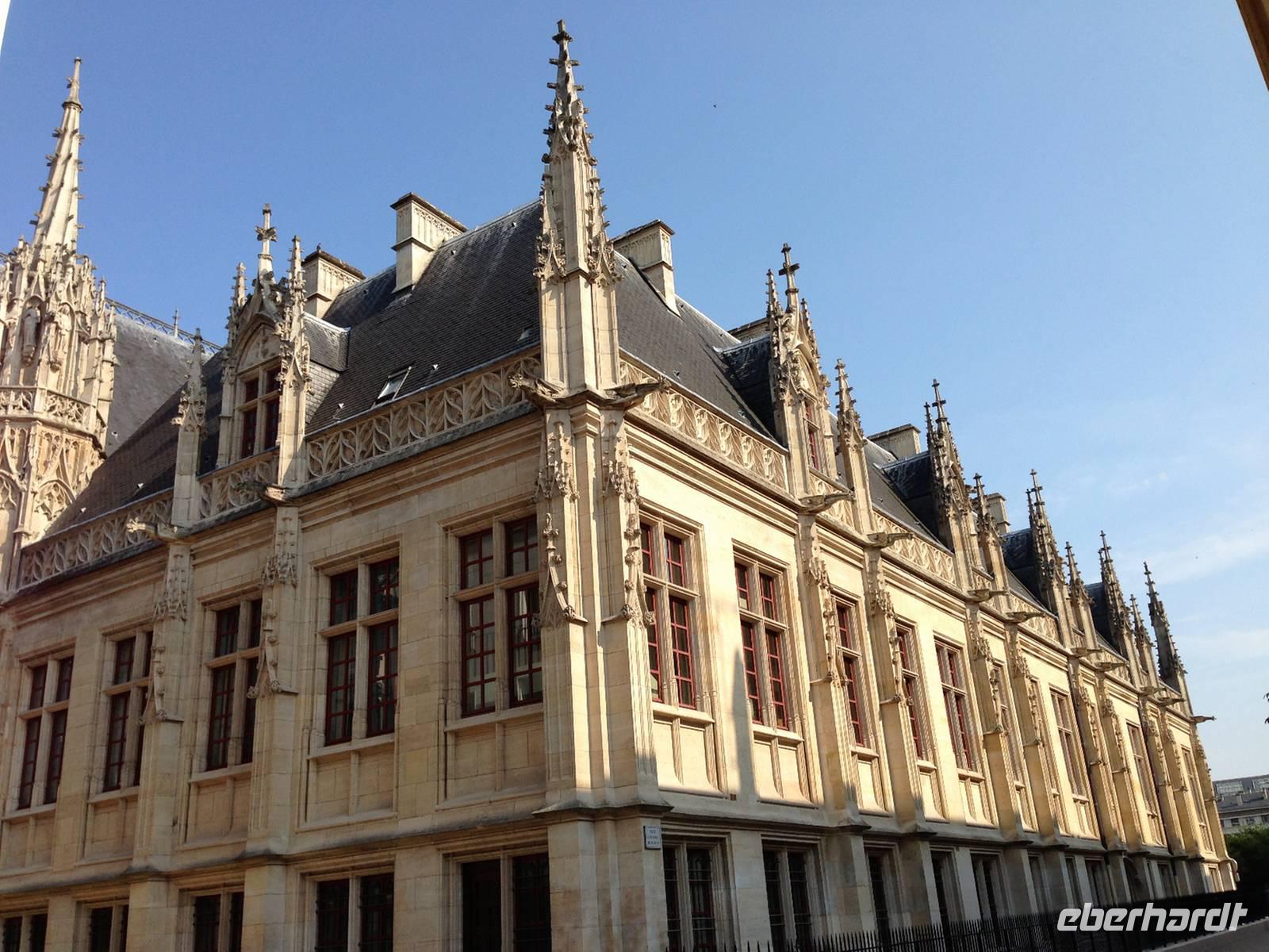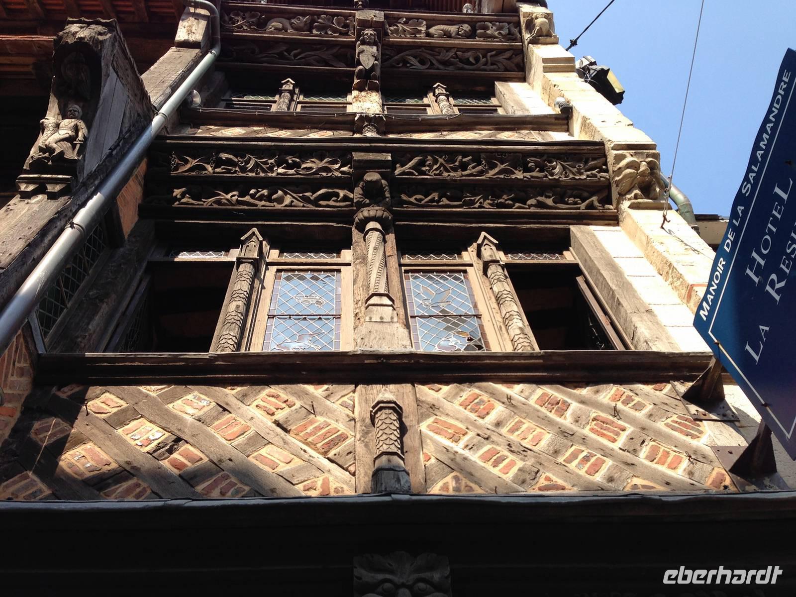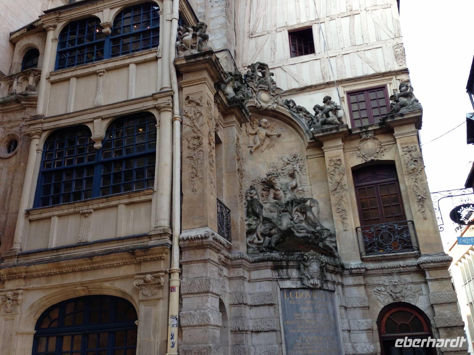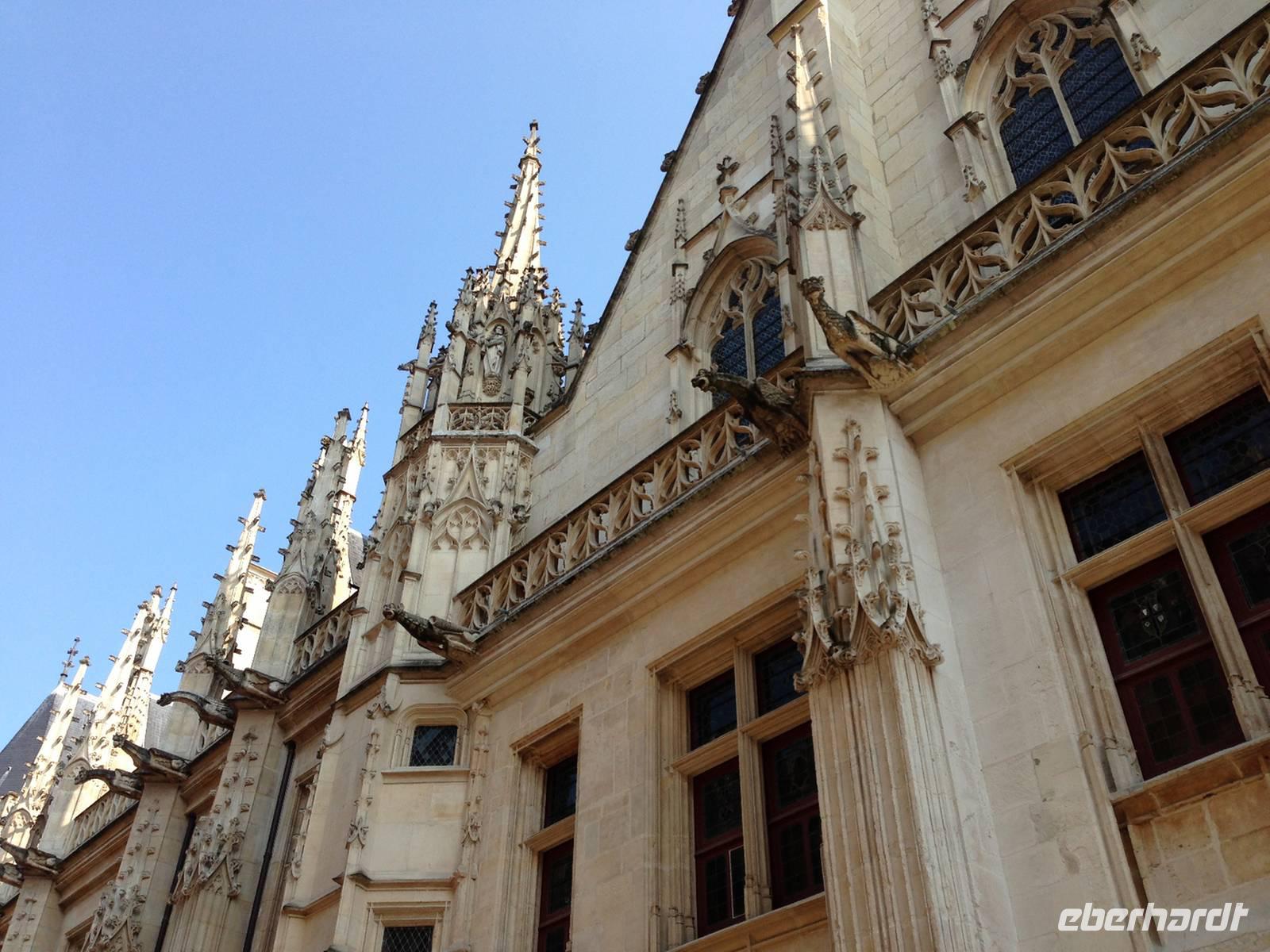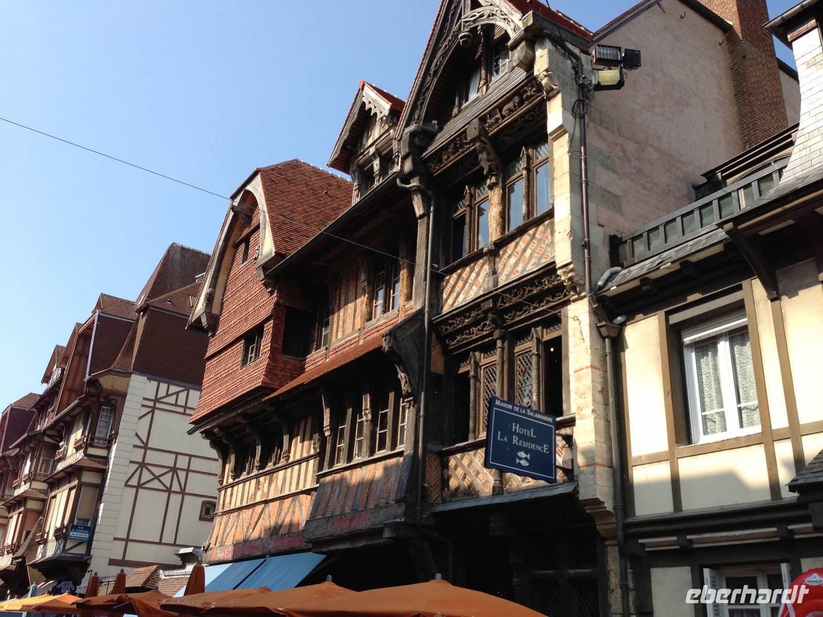 Vor der Kathedrale empfängt uns die örtliche Reiseleiterin , eine „echte Normannin", zur Stadtführung. Sie zeigt uns das schöne Renaissancehaus gegenüber der Kathedrale: Dort, genauer gesagt in einem Raum im zweiten Obergeschoss, sind die berühmten Gemälde entstanden, die wegbereitend für den Impressionismus waren und -ganz pragmatisch gesehen- einen immer gültigen Wetterbericht für die Normandie liefern: Das Wetter ist schön - mehrmals am Tag! (Der Satz gilt für unsere Reise nur eingeschränkt, denn wir sind mitten in eine außergewöhnliche Hitzewelle geraten und erleben Temperaturen, die sonst ehr in der Provence herrschen!)