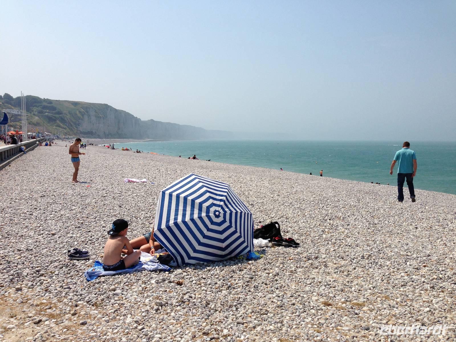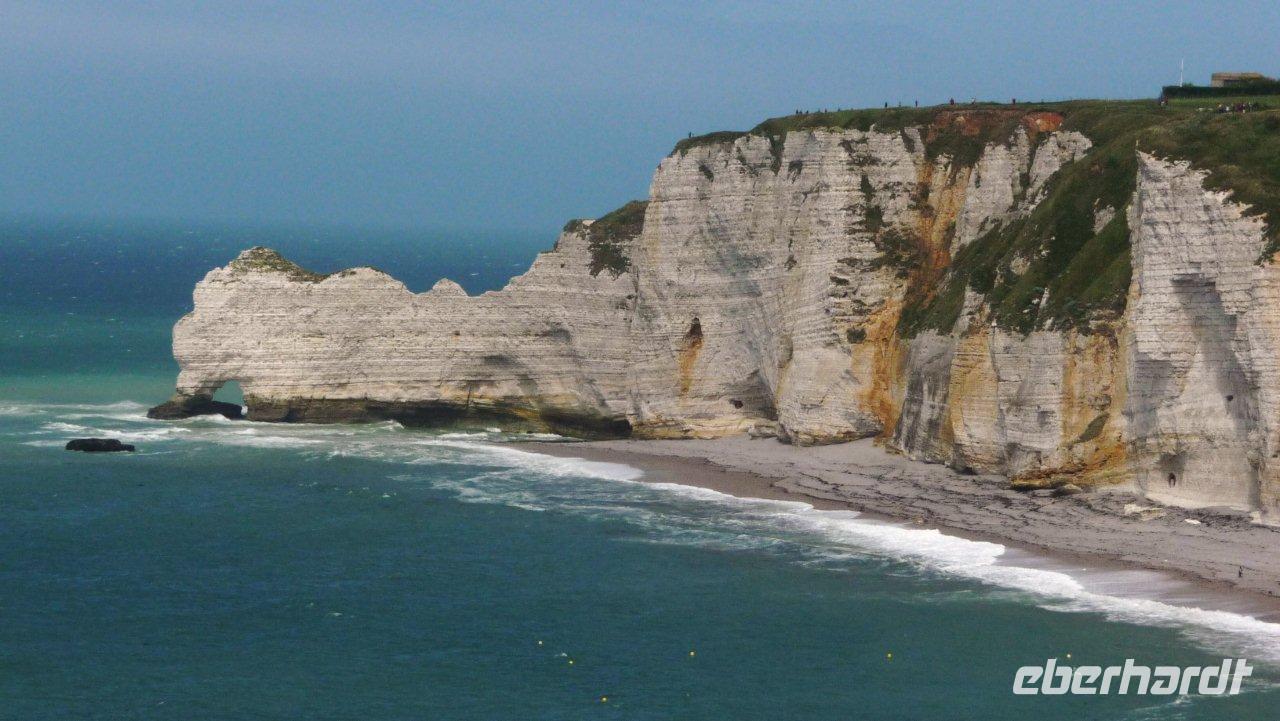 In Étretat genießen wir bei herrlichsten Sommerwetter entweder einen Spaziergang auf die hohen Klippen der Kreidefelsen oder wir nehmen ein erfrischendes Bad in den verlockenden Wellen des Ärmels - „La Manche", so heißt der Ärmelkanal kurz und bündig in Frankreich.