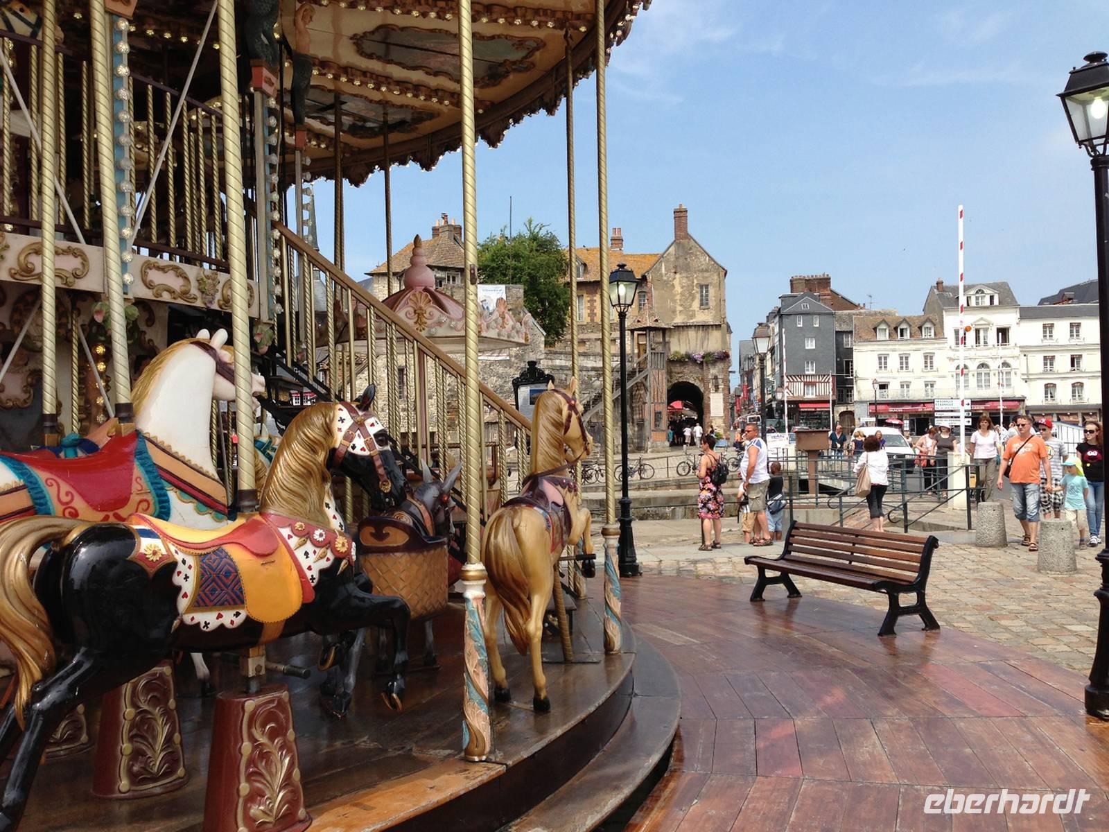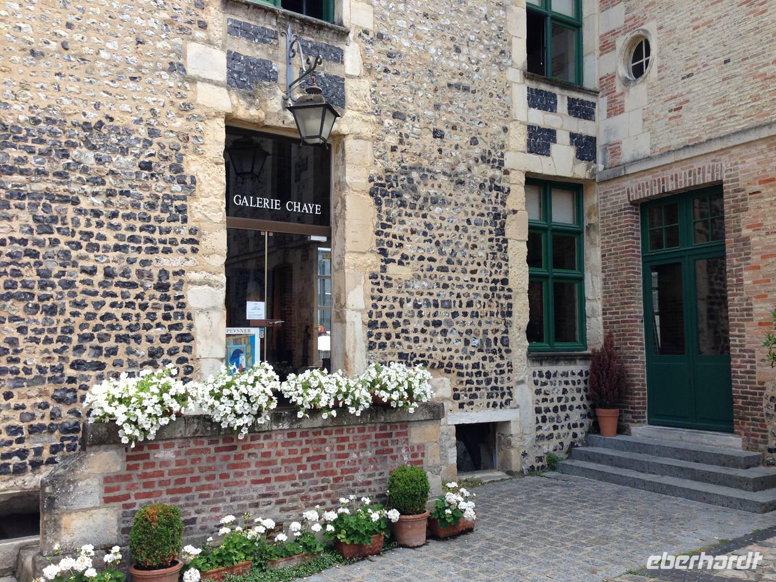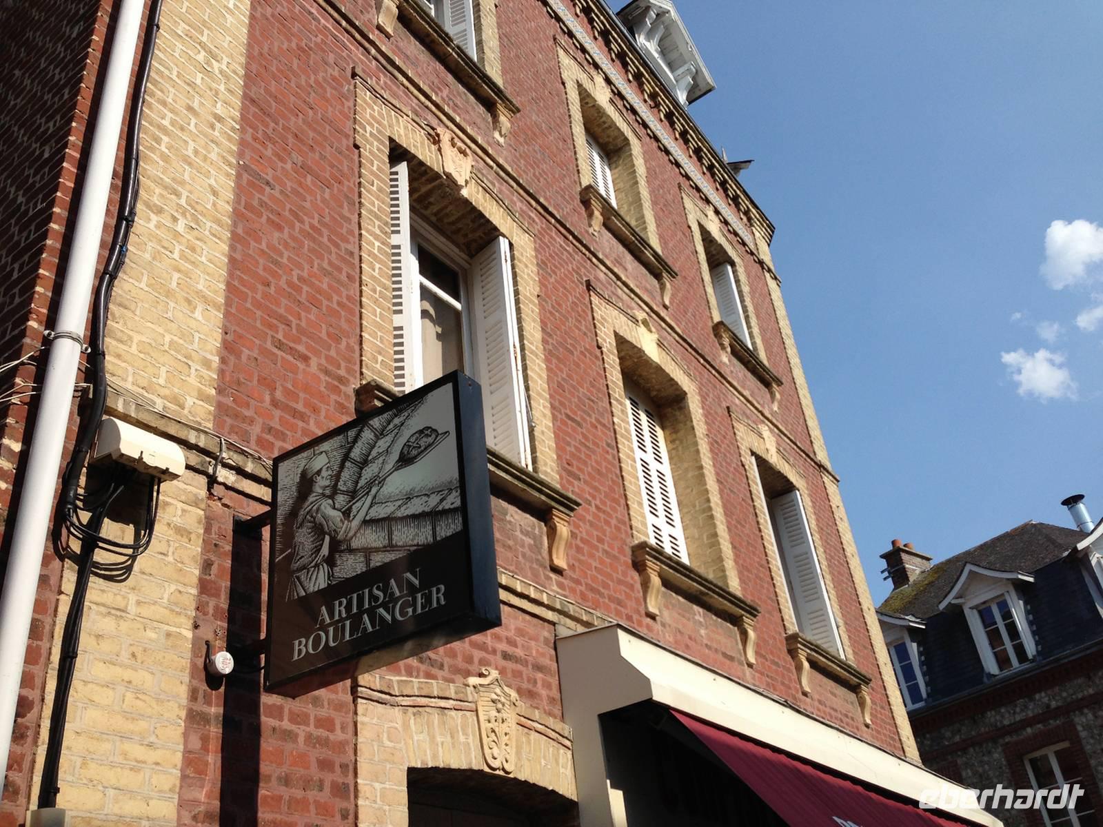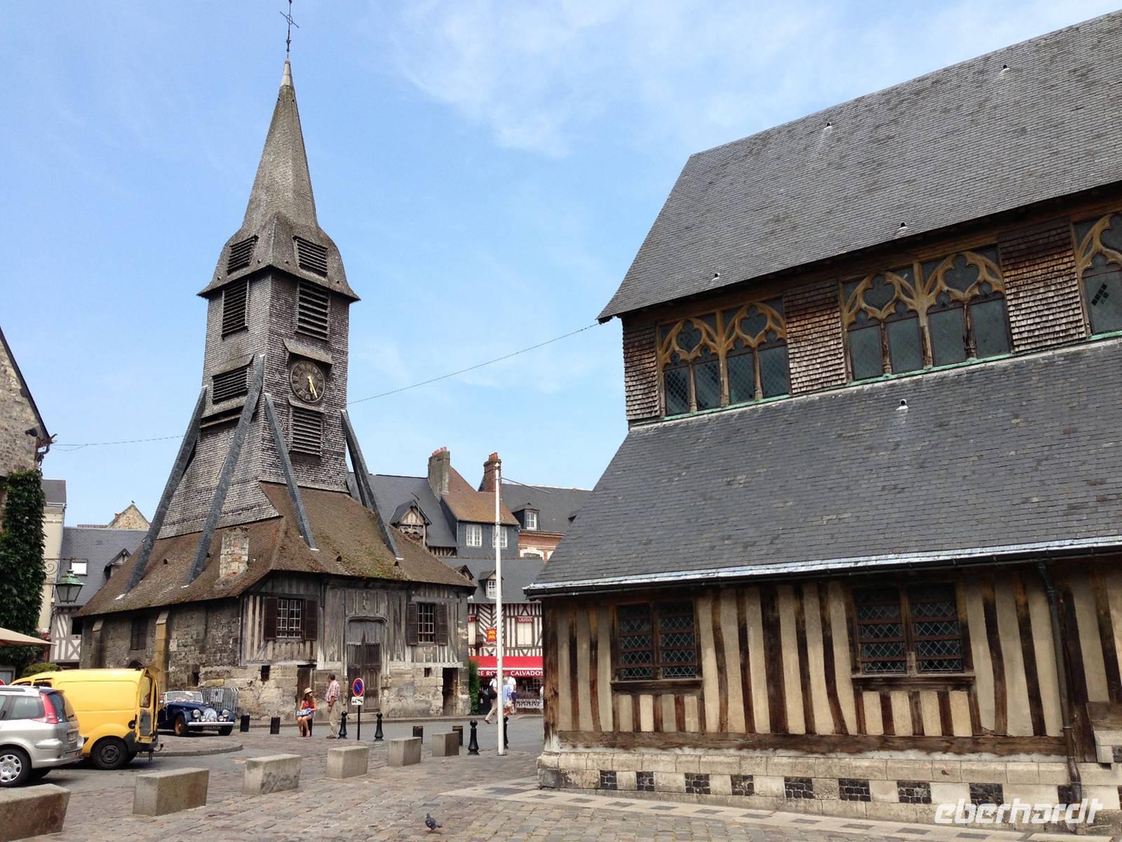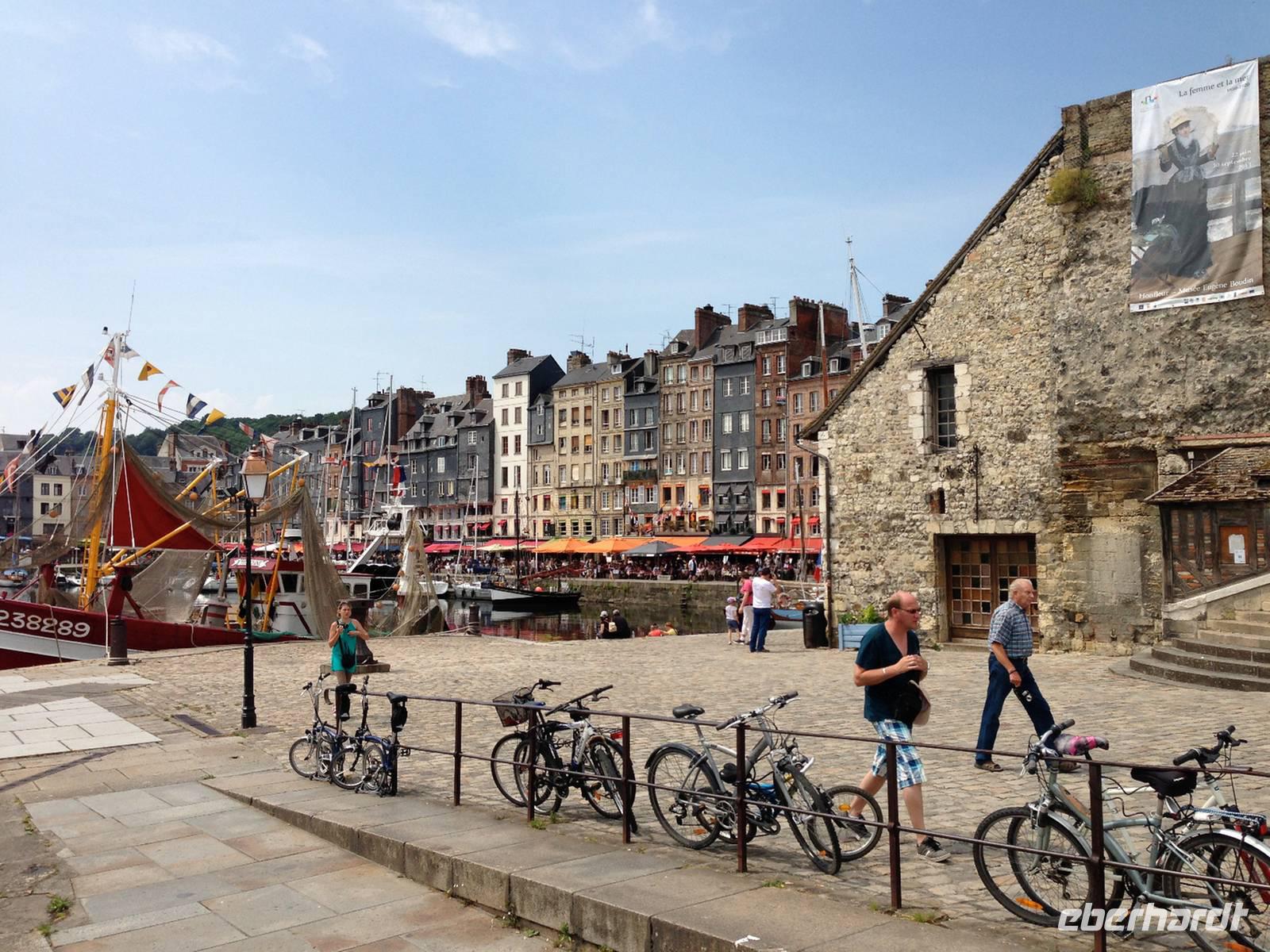 Die Mittagspause verbringen wir in Honfleur am pittoresken Hafen und in den engen Straßen, gesäumt von Fachwerkhäusern und Bauten, die aus einer Kombination von behauenen Kieseln und Ziegelsteinen errichtet sind. Diese Kombination sieht sehr schön aus und war lange Zeit beliebtes Baumaterial, bis das Sammeln von Kieselsteinen in der Normandie gesetzlich verboten wurde, denn das Material wurde in so großen Mengen abgebaut, dass ganze Küstenabschnitte gefährdet wurden. Logische Erklärung für ein heute unsinnig erscheinendes Gesetz!