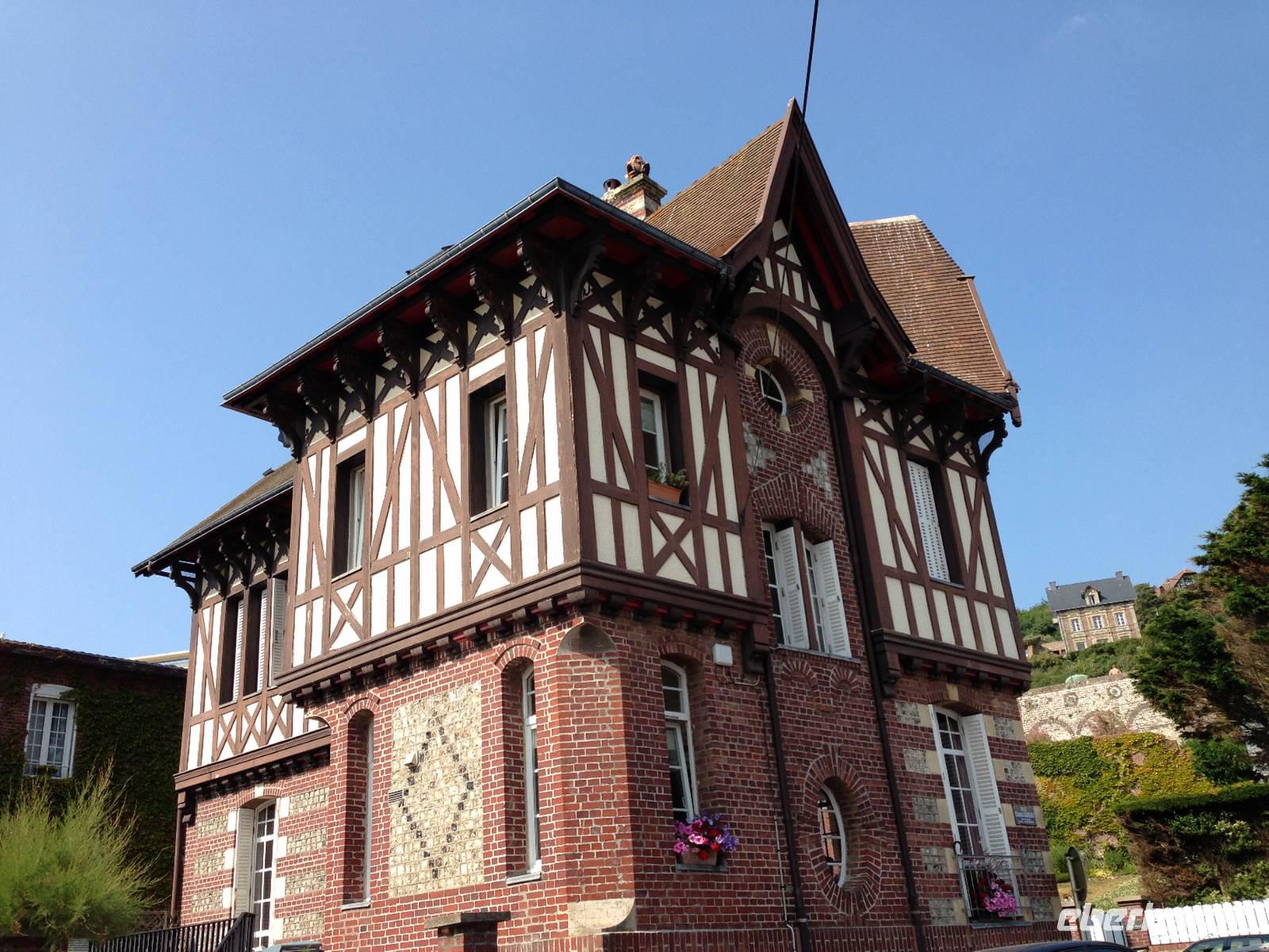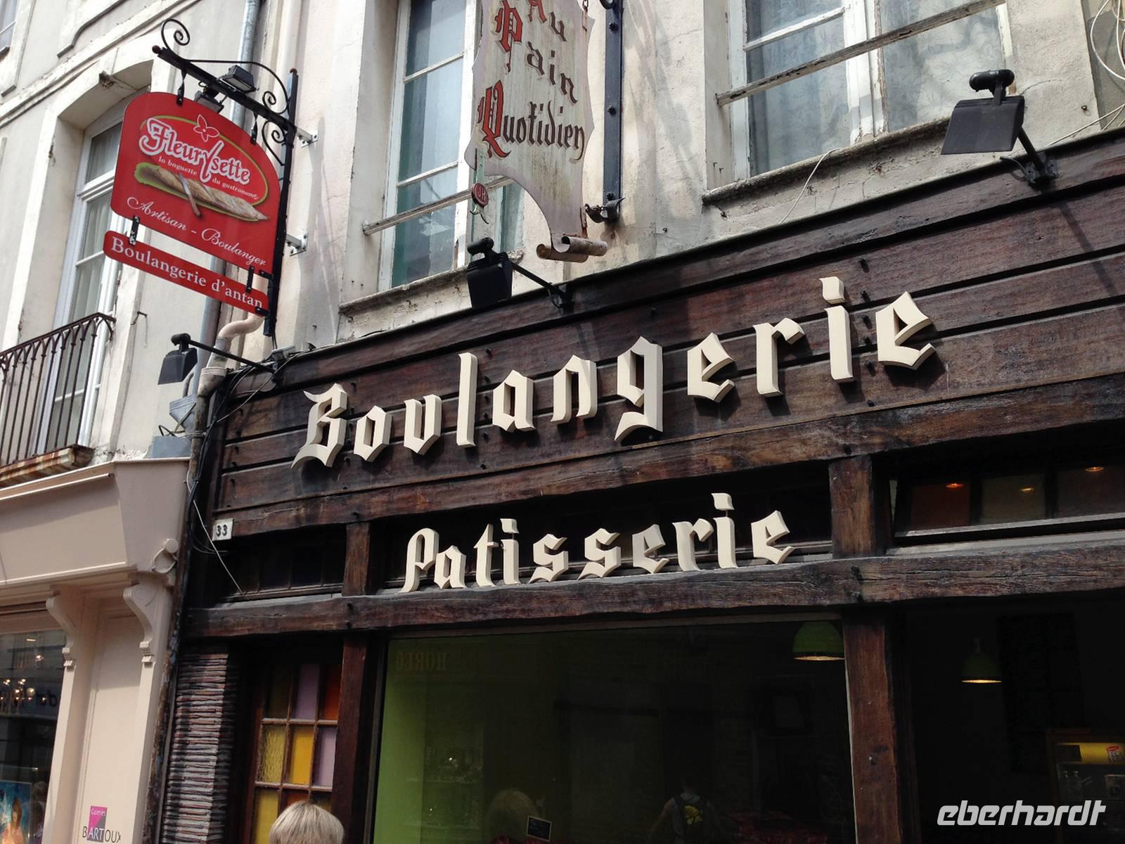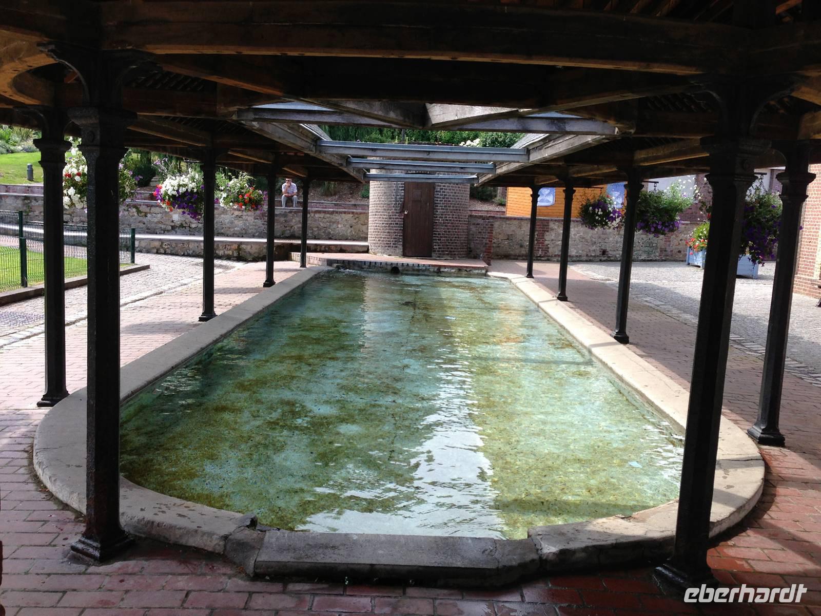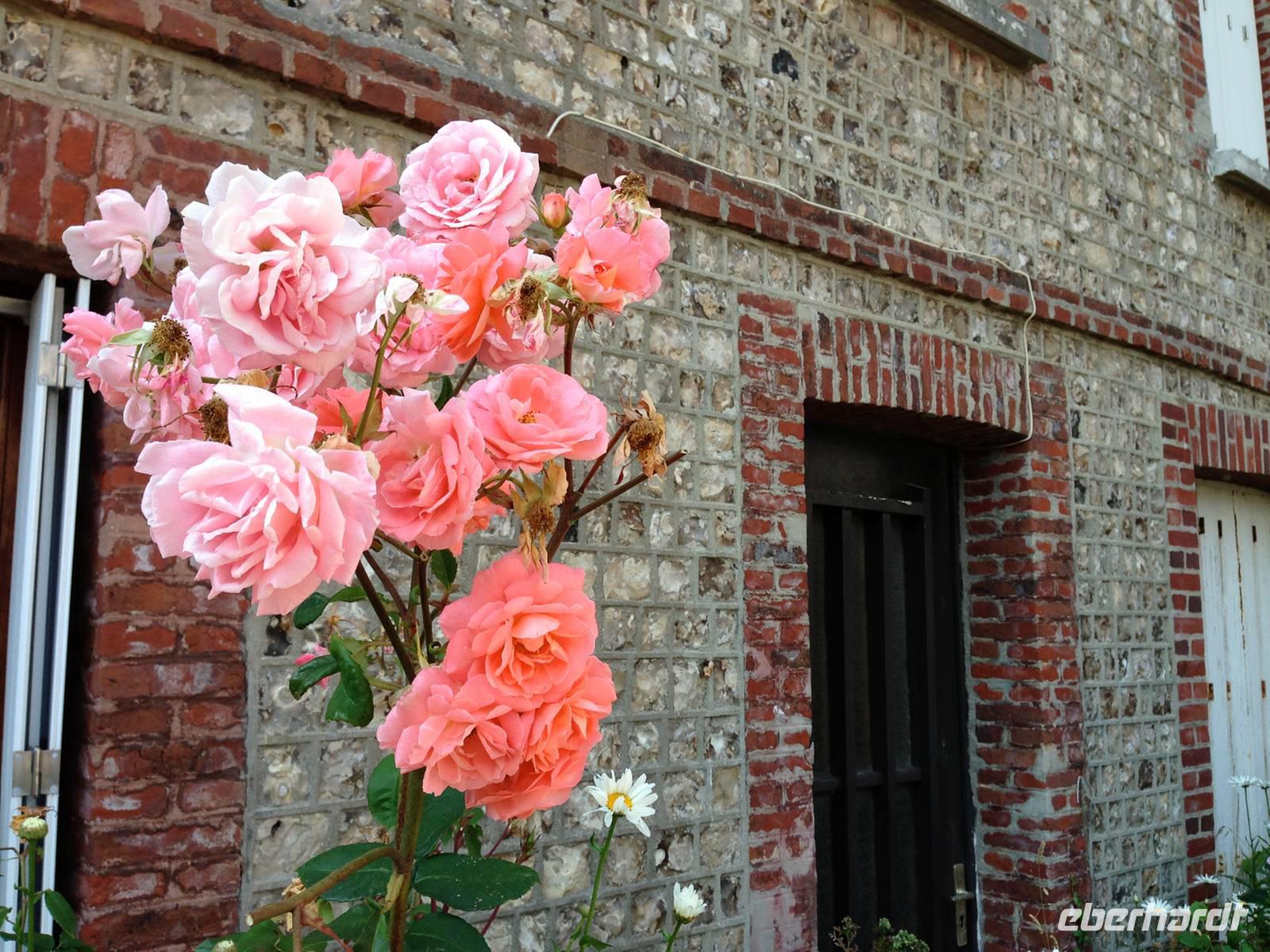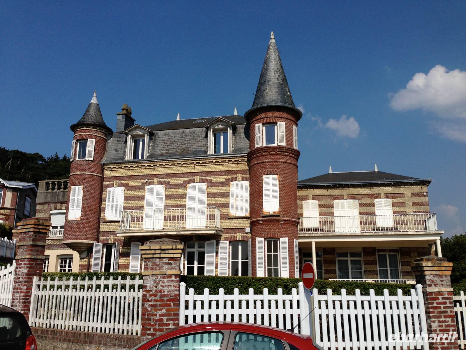 Die Mittagspause verbringen wir in Honfleur am pittoresken Hafen und in den engen Straßen, gesäumt von Fachwerkhäusern und Bauten, die aus einer Kombination von behauenen Kieseln und Ziegelsteinen errichtet sind. Diese Kombination sieht sehr schön aus und war lange Zeit beliebtes Baumaterial, bis das Sammeln von Kieselsteinen in der Normandie gesetzlich verboten wurde, denn das Material wurde in so großen Mengen abgebaut, dass ganze Küstenabschnitte gefährdet wurden. Logische Erklärung für ein heute unsinnig erscheinendes Gesetz!