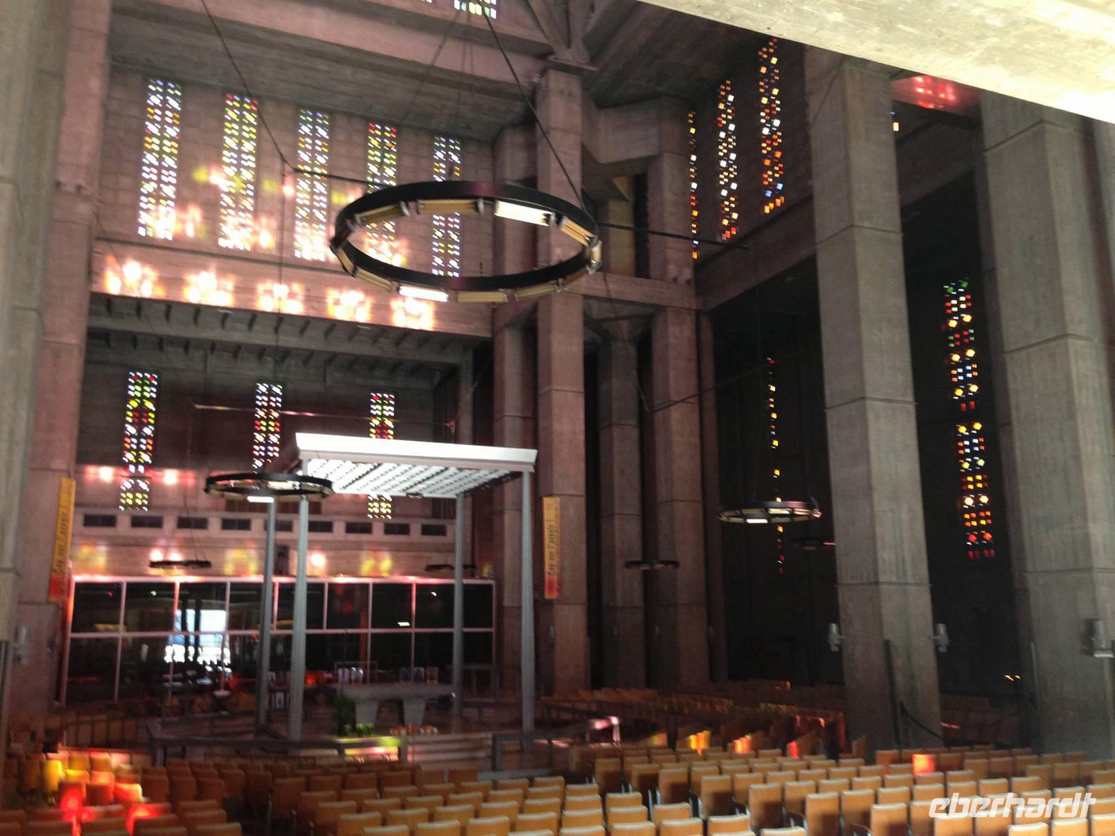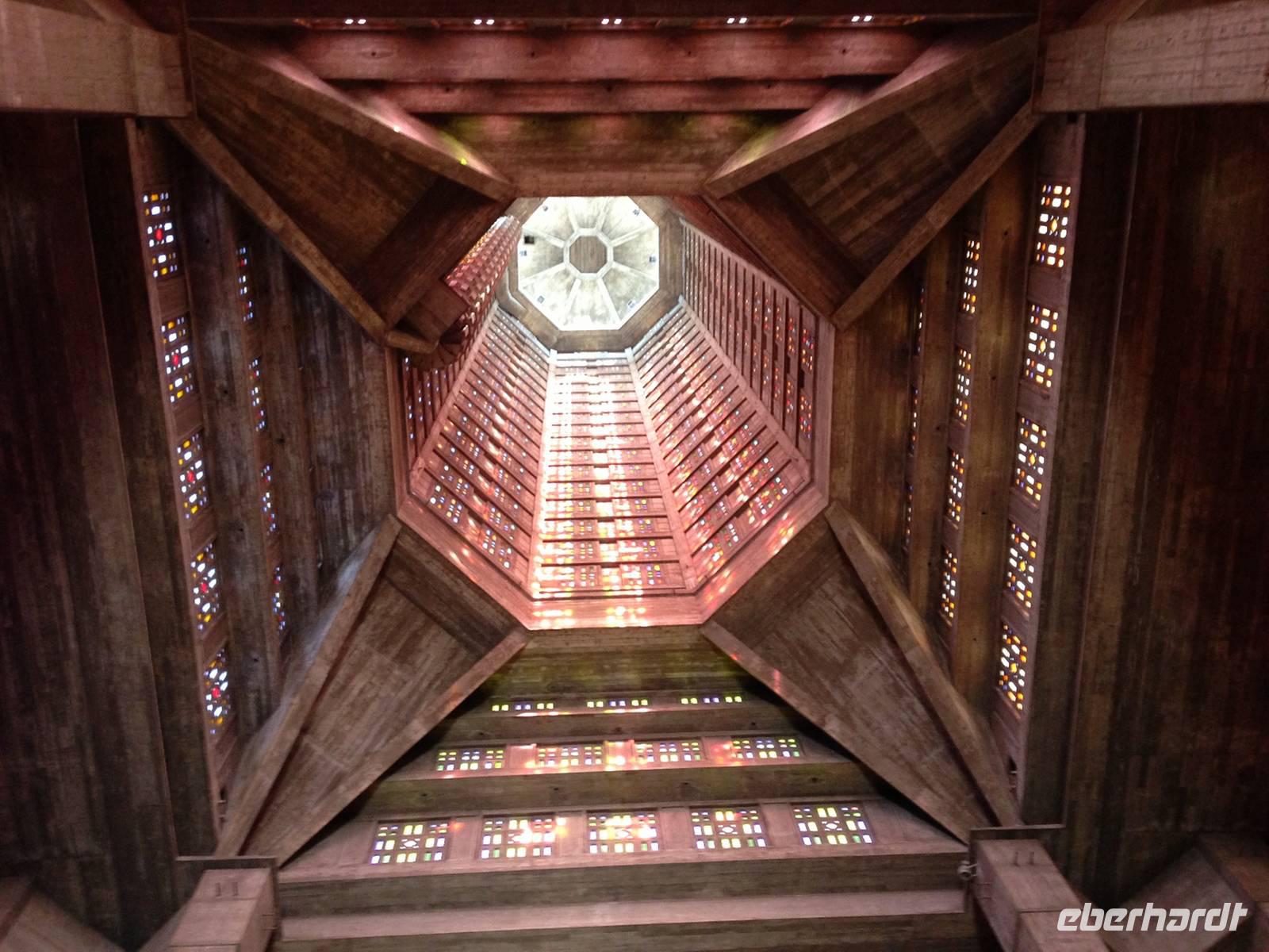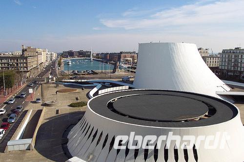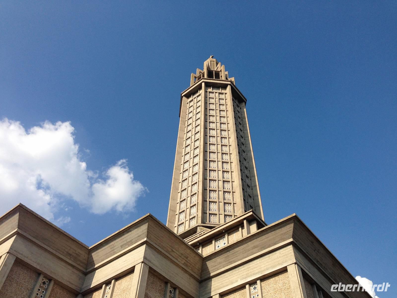 In Le Havre mag man zwar ein historisches Zentrum vermissen, aber man muss die große Wiederaufbauleistung der von den Alliierten im Zweiten Weltkrieg zu 80% zerstörten Stadt durchaus anerkennen. Wir machen einen kurzen Halt an der Kirche Saint Joseph, wo die Gäste die Betonfassade zunächst kritisch beäugen. Aber der Innenraum fasziniert alle: Ein endlos wirkender Raum, dessen Zentrum von dem 130 Meter hohen Kirchturm geformt und von über zehntausend Lichtöffnungen aus Glasbausteinen in mystisches Licht getaucht ist.