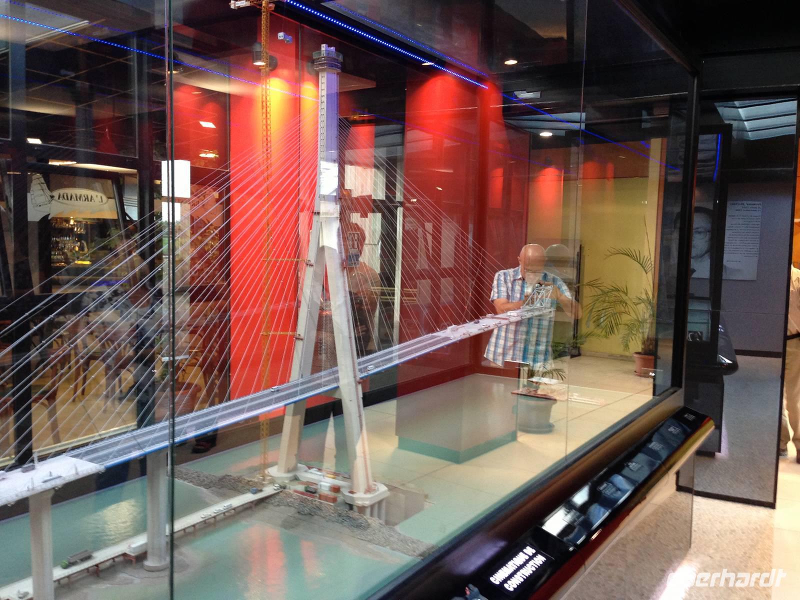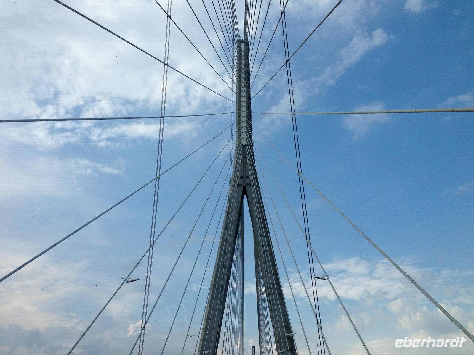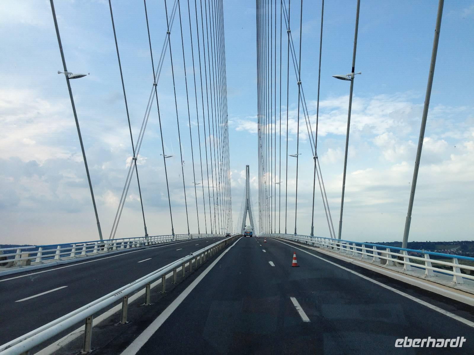 Nachdem wir die grandiose Konstruktion der Schrägseilbrücke über die Seinmündung bewundert haben, erreichen wir etwa vierzig Kilometer landeinwärts im Pays d'Auge die bekannte Calvadosbrennerei „Château du Breuil". Die Führung erfolgt nun in Fremdsprache- einige zucken zusammen - keine Sorge! Alle verstehen die charmante Österreicherin, die mit wienerischem Akzent durch die Destillerie und die Lagerkeller führt. Die anschließende Verkostung von Calvados unterschiedlichen Alters und von Pommeau (ein 17-prozentiger Apéritif aus Cidre, dessen Gärungsprozess durch Zugabe von Calvados unterbrochen wird) fördert die Kauflaune und wir decken uns für den nächsten Winter mit „Heizmaterial" ein!