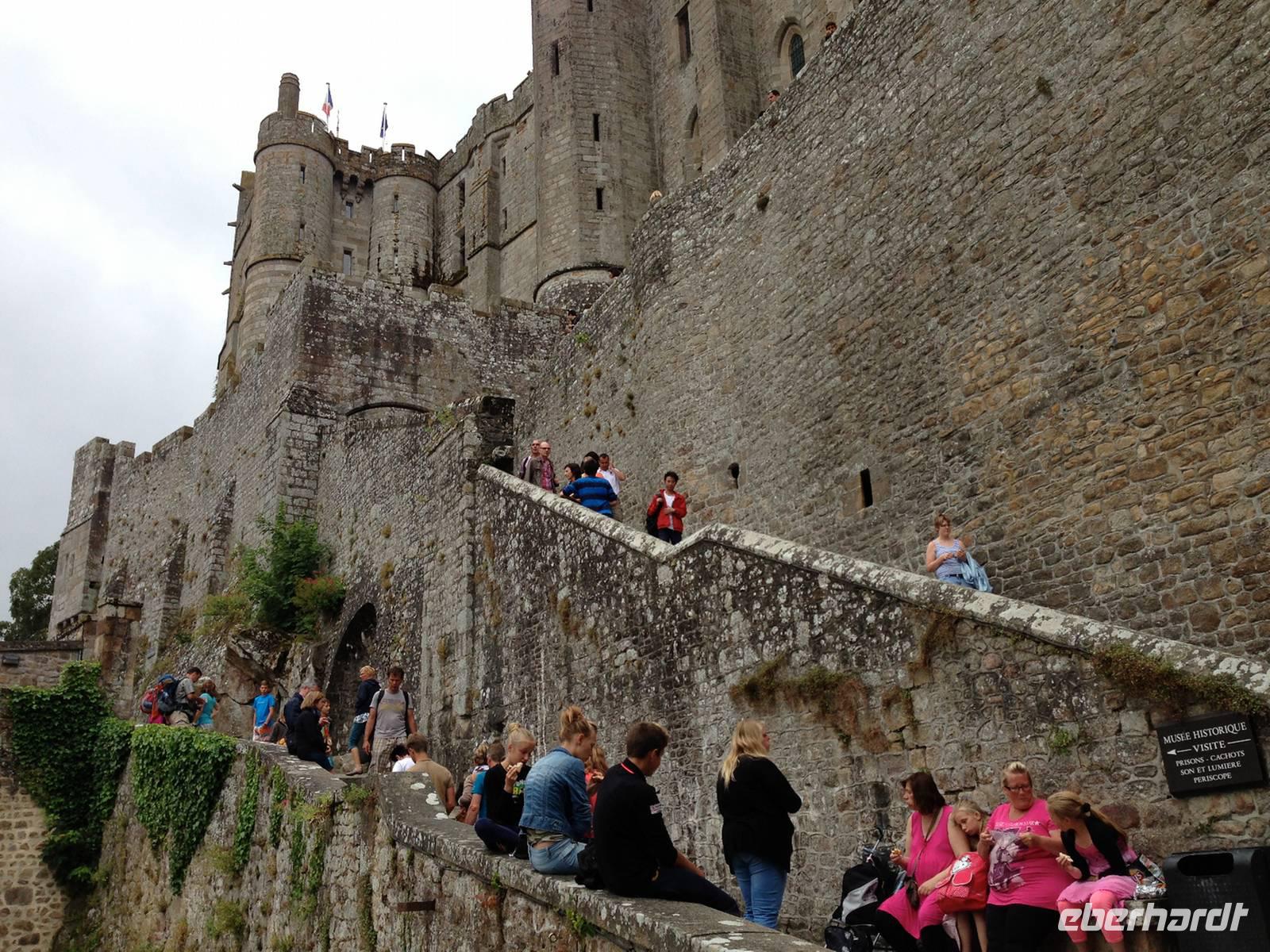 Voller Spannung machen wir uns auf den Weg zur „Pyramide im Meer", wie Victor Hugo den Mont Saint Michel nannte. Da die Bucht durch den Bau eines Dammes zur Erschließung des Berges immer mehr versandete, wurde der große Parkplatz direkt am Berg abgerissen und das Land dem Meer zurückgegeben. Für die Besichtigung nehmen wir uns ausreichend Zeit und Puste, denn es geht kräftig berg- und treppauf! Als die 760 Stufen bewältigt sind, dürfen wir, begleitet vom individuell anwählbaren Kommentar unseres Audio-Guides die beeindruckenden Räume besichtigen.