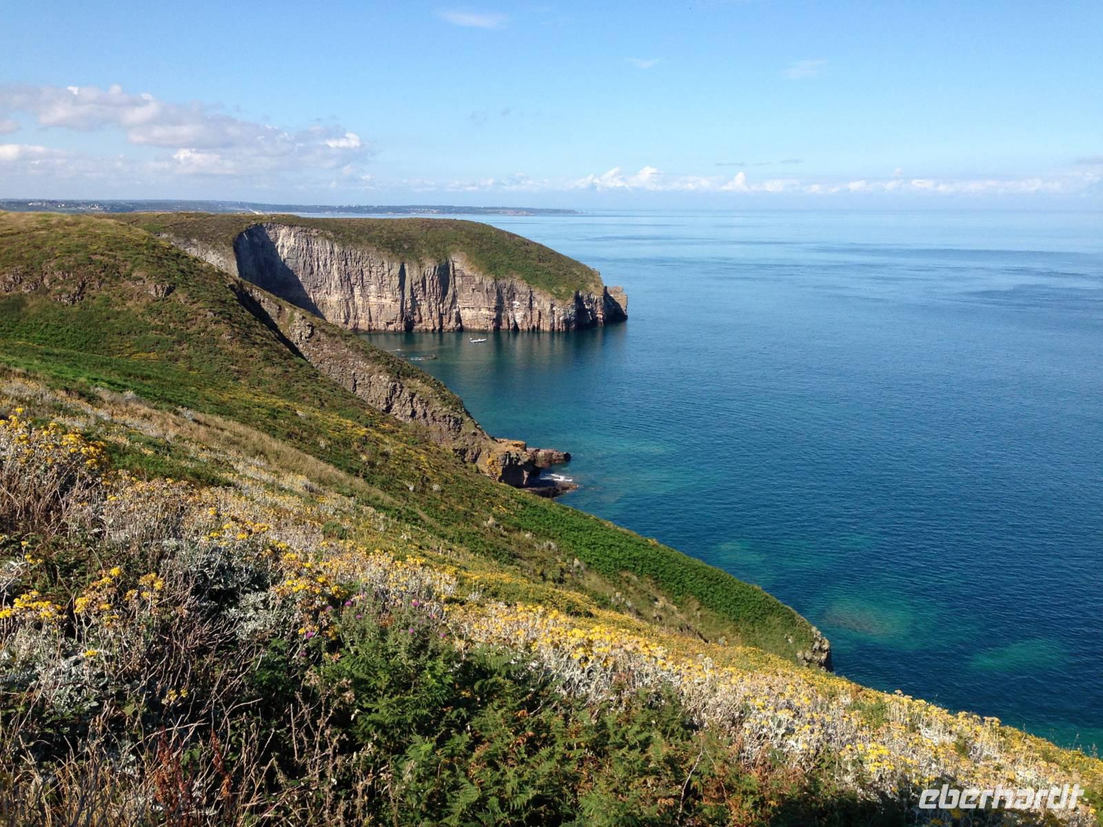 Das Cap Fréhel an der Smaragd-Küste im Golf von Saint Malo lockt uns heute mit einem Spaziergang und wunderschönen Ausblicken auf die Brutplätze zahlloser Vögel wie Kormorane und Austernfischer. Bei der anschließenden Fahrt an der Nordwestseite des Caps locken die langgezogenen Sandsträne, wo schon reger Badebetrieb herrscht.