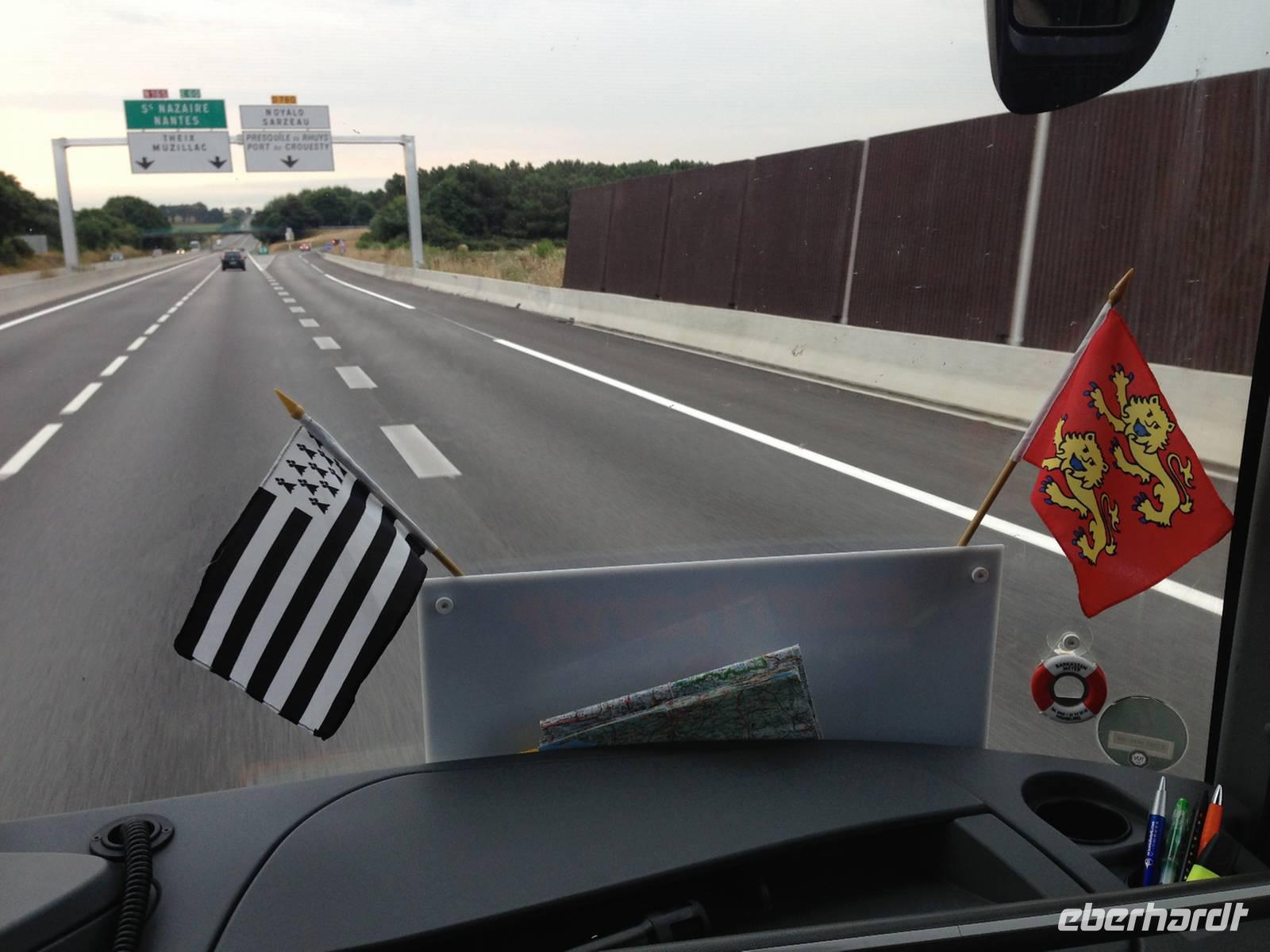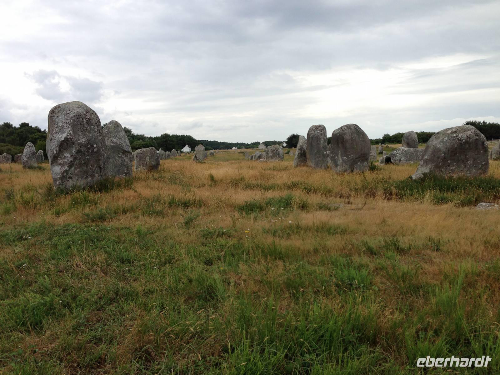 Wir verlassen das Finistere, um wieder in Richtung Osten zu fahren. Unser nächstes Ziel ist das Département Morbihan, genauer: Die Umgebung von Carnac, das "Mekka der Megalith-Kultur". Mit 3000 aufrecht stehenden Steinen treffen wir hier auf eine eindrucksvolle Konzentration von Überbleibseln einer bis heute rätselhaften Zivilisation: Weithin sichtbare Steinkolosse, auch Menhire genannt. Zwischen den Steinreihen von Kerzerho machen wir unser Gruppenfoto, denn nur hier gibt es noch Hinkelsteine zum Anfassen. In Le Menec haben wir aus unserer erhöhten Position im Bus einen guten Überblick auf die über einen Kilometer lange Gruppierung von Steinen unterschiedlicher Größe, die, gemäß einer von Hunderten von Sagen, in Stein verwandelte römische Soldaten sein sollen.