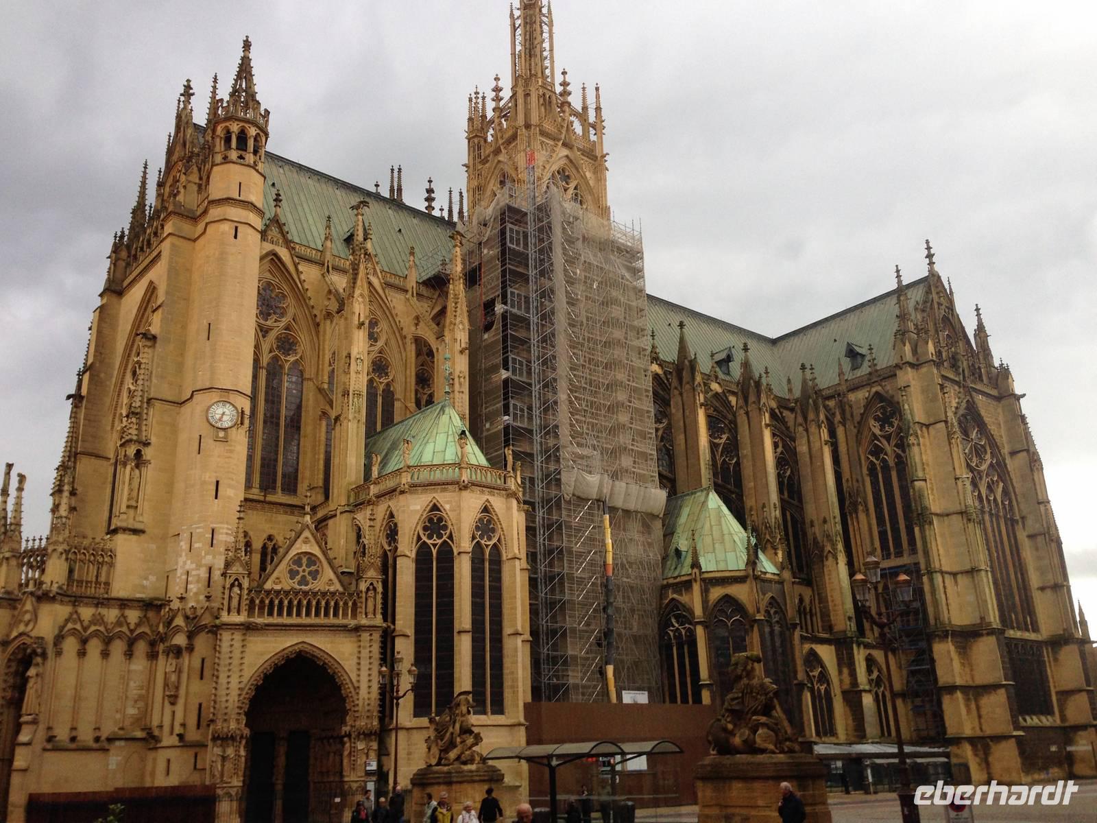 Unsere Reise in nach Frankreich beginnt heute zu früher Stunde am Flughafen in Dresden. Nach mehreren Zustiegen ist die Reisegruppe in Frankfurt komplett und wir fahren über Frankfurt und Saarbrücken nach Metz. Wir beginnen unseren Spaziergang an der Place St. Louis, die fast italienisch anmutet: Laubengänge mit Treppenabgängen wie in Norditalien oder mancherorts in der Schweiz. Wir überqueren einen weiteren Platz, die Place Saint Jaques und um die nächste Straßenecke wartet das bekannteste Gebäude der Stadt: Die mächtige, gotische Kathedrale! Gigantische Strebebögen halten die Seitenwände des gotischen Kirchenschiffes und der jüngst restaurierte Muette-Turm erhebt sich vor unseren Augen 90 Meter hoch (bis zur äußersten Spitze gemessen!) in den Himmel. Die elf Tonnen schwere Glocke schlägt mittags zwölf Mal - nur an Wahltagen erklingt sie viertelstündlich!