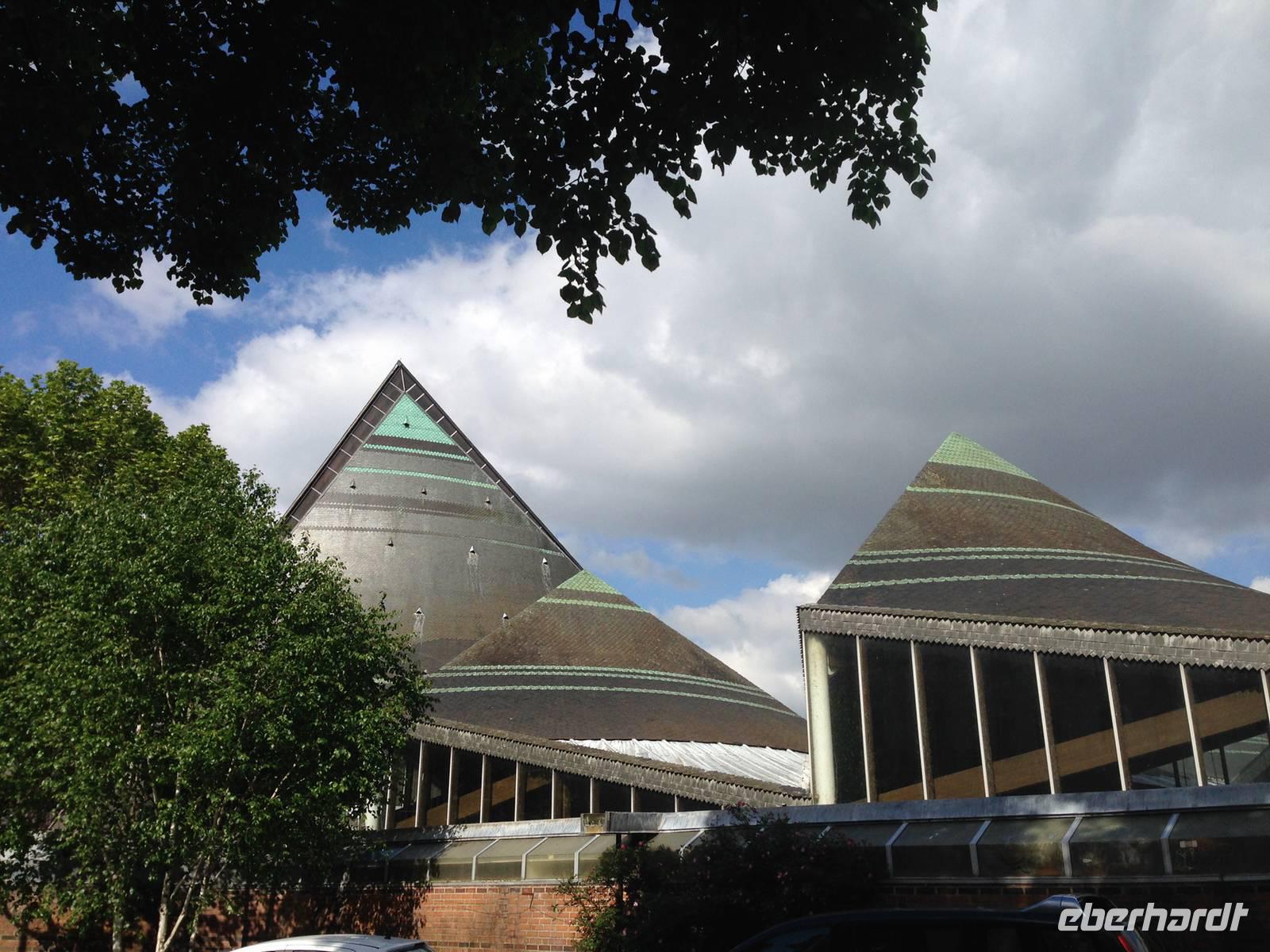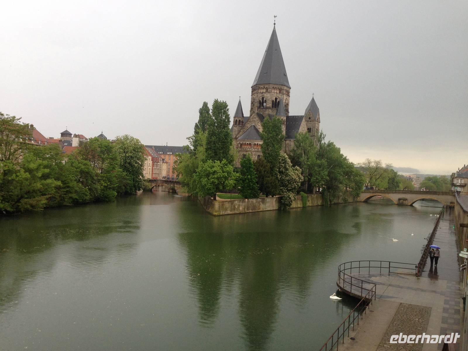 Bei leichtem Schauer geht es hinunter zur Mosel ... pardon, zur Moselle! Bitte die Betonung richtig machen: kein langes "o" sondern auf der letzten Silbe betonen, wir werden noch üben! Wir werfen einen kurzen Blick auf das Theater und spazieren entlang der Kaimauer. Der "Temple Neuf" liegt wie ein Schiff mitten im Fluss, teilt ihn mit bugartiger Umfriedung. Im katholischen Frankreich sind die "Temple" genannten protestantischen Kirchen eine Ausnahme.