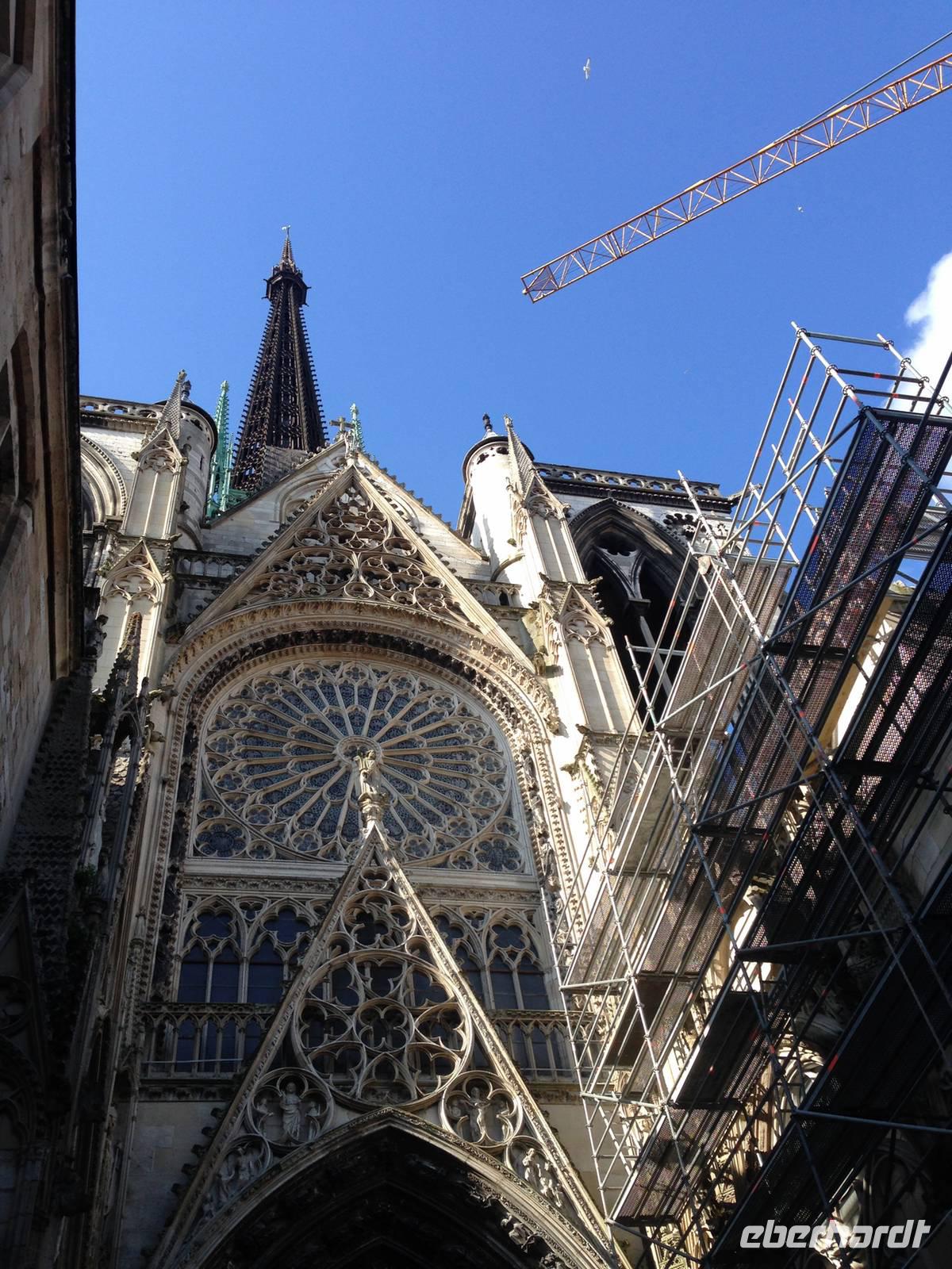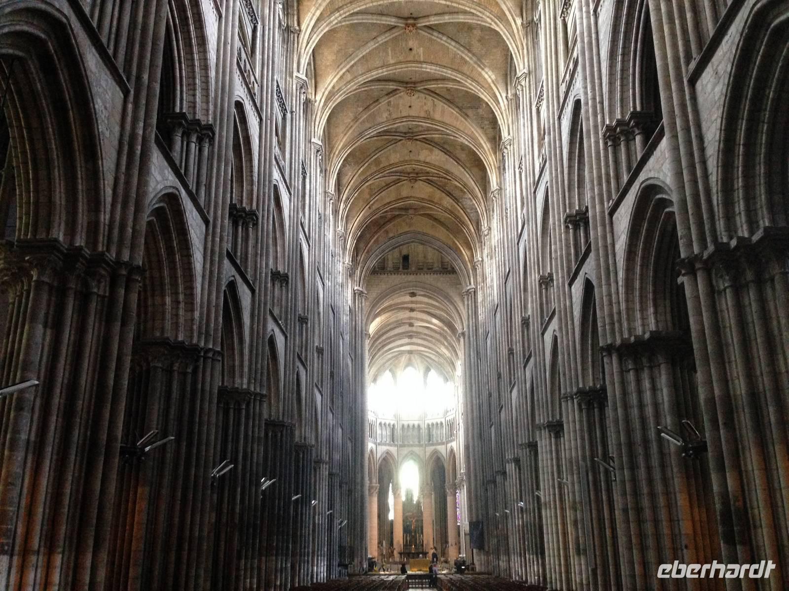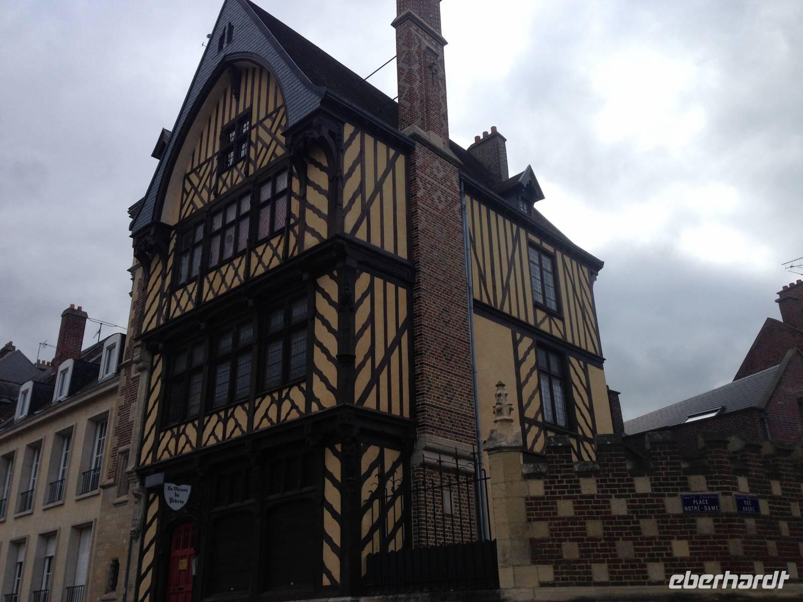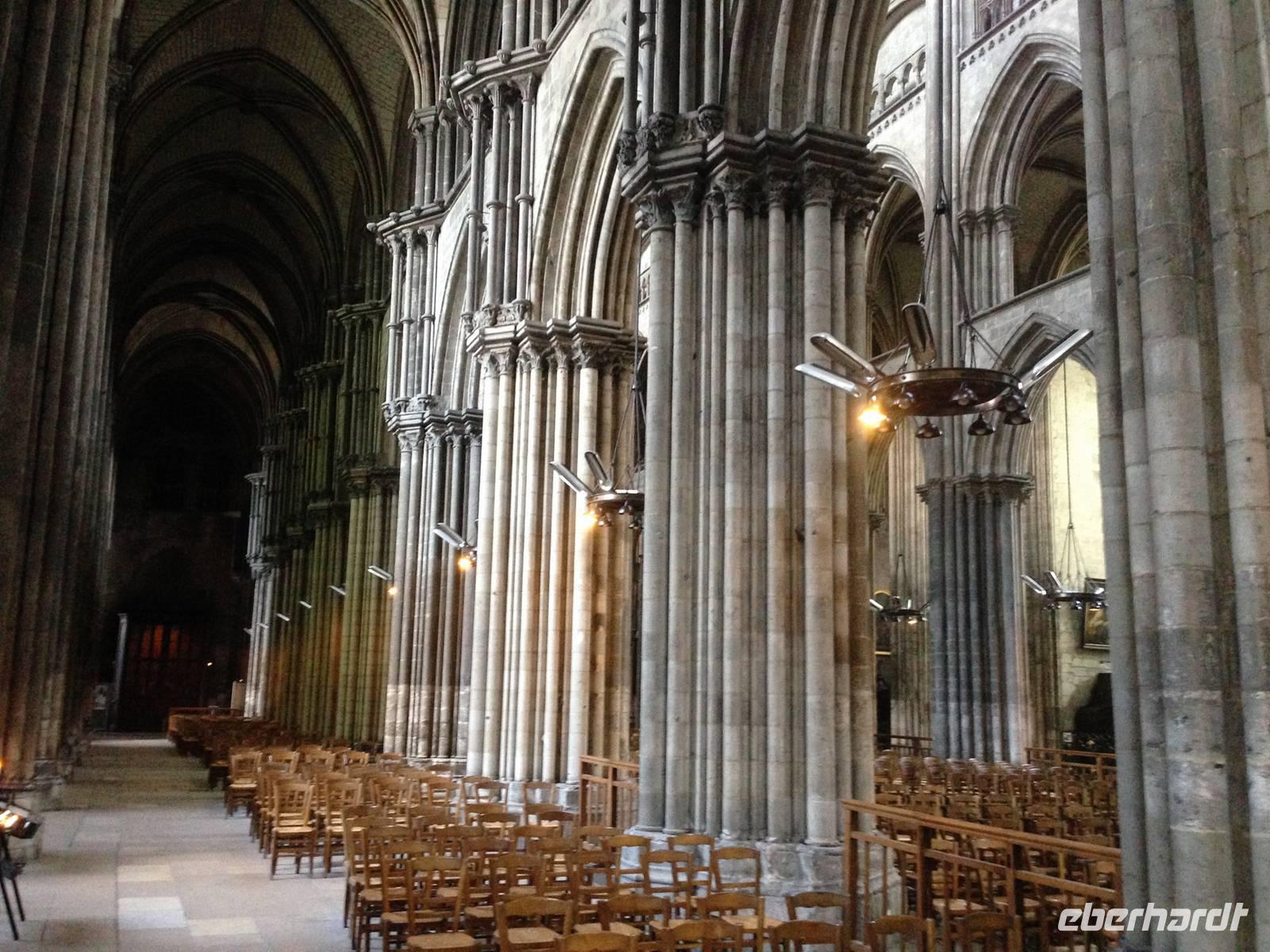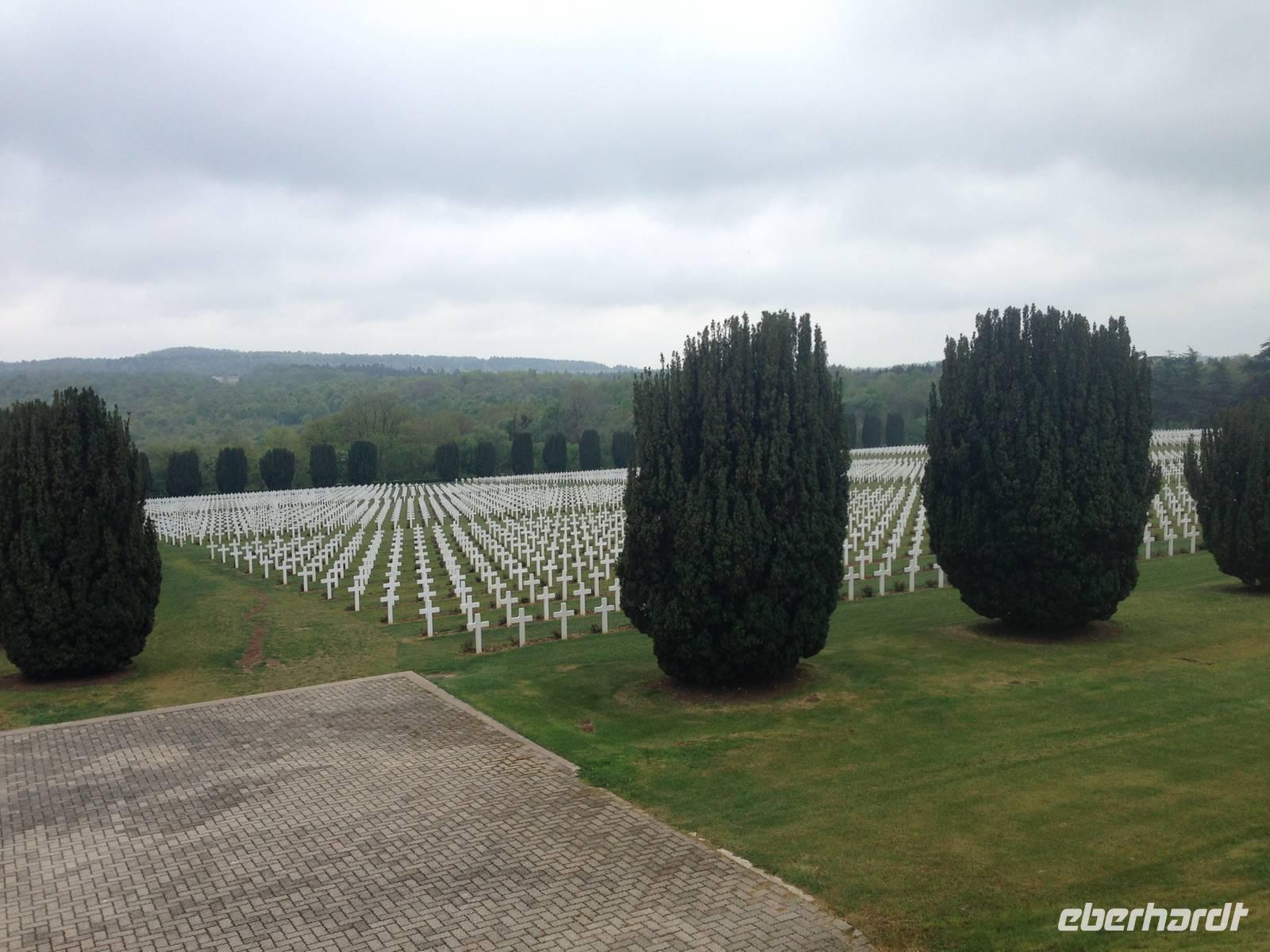 Heute besuchen wir, ausgestattet mit festem Schuhwerk -und nicht minder festem Nervenkostüm!- die Schlachtfelder von Verdun. Die Schilderungen unseres örtlichen Reiseleiters gehen auf sehr anschauliche Art und Weise in die Tiefe eines Themas, welches noch mehr Schattenseiten hat, als den meisten von uns bisher bewusst war. Im Beinhaus von Douaumont überwältigt uns einmal mehr die Anzahl der Kriegstoten und das Ringen um einen würdigen Umgang für die Hinterbliebenen. Das Fort Douaumont lehrt uns die Schecken des Kriegsalltags im menschenverachtenden Stellungskampf des Ersten Weltkriegs. Alljährlich finden hier Gedenkfeiern statt, in diesem Jahr wird es sogar die Hundertjahrfeier sein. Der französische Staat finanziert die Pflege sehr vieler Gedenkstätten und Friedhöfe, der 11. November ist in Erinnerung an den Waffenstillstand von 1918 nationaler Feiertag. Danach geht die Reise weiter durch die Champagne und die Picardie bis nach Rouen, wo wir wiederum nur für eine Nacht das Hotel beziehen und nach dem Abendessen erschöpft in die Betten fallen! À-propos: ein neuer Trend, an welchem wir deutsche Touristen sicher nicht unschuldig sind, macht sich in französischen Hotels breit: Fast immer musste man sich früher zwischen zwei Bettlaken unter eine dünne Wolldecke klemmen und eine Nackenrolle als Kopfkissen zurechtklopfen. Am nächsten Morgen wachte man womöglich umwickelt von Laken, die Wolldecke weit weg, verspannt oder gar frierend auf. Heute finden wir die von zuhause gewohnten Bettecken und Bettbezüge vor, das macht die Nacht bequemer. Aber, Komfort hat eben seinen Preis: Wie in Frankreich fühle ich mich in diesen Hotelzimmern nur noch selten! Auch irgendwie schade!