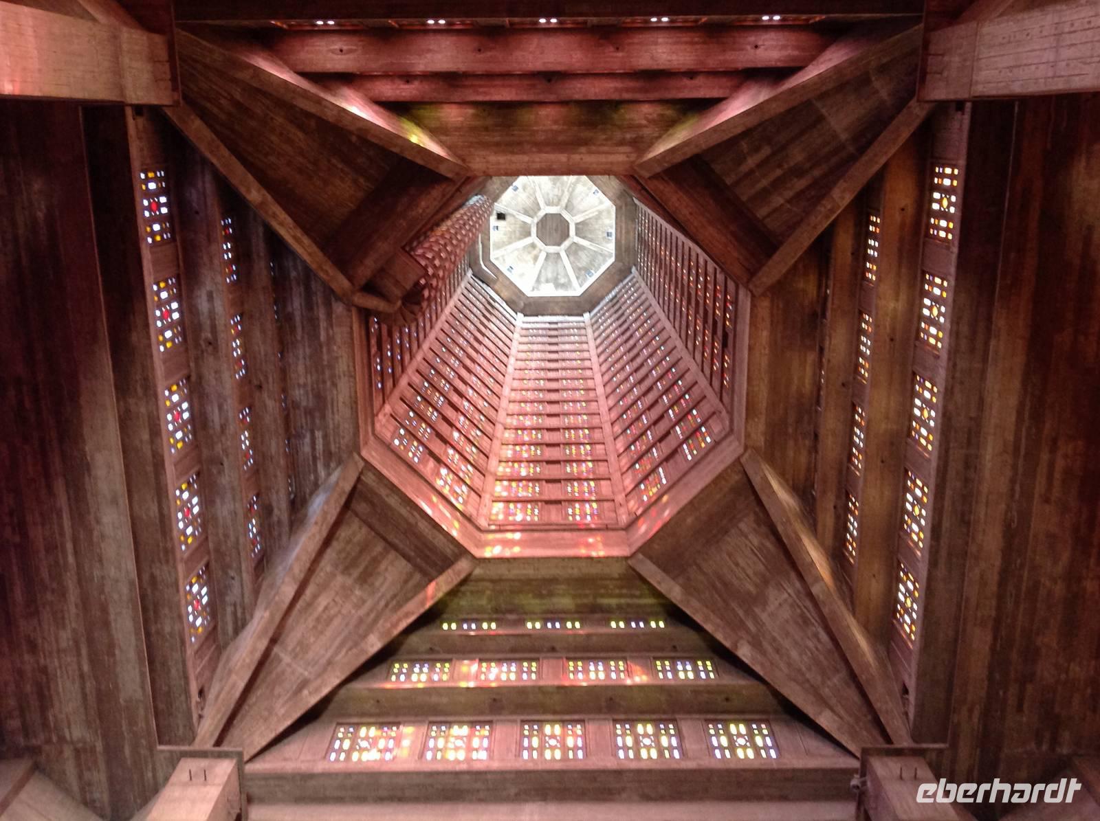 Anschließend bringt uns unser Bus bis ins Zentrum des kleines Badeortes Étretat. Bei strahlend blauem Himmel machen sich die meisten Gäste auf den Weg zum Plateau der Falaise Aval. An der Strandpromenade erinnern Informationstafeln mit Reproduktionen von impressionistischen Gemälden an die Maler des Impressionismus: Hier entstanden Claude Monets berühmte Kreidefelsen-Bilder. In dem Aval-Felsen erkannte er die abstrahierte Form eines Elefanten, der seinen Rüssel ins Meer steckt. Es geht weiter nach Le Havre, wo wir eine weitere moderne Kirche besichtigen: St. Joseph aus der Feder von Auguste Perret - Stadtplaner und Chefarchitekt des Wiederaufbaus von Le Havre - die Stadt im Zweiten Weltkrieg zu 80% zerstört!