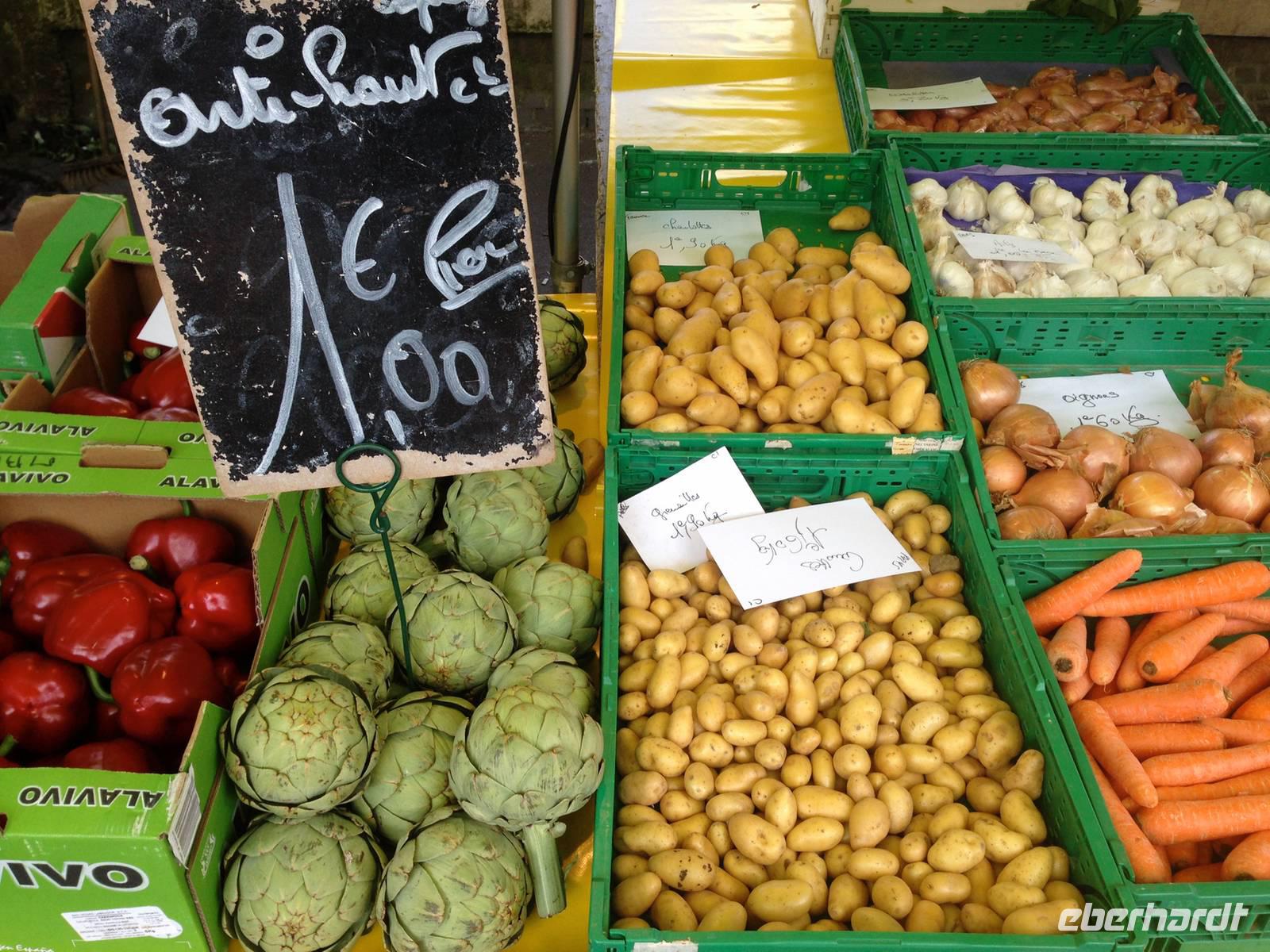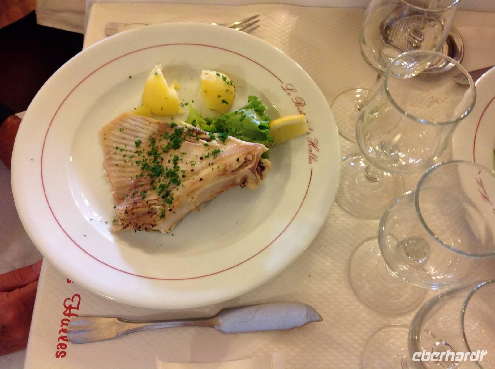 Zu Abendessen gehen wir nur zwei Straßen weiter in die typisch französische Markt-Brasserie, die gleich gegenüber der modernen Markthalle gelegen ist. Das Hauptgericht ist für alle eine "Première": Rochen mit Kartoffeln und Butter-Kapern-Soße - es wird von allen Seiten gelobt! Noch gewöhnungsbedürftig ist für die meisten Gäste jedoch die Beengtheit an den Tischen! Aber auch das ist ein Stück Frankreich.
