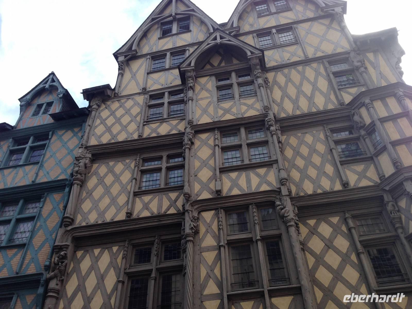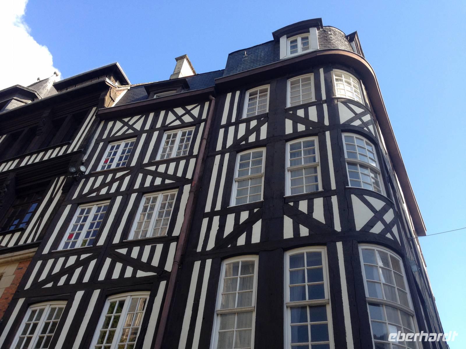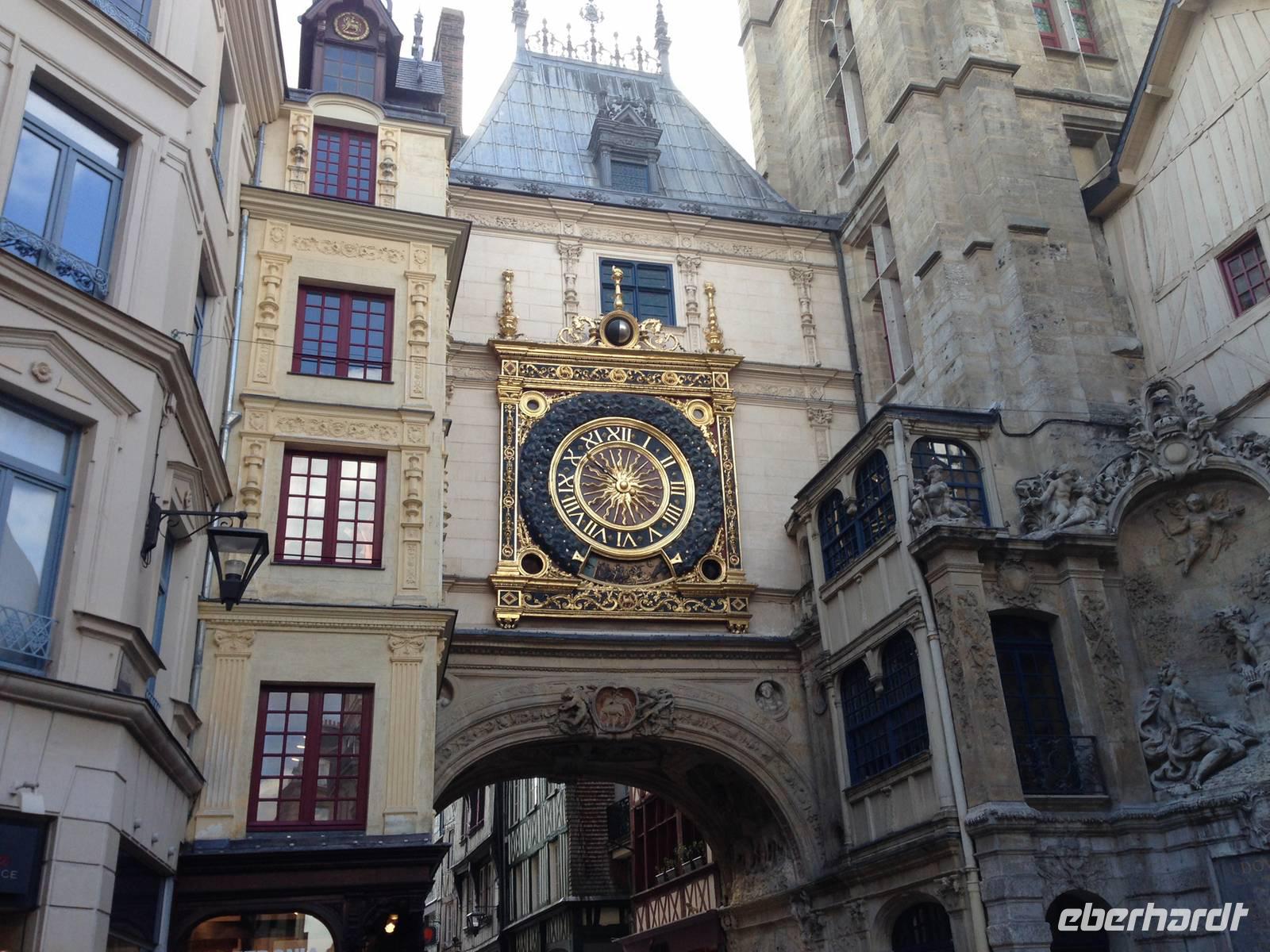An der grandiosen Kathedrale von Rouen erwarten uns zwei örtliche Reiseleiterinnen, die uns entlang beeindruckender Fachwerkzeilen und über stimmungsvolle Plätze führen. Heimliches Wahrzeichen der Stadt ist die herrliche Gros-Horloge, eine Uhr mit Stundenzeiger von 1389, die sich in einem prachtvollen Renaissance-Torbau befindet. Die Führung endet an der Place du Vieux Marché (Alter Markt), dem belebten Kern der Altstadt, wo die spätere Nationalheldin Jeanne d'Arc 1431 verbrannt wurde. Heute erinnert ein moderner Kirchenbau, welcher in die modernen Markthallen integriert ist, daran.