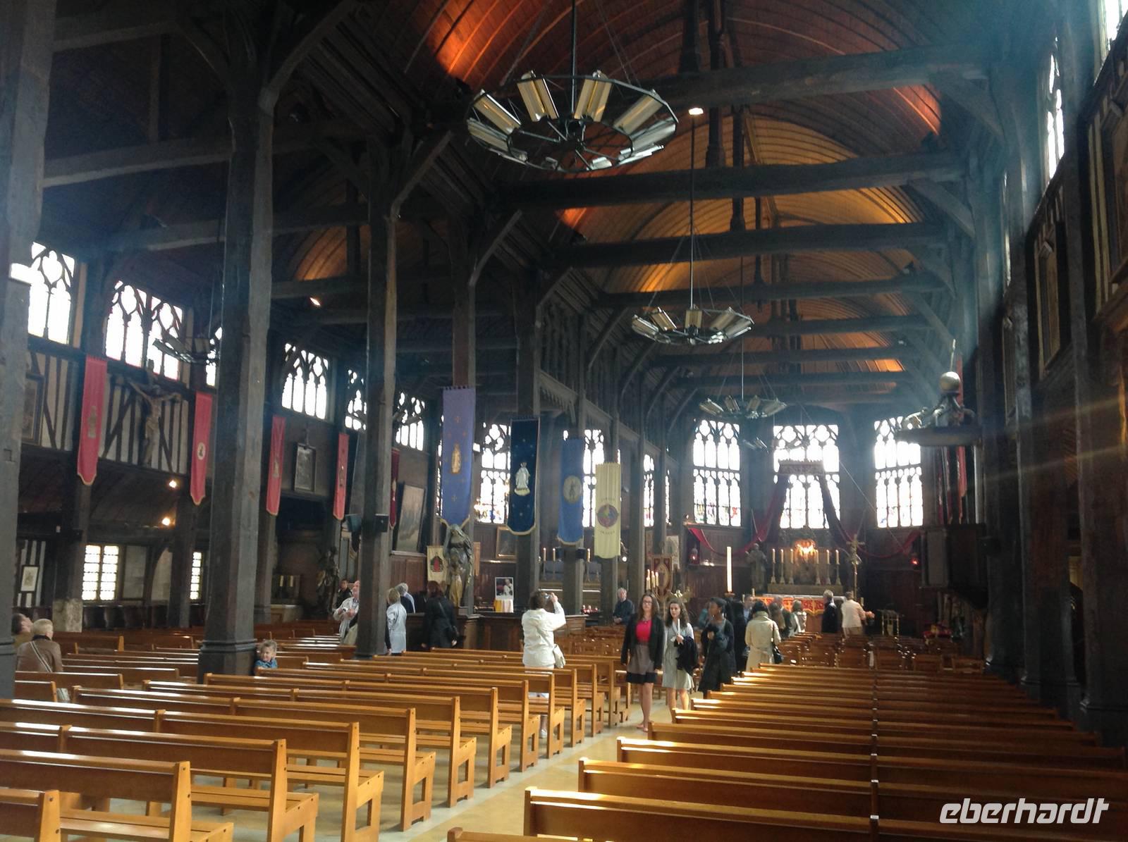 Unter blauem Himmel erwartet uns Honfleur: Das malerische Hafenstädtchen an der Seinemündung hat seit jeher Maler, Musiker und Schriftsteller angelockt. Vorbei an mächtigen Salzspeichern und durch enge Straßen gelangen wir in einen versteckten Hinterhof mit Galerien der heutigen Künstler. Wir queren den Hafen und erreichen eine außergewöhnlichen Kirche: Es gibt zwei gleichwertige Hauptschiffe und die gesamte Kirche ist aus Holz erbaut, mit Dächern, die an ein umgedrehten Schiffsrumpf erinnern. Wir machen noch einen kurzen Abstecher in den Werksverkauf einer Fischkonservenfabrik - mit Verkostung und somit kostenloser Vorspeise in Form von Sardinencreme mit Whisky oder "Émietté de Maquerau" -das sind Makrelenfiletstückchen mit Zitrone, Olivenöl, Tomaten und Kräutern der Provinz- auf "Pain Croustillant". Zur Mittagspause bei Cidre Bouché und Galette oder (und!) Crêpe finden wir uns wieder im pittoresken Hafen ein.