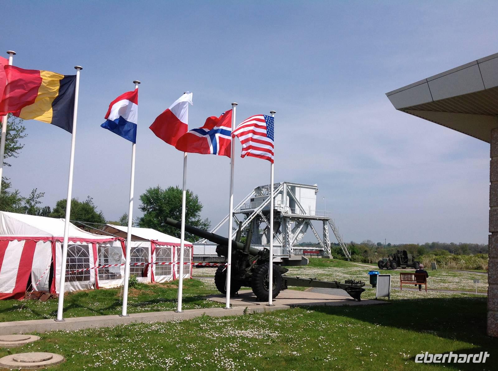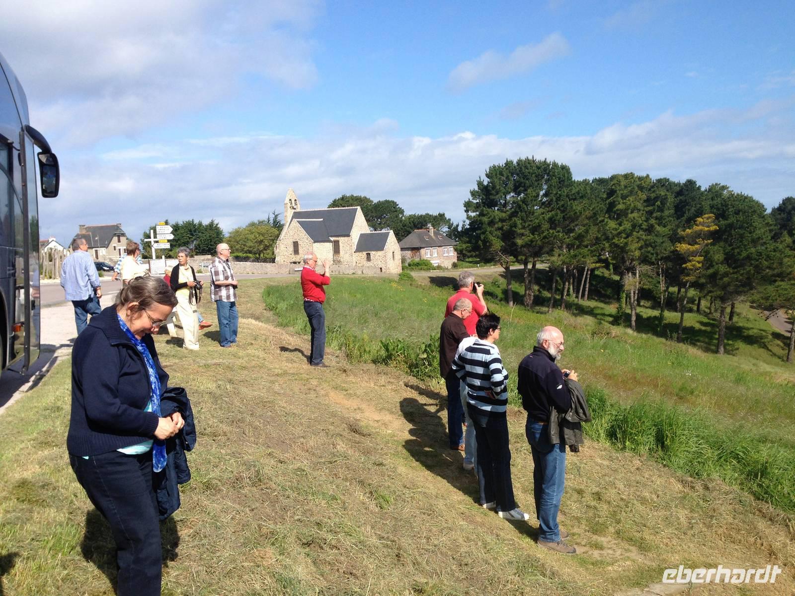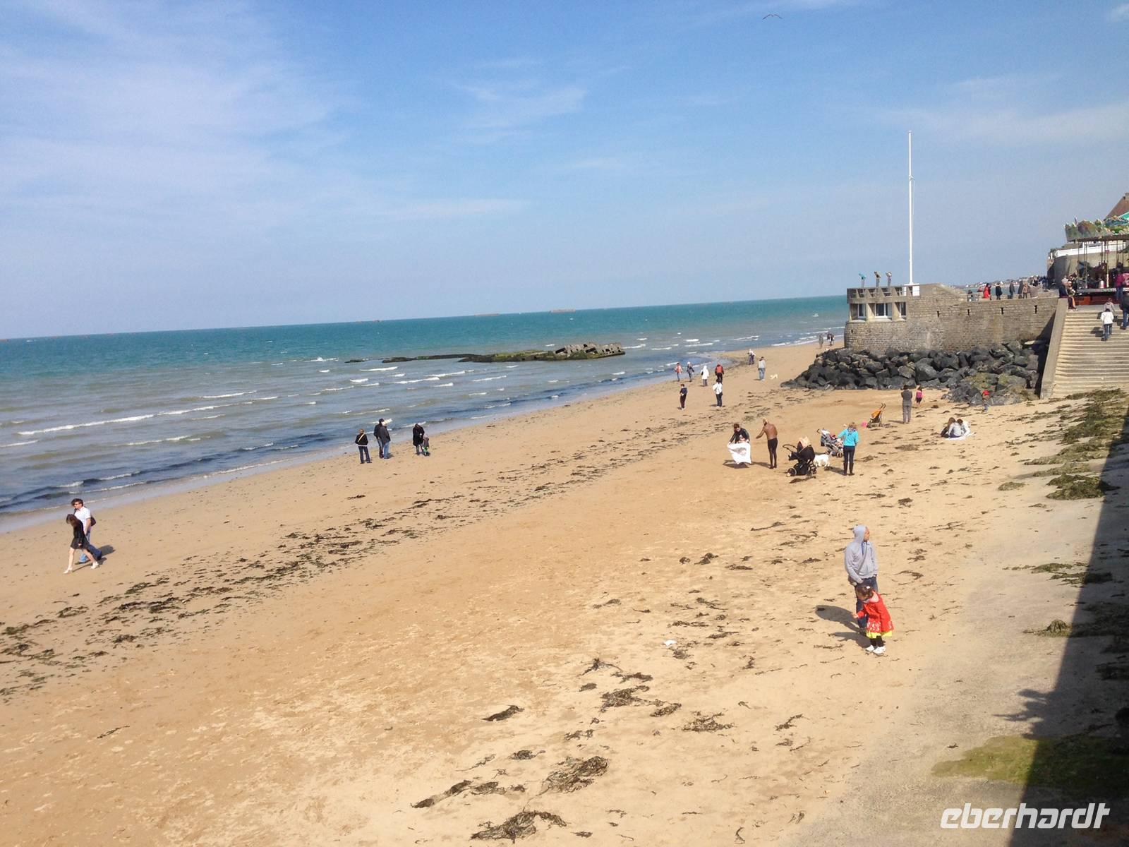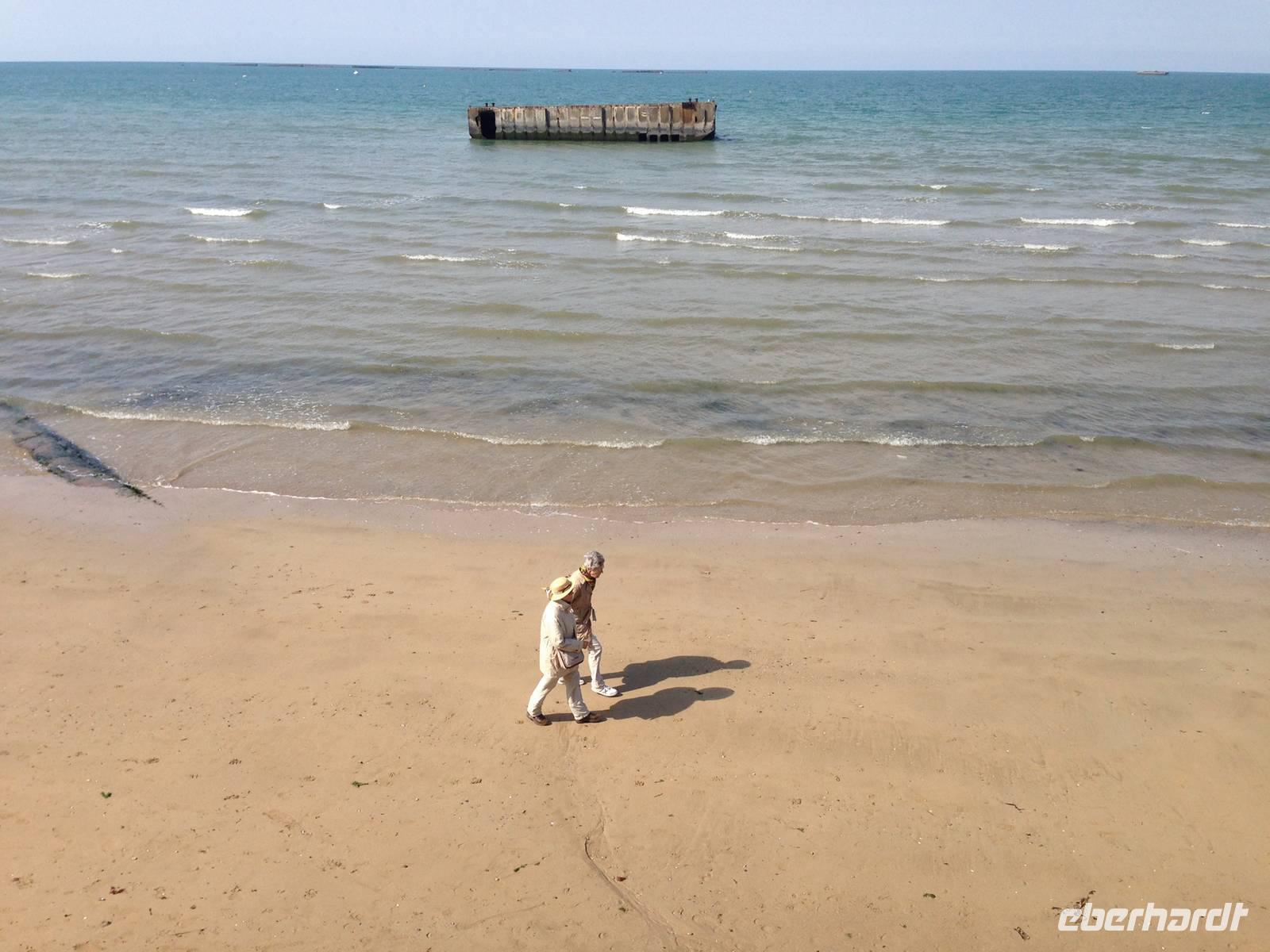 Anschließend setzen wir die Fahrt in Richtung Küste fort und passieren die aus dem Zweiten Weltkrieg und der Landung der Alliierten bekannte Pegasusbrücke. In Arromanches haben wir oberhalb des Badeortes einen guten Überblick über die Wracks der Senkkästen aus Beton, die Teil des Hafens waren, welcher hier am 6.Juni 1944 vom Meer aus als künstlicher Hafen für den Nachschub der Alliierten Streitkräfte gebaut wurde.