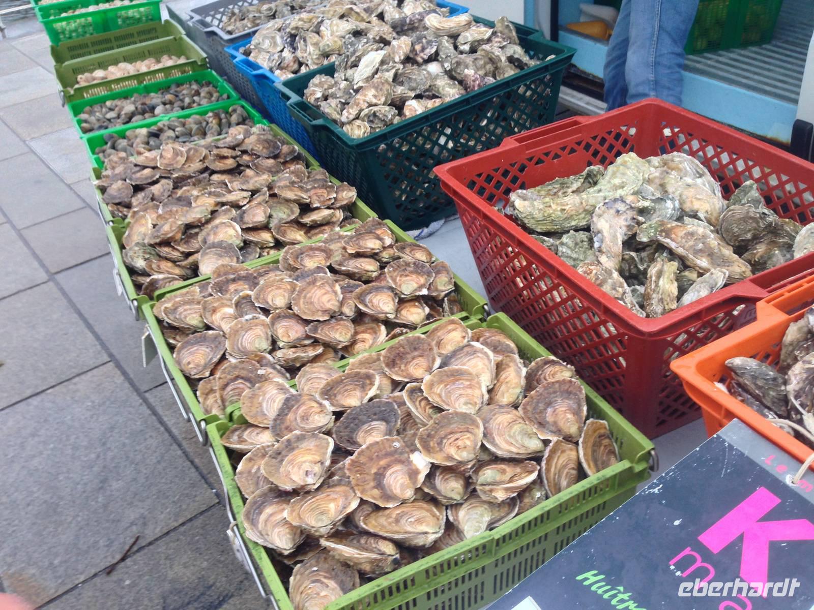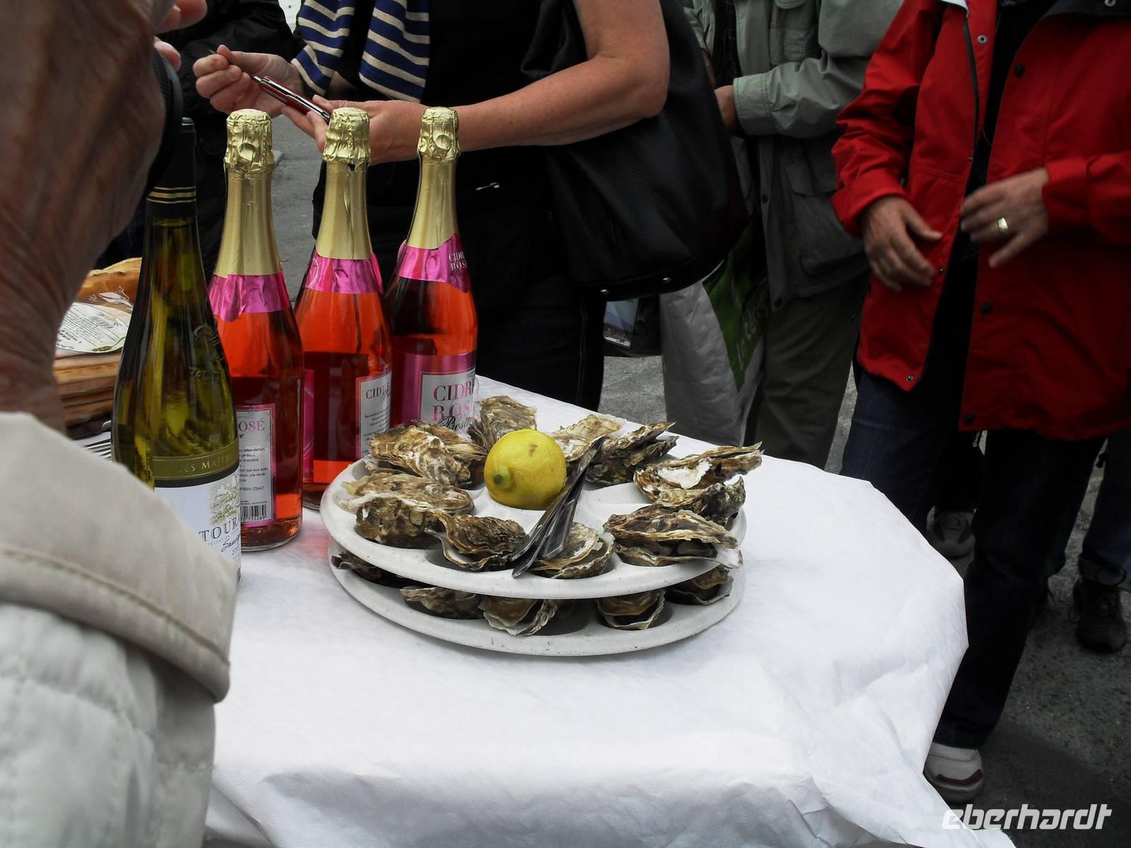 Nach drei phantastischen Stunden auf dem Mont verlassen wir die Normandie, es geht westwärts zurück in die Bretagne, durch die Polderlandschaft zur Austernprobe nach Cancale. Die Königin unter den Muscheln wird hier seit dem 19. Jahrhundert gezüchtet, denn die natürlichen Austernbänke der Bretagne waren aufgrund der großen Nachfrage erschöpft. Schon Julius Cäsar und König Heinrich IV. sollen passionierte Austernfans gewesen sein! Wir tasten uns vorsichtig an dieses für die meisten Reiseteilnehmer unbekannte kulinarische Vergnügen: Auf dem Markt kaufen wir mehrere Probierteller mit Huîtres Creuses, einer Austernart mit tiefem, bauchigem Gehäuse und großem Fleischanteil. Manche bleiben zurückhaltend, aber einige finden Gefallen an dem intensiven Geschmack von Meer und wollen mehr ...!