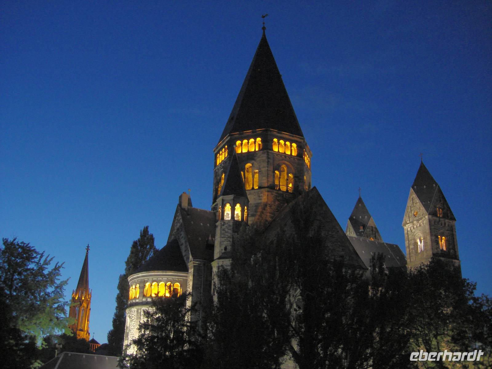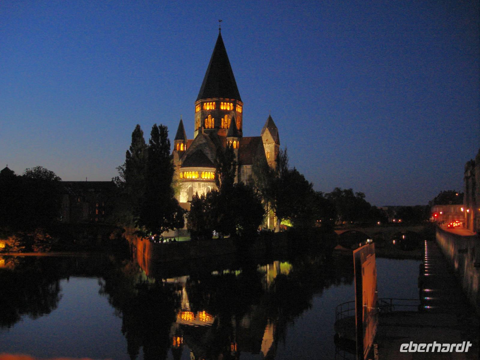 Anschließend geht es hinunter zur Mosel ... pardon, zur Moselle! Bitte die Betonung richtig machen: kein langes "o" sondern auf der letzten Silbe betonen, wir werden noch üben! Wir werfen einen kurzen Blick auf das Theater und spazieren entlang der Kaimauer. Der "Temple Neuf" liegt wie ein Schiff mitten im Fluss, teilt ihn mit bugartiger Umfriedung. Im katholischen Frankreich sind die "Temple" genannten protestantischen Kirchen eine Ausnahme.