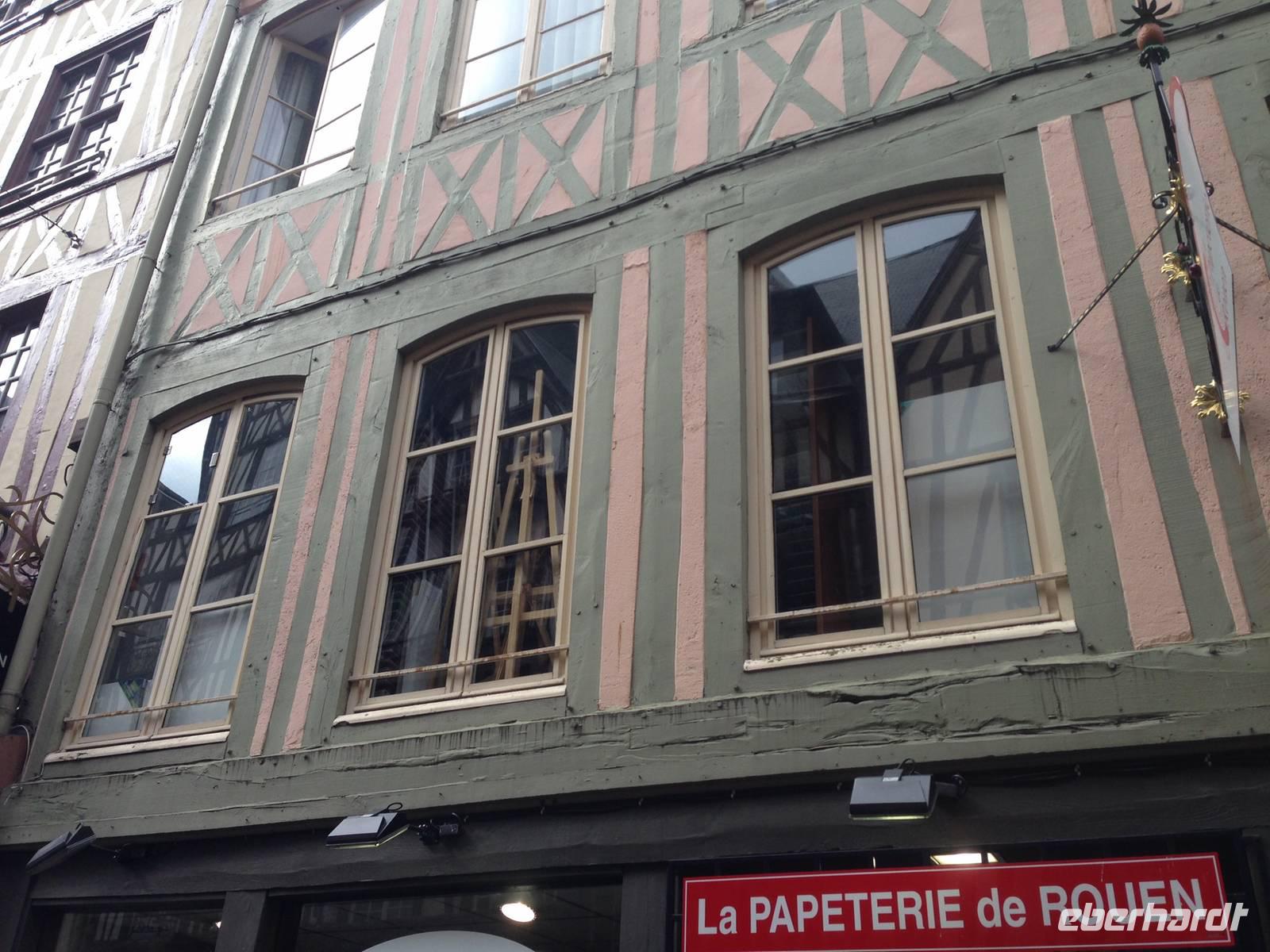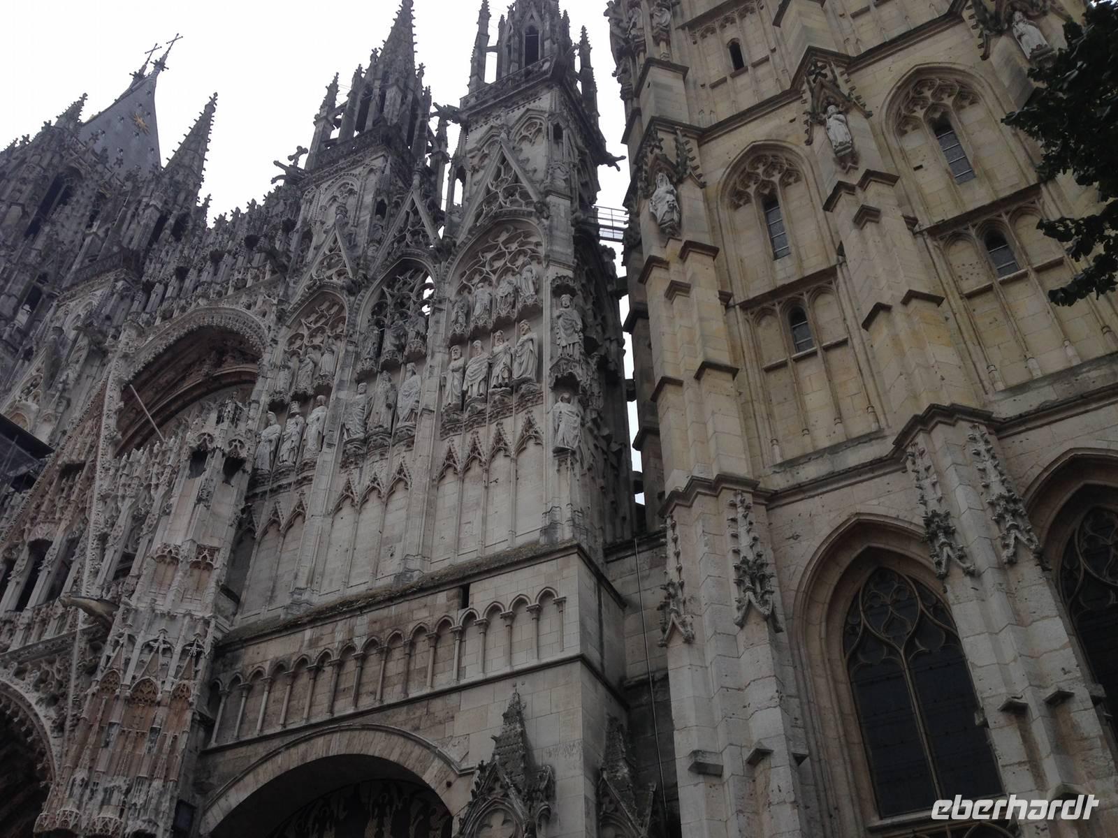 An der grandiosen Kathedrale von Rouen erwarten uns Silvia, die örtliche Reiseleiterin, die uns entlang beeindruckender Fachwerkzeilen und über stimmungsvolle Plätze führt. Heimliches Wahrzeichen der Stadt ist die herrliche Gros-Horloge, eine Uhr mit Stundenzeiger von 1389, die sich in einem prachtvollen Renaissance-Torbau befindet. Die Führung endet an der Place du Vieux Marché (Alter Markt), dem belebten Kern der Altstadt, wo die spätere Nationalheldin Jeanne d'Arc 1431 verbrannt wurde. Heute erinnert ein moderner Kirchenbau, welcher in die modernen Markthallen integriert ist, daran.