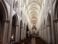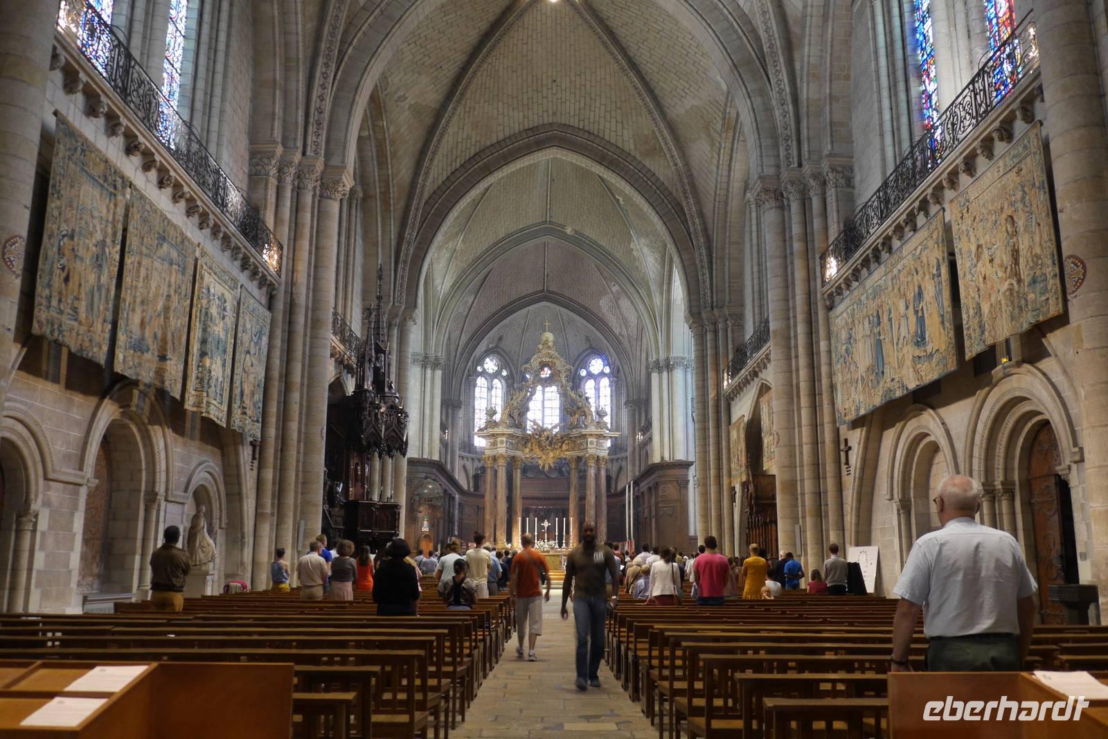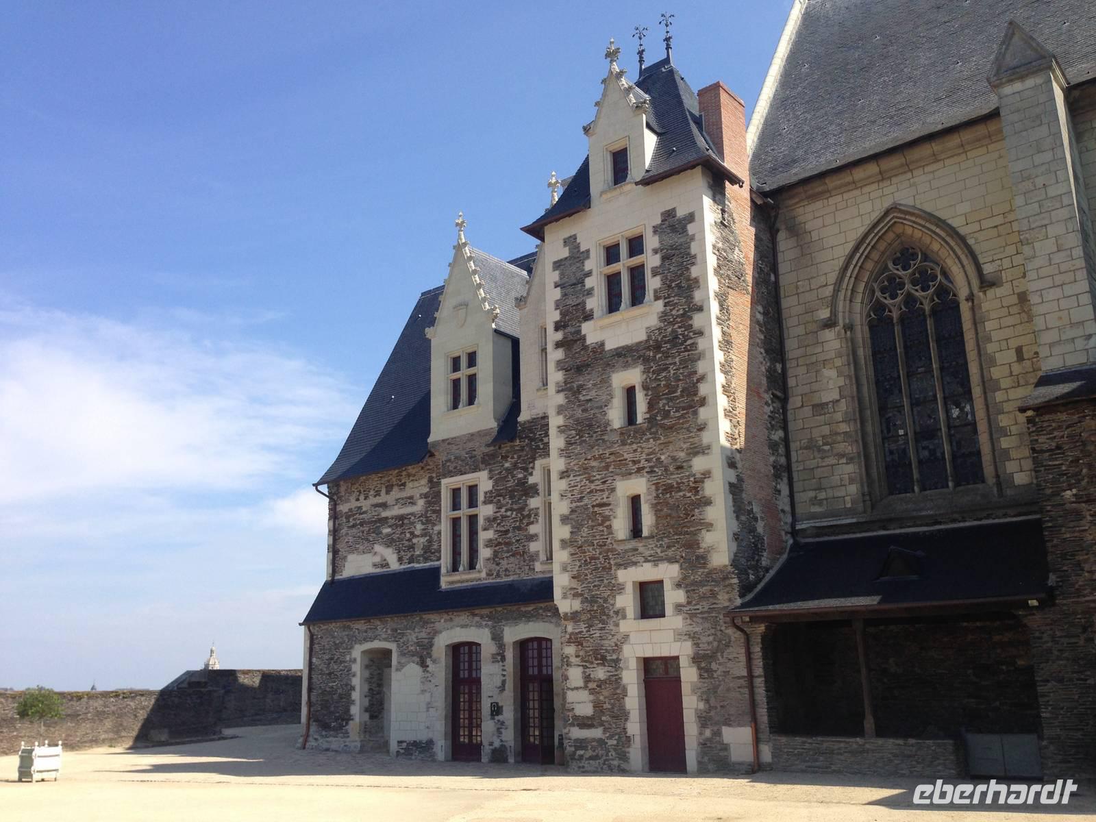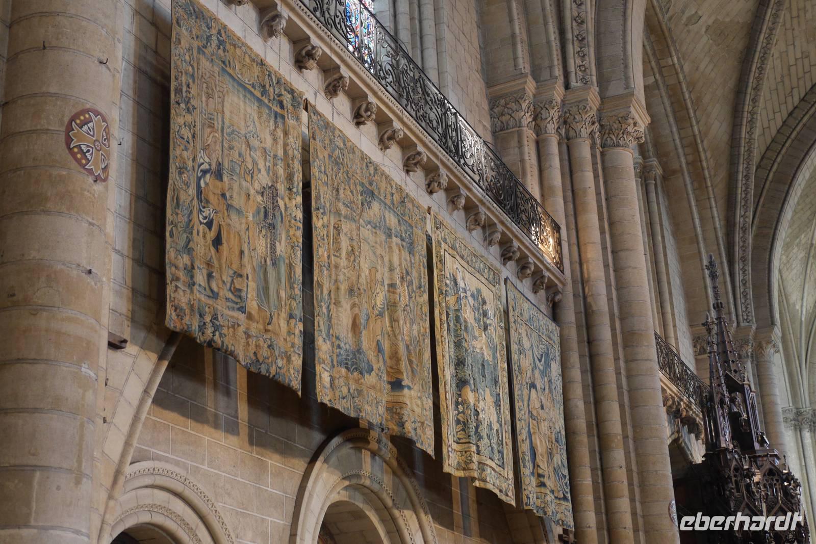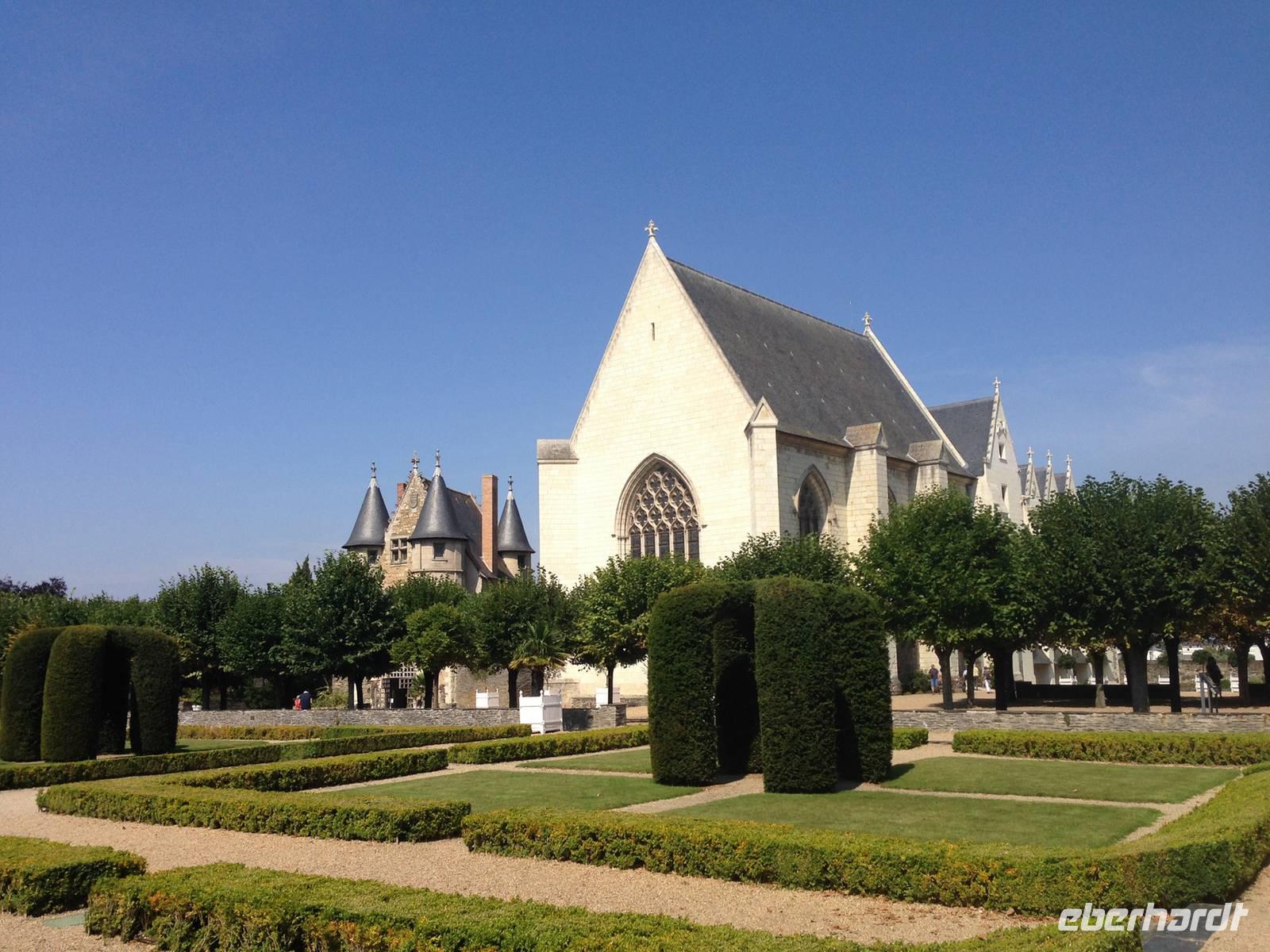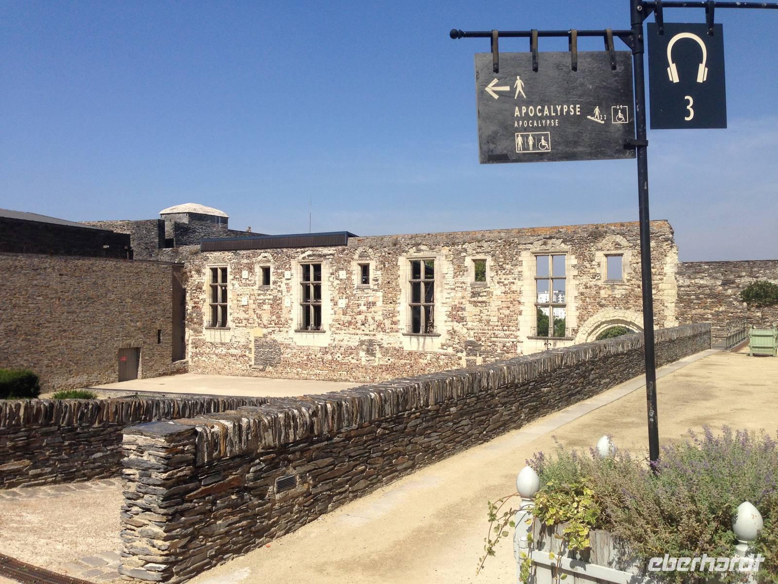 Bei wiederum herrlichem Sonnenschein erreichen wir Angers, wo das imposante Schloss der Anjou mit hohen Mauern und siebzehn gewaltigen Turmrümpfen aus weißem Tuffstein und schwarzem Schiefer als mächtige Festung vor uns liegt. Einige Gäste entscheiden sich für einen Stadtbummel oder eine Fahrt mit dem "Petit Train", die anderen nehmen den Weg über die ehemalige Zugbrücke und besichtigen das Schloss und den ausgestellten Zyklus der Apokalypse, der den Weltuntergang nach den Visionen des Apostels und Evangelisten Johannes darstellt. Das wertvolle Gobelinwerk ist in einem modernen, völlig abgedunkelten Museumsbau bei speziellem, künstlichem Licht präsentiert und ist mehr als überwältigend! Mit seinen geheimnisvollen Figuren und Allegorien zählt der Wandbehang zu den wichtigsten Zeugnissen unserer Geschichte und des christlichen Glaubens.