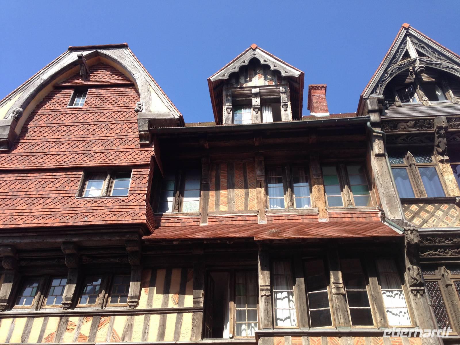 Danach geht die Reise weiter durch die Champagne und die Picardie bis nach Rouen, wo wir wiederum nur für eine Nacht das Hotel beziehen und nach dem Abendessen erschöpft in die Betten fallen! À-propos: ein neuer Trend, an welchem wir deutsche Touristen sicher nicht unschuldig sind, macht sich in französischen Hotels breit: Fast immer musste man sich früher zwischen zwei Bettlaken unter eine dünne Wolldecke klemmen und eine Nackenrolle als Kopfkissen zurechtklopfen. Am nächsten Morgen wachte man womöglich umwickelt von Laken, die Wolldecke weit weg, verspannt oder gar frierend auf. Heute finden wir die von zuhause gewohnten Bettecken und Bettbezüge vor, das macht die Nacht bequemer. Aber, Komfort hat eben seinen Preis: Wie in Frankreich fühle ich mich in diesen Hotelzimmern nur noch selten! Auch irgendwie schade!