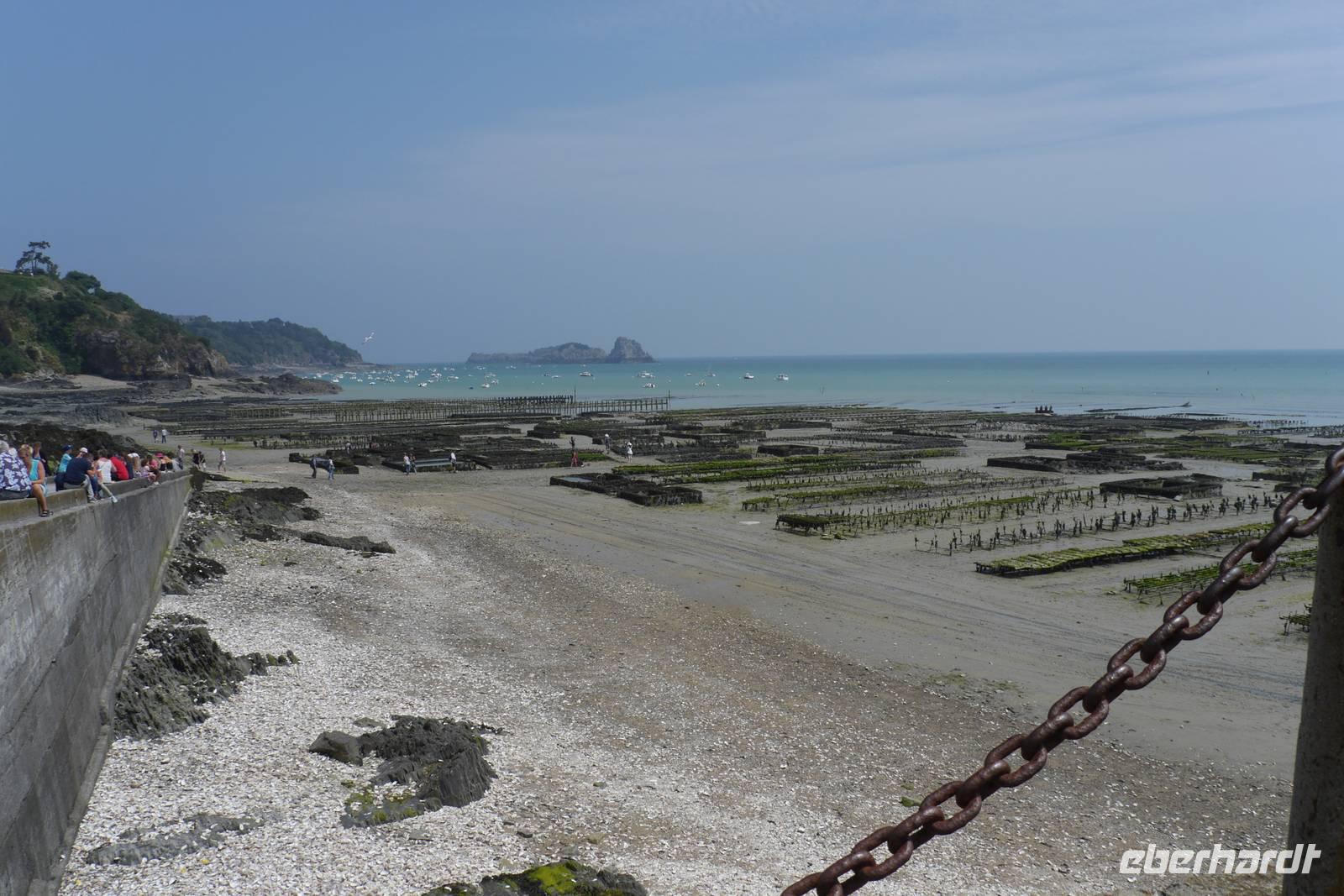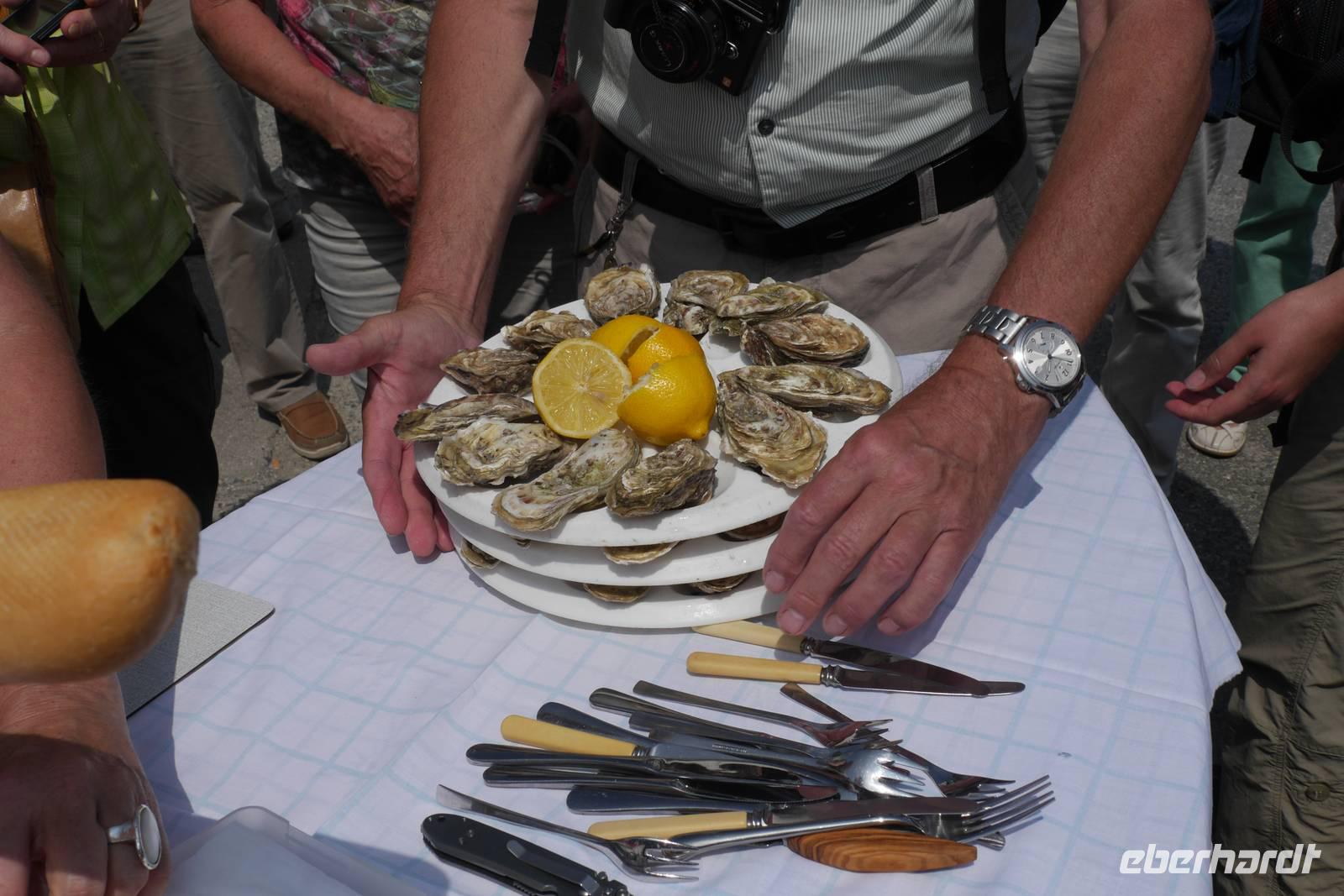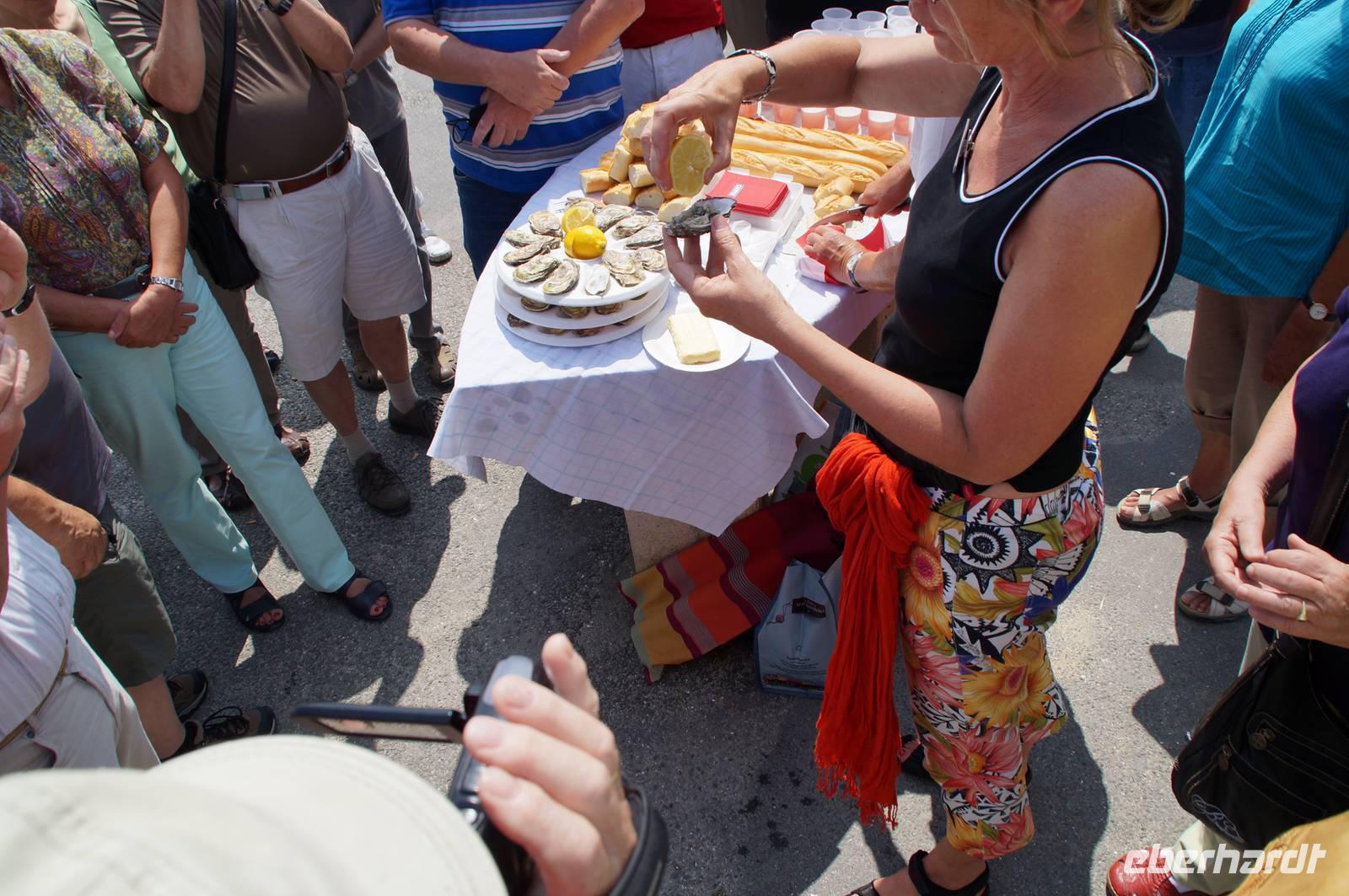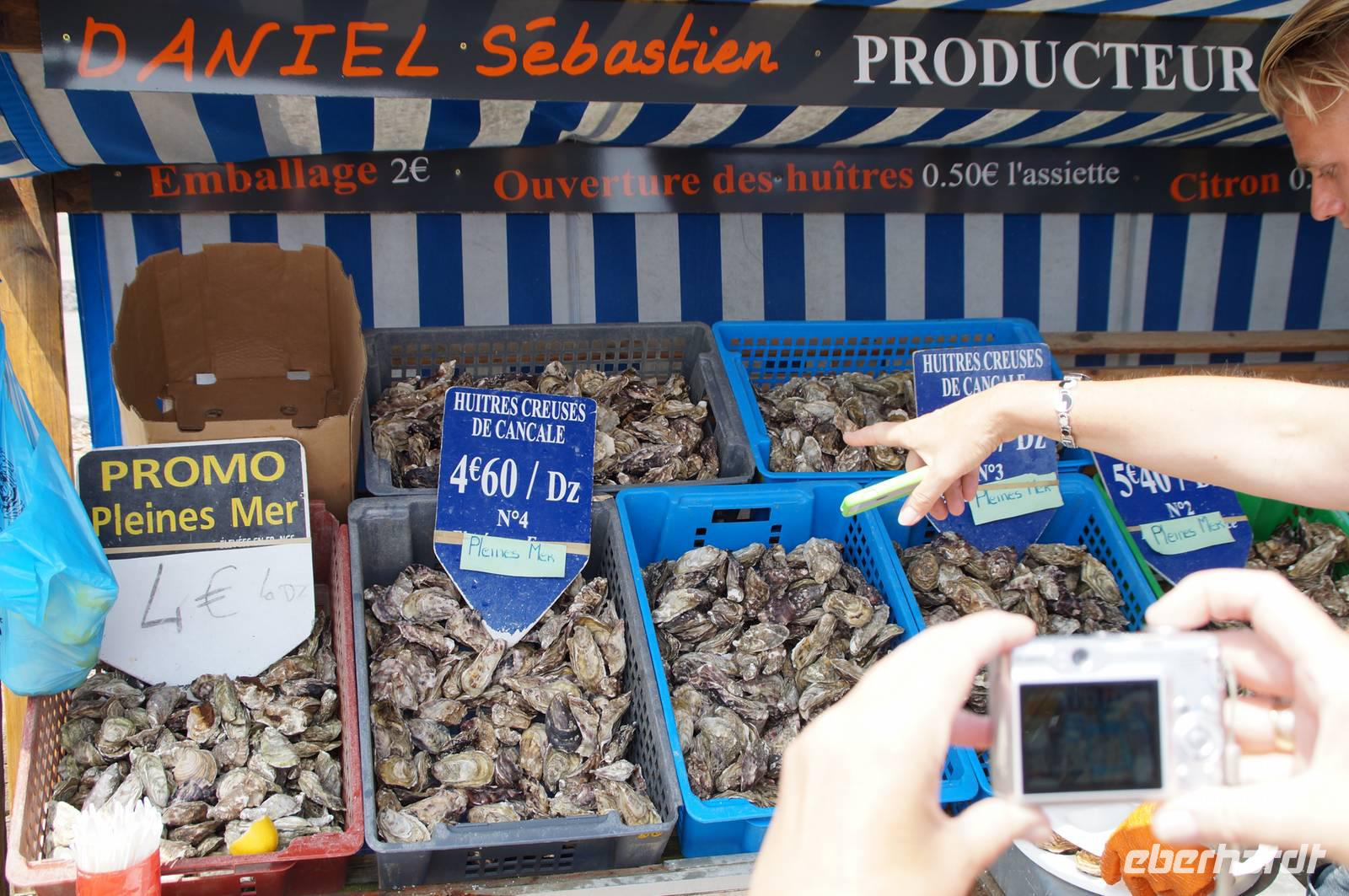 Nach drei phantastischen Stunden auf dem Mont verlassen wir die Normandie: Es geht westwärts durch die Polderlandschaft zur Austernprobe nach Cancale. Die Königin unter den Muscheln wird hier seit dem 13. Jahrhundert gezüchtet, denn die natürlichen Austernbänke der Bretagne waren aufgrund der großen Nachfrage bereits im Mittelalter erschöpft. Schon Julius Cäsar und König Heinrich IV. sollen passionierte Austernfans gewesen sein! Wir tasten uns vorsichtig an dieses für die meisten Reiseteilnehmer unbekannte kulinarische Vergnügen: Auf dem Markt kaufen wir mehrere Probierteller mit Huîtres Creuses, einer Austernart mit tiefem, bauchigem Gehäuse und großem Fleischanteil. Manche bleiben zurückhaltend, aber einige finden Gefallen an dem intensiven Geschmack von Meer und wollen mehr ...!