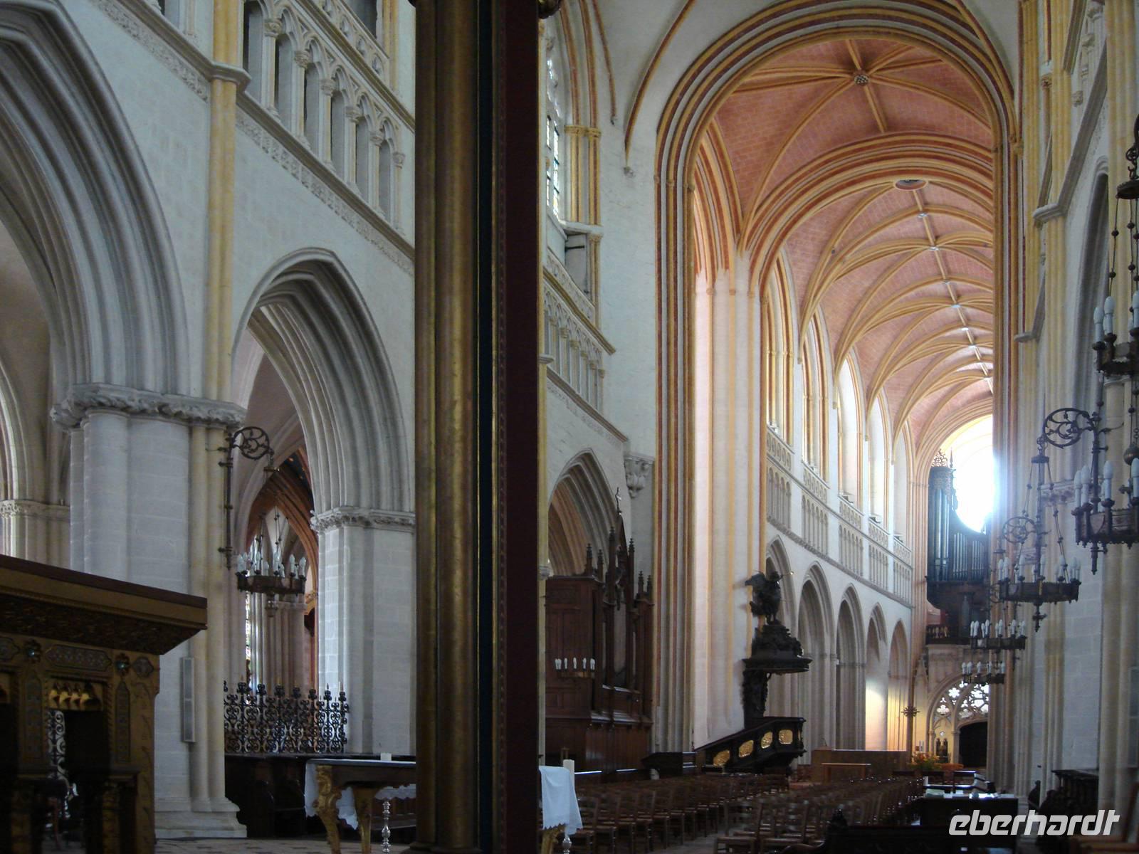 Unsere Reise in nach Frankreich beginnt wie immer zu früher Stunde am Flughafen in Dresden. Wir fahren über Erfurt, Frankfurt, Mannheim und Saarbrücken nach Metz. Nach dem "Dîner" beginnen wir unseren Spaziergang an der Place St. Louis, die fast italienisch anmutet: Laubengänge mit Treppenabgängen wie in Norditalien oder mancherorts in der Schweiz. Wir überqueren einen weiteren Platz, die Place Saint Jaques und um die nächste Straßenecke wartet das bekannteste Gebäude der Stadt: Die mächtige, gotische Kathedrale! Gigantische Strebebögen halten die Seitenwände des gotischen Kirchenschiffes und der jüngst restaurierte Muette-Turm erhebt sich vor unseren Augen 90 Meter hoch (bis zur äußersten Spitze gemessen!) in den Himmel. Die elf Tonnen schwere Glocke schlägt mittags zwölf Mal - nur an Wahltagen erklingt sie viertelstündlich!