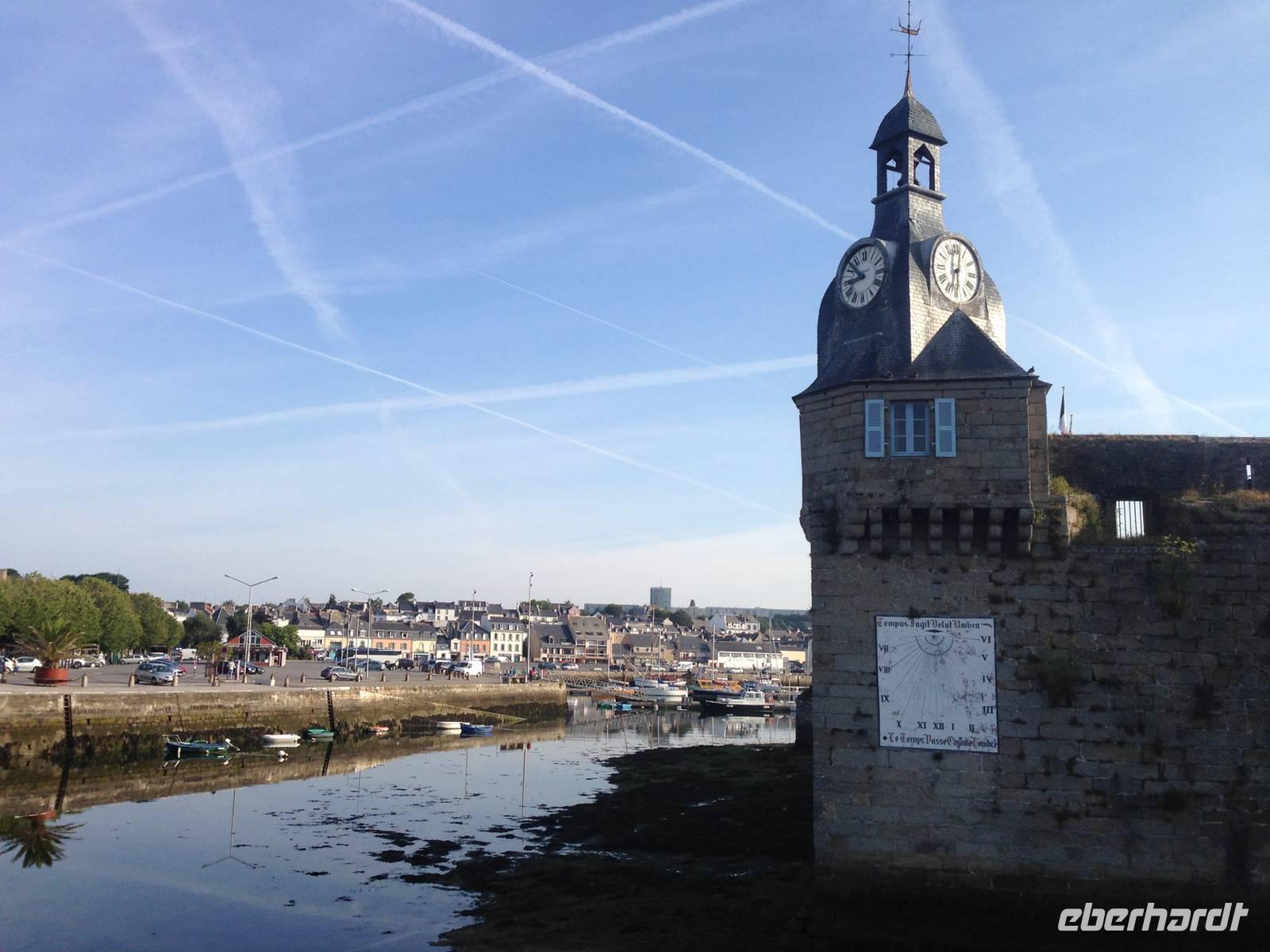 Nach kurzer Fahrt erreichen wir die Hafenstadt Concarneau, deren Zentrum gleich einer schwimmenden Festung im stattlichen Becken des Fischereihafens ruht. Eine einzige Brücke gewährt Zugang zu der Hauptstraße der nur 350 Meter langen "Ville Close". Hier schreien Möwen im Wind und die Luft schmeckt nach Salz, an der Sonnenuhr steht sinngemäß: "Die Zeit flieht wie ein flüchtiger Schatten!" Wir verlassen das Finistère, um in Richtung Osten zu weiterzufahren.