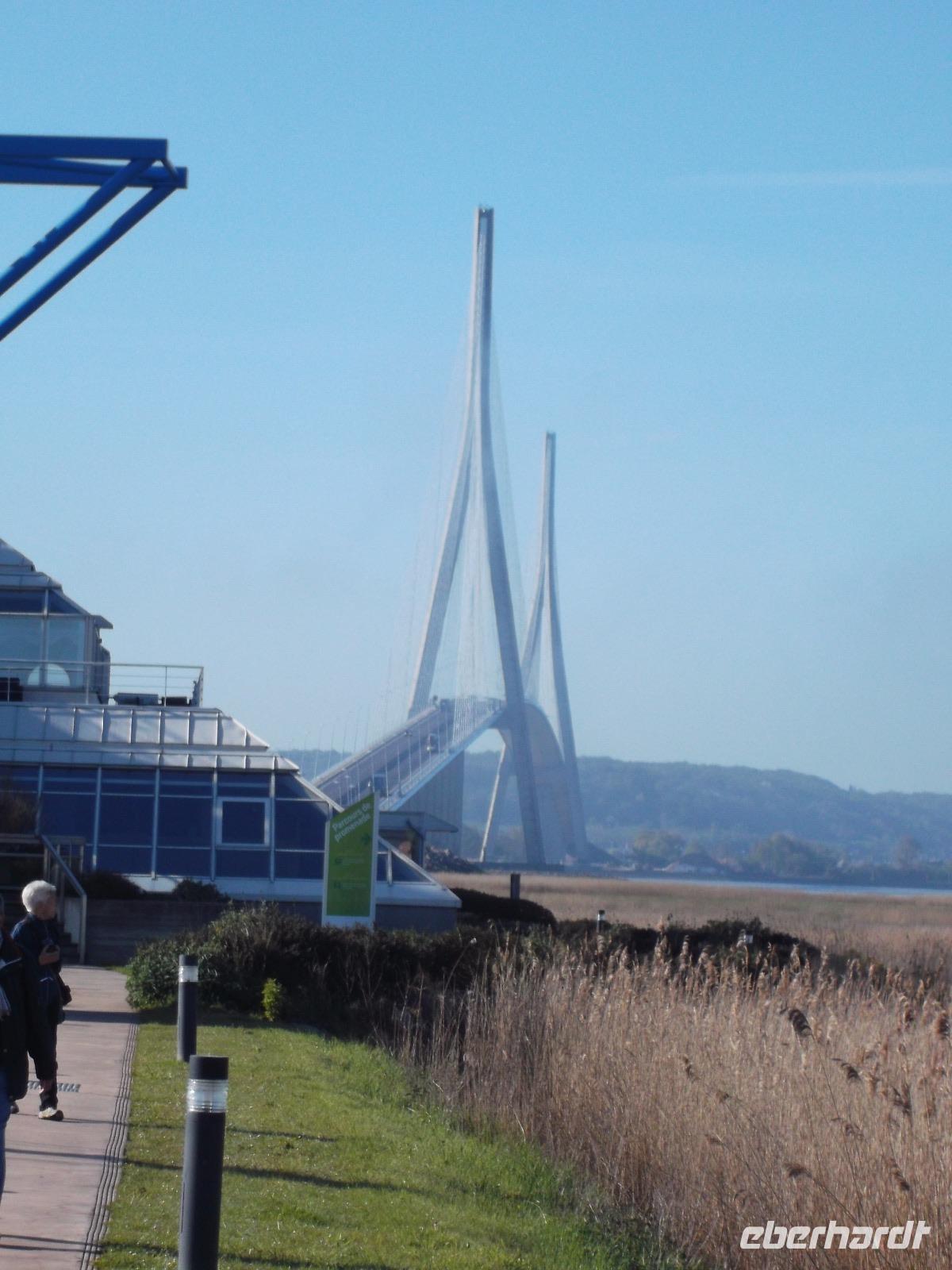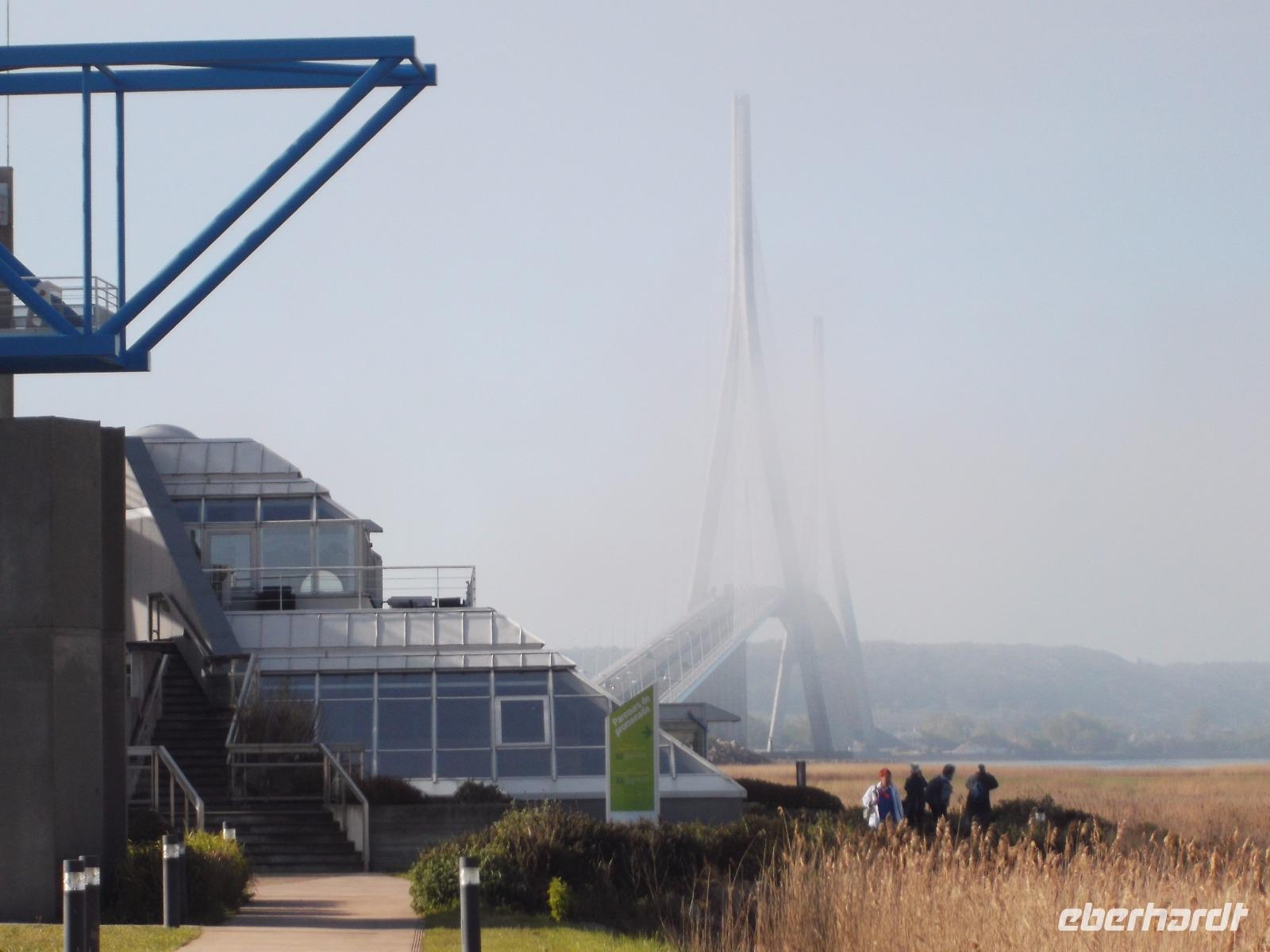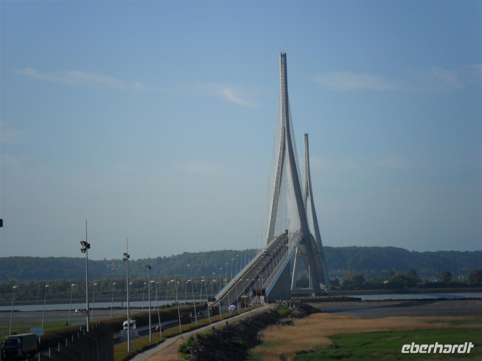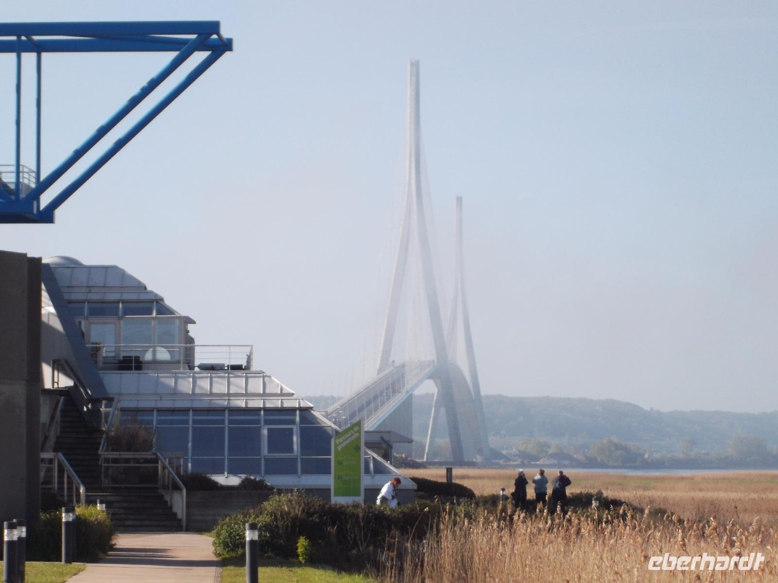 Von Le Havre aus erreichten wir schon nach ein paar Minuten die unweit vom riesigen Ölhafen liegende größte französische Brücke. Ihre Länge von 2414 m entspricht fast der der berühmten Pariser Prachtstraße Champs-Elysées und die Pont de Normandie gehört zu den größten Schrägseilbrücken der Welt. Aber wir hatten zunächst Pech: Obwohl wir einen schönen Aussichtspunkt an der Brücke hatten, verhinderte Morgennebel die Sicht auf den etwa 60 m über den Wassern der Seine verlaufenden gewaltigen Bogen zwischen seinen mächtigen Pylonen. Hier ist die wichtigste Verbindung über die Seinemündung mit einer vielbefahrenen mehrspurigen Straße - auf Sicherheit gebaut, denn die 1995 eröffnete Brücke kann auch schwersten Stürmen oder dem versehentlichen Anprall eines durchfahrenden Ozeanriesen standhalten. Da sich kurz vor unserer Abfahrt der Nebel wie durch ein Wunder minutenschnell verzog, hatten wir doch noch die Möglichkeit, das technische Wunderwerk genauer zu betrachten und zu fotografieren.