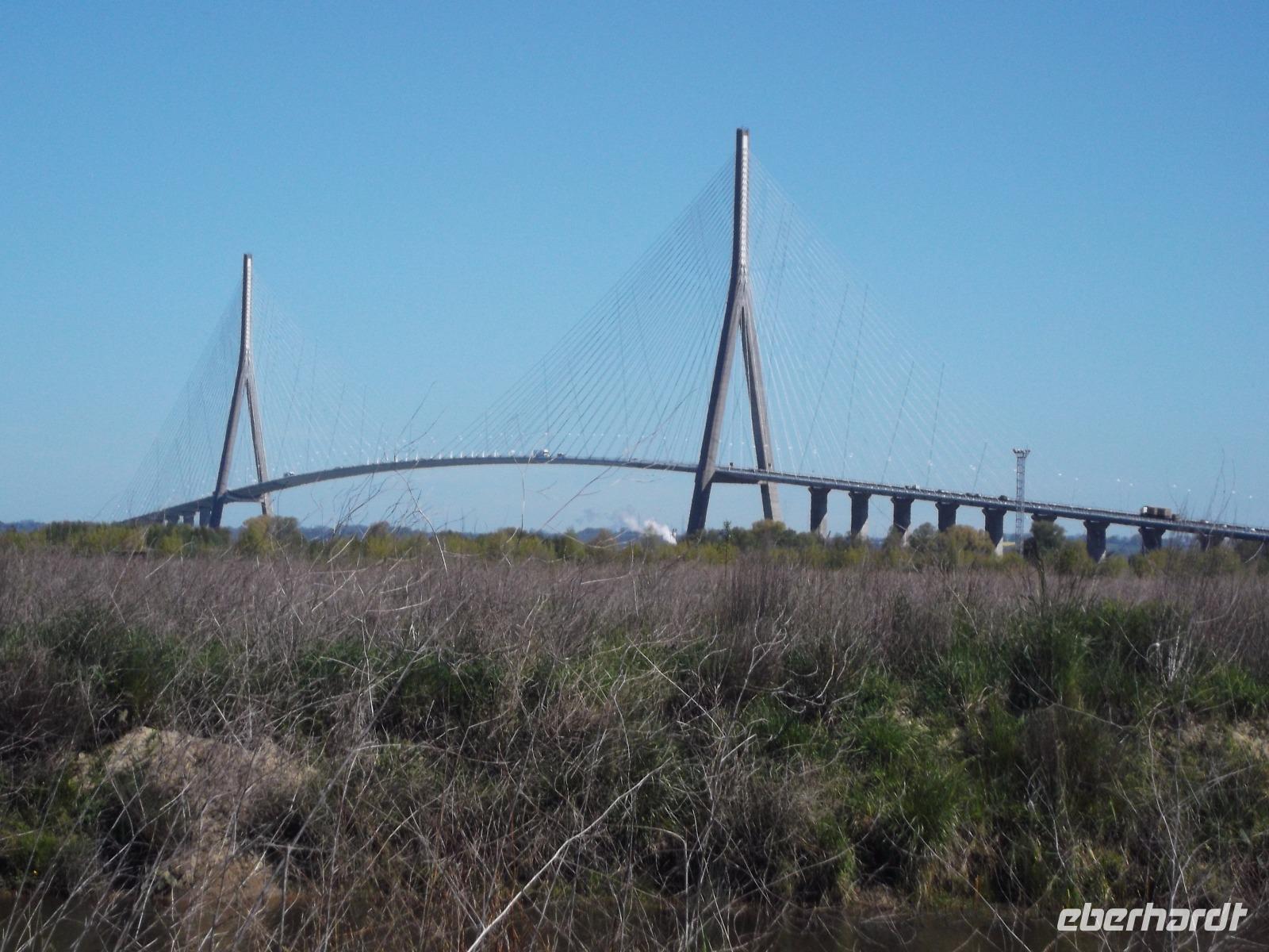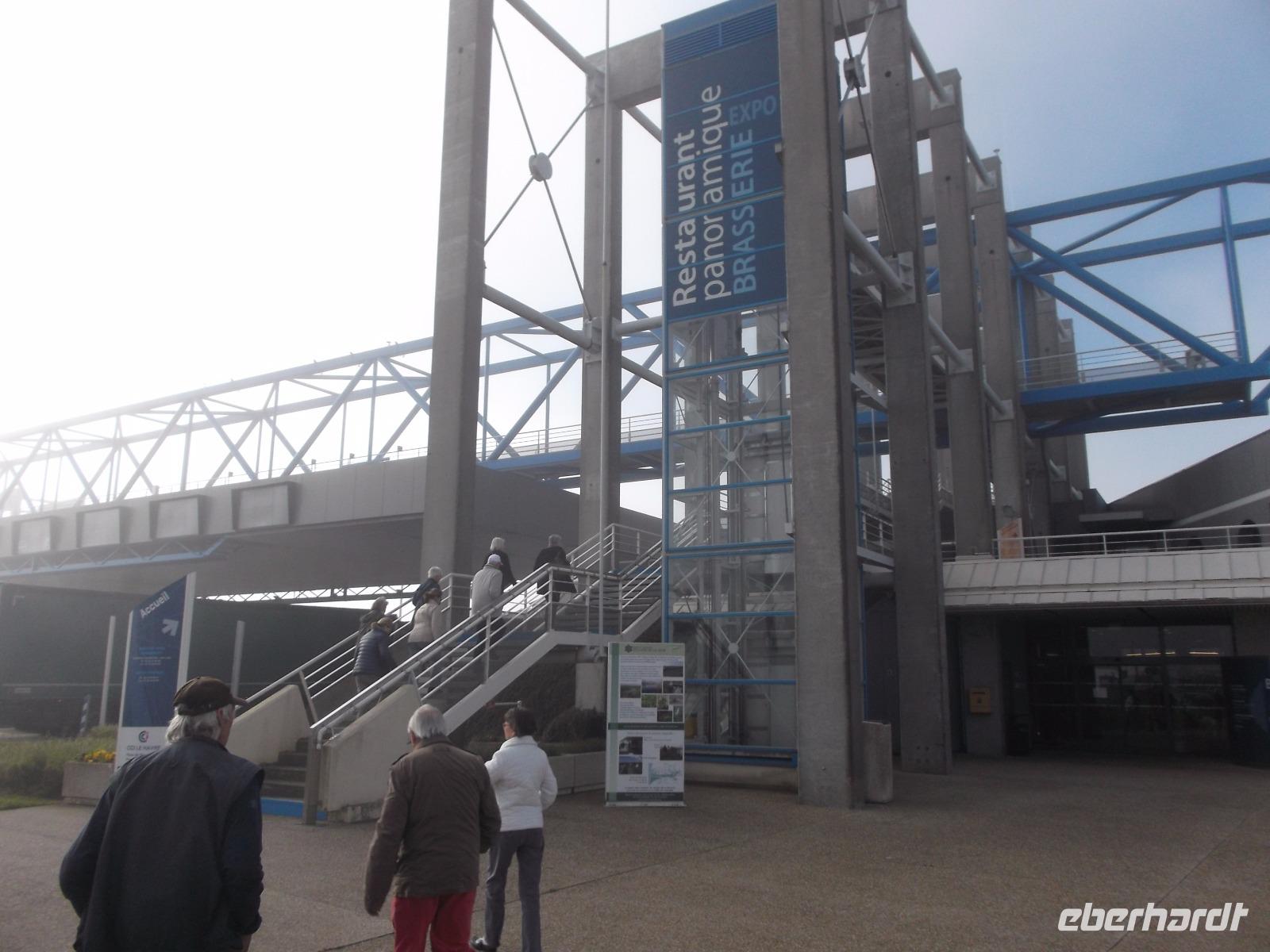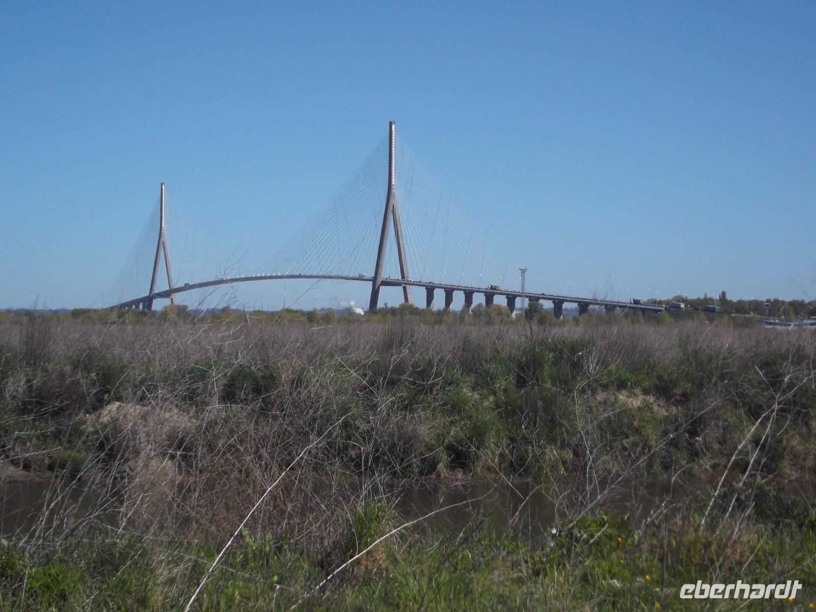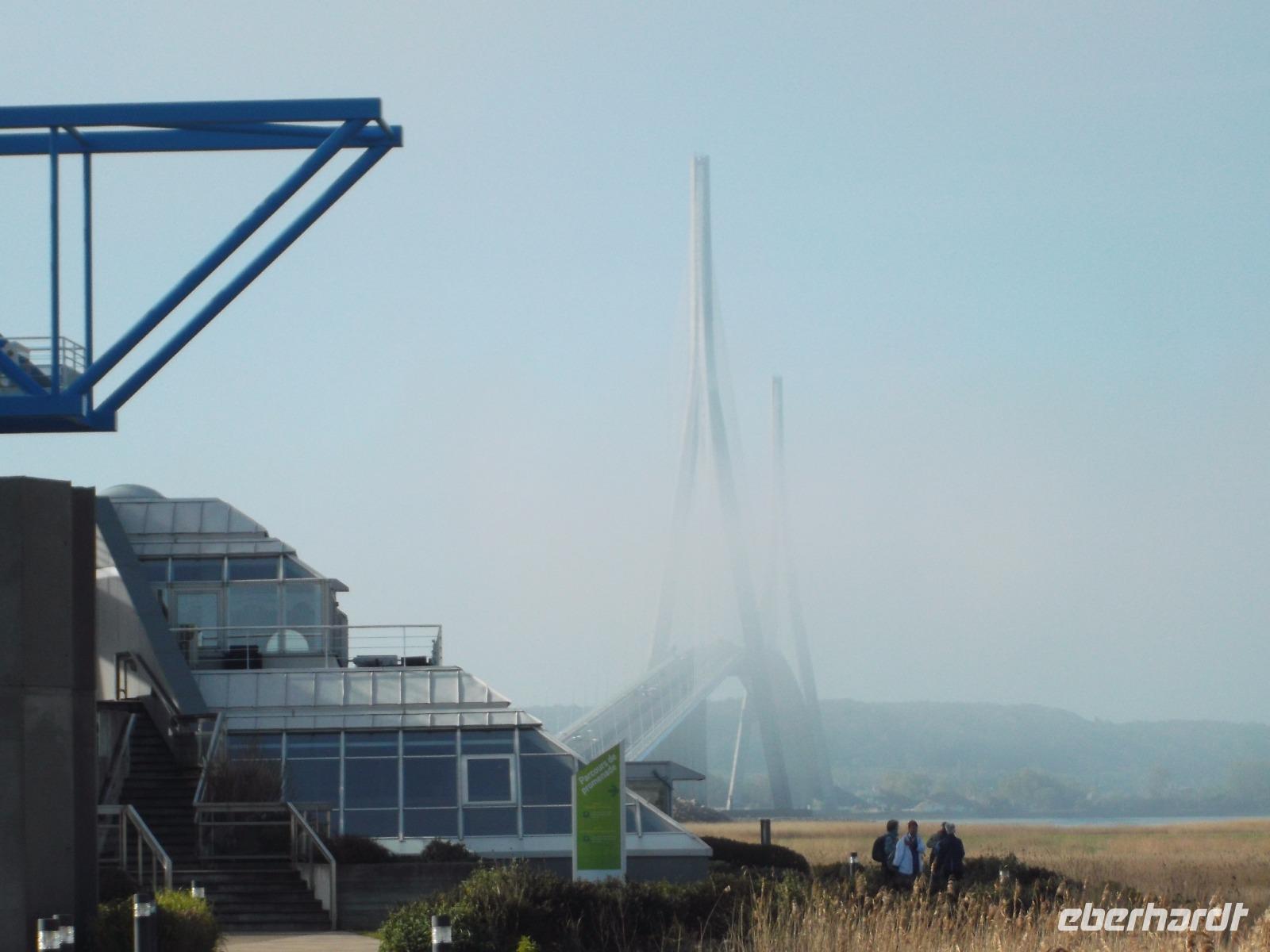 Von Le Havre aus erreichten wir schon nach ein paar Minuten die unweit vom riesigen Ölhafen liegende größte französische Brücke. Ihre Länge von 2414 m entspricht fast der der berühmten Pariser Prachtstraße Champs-Elysées und die Pont de Normandie gehört zu den größten Schrägseilbrücken der Welt. Aber wir hatten zunächst Pech: Obwohl wir einen schönen Aussichtspunkt an der Brücke hatten, verhinderte Morgennebel die Sicht auf den etwa 60 m über den Wassern der Seine verlaufenden gewaltigen Bogen zwischen seinen mächtigen Pylonen. Hier ist die wichtigste Verbindung über die Seinemündung mit einer vielbefahrenen mehrspurigen Straße - auf Sicherheit gebaut, denn die 1995 eröffnete Brücke kann auch schwersten Stürmen oder dem versehentlichen Anprall eines durchfahrenden Ozeanriesen standhalten. Da sich kurz vor unserer Abfahrt der Nebel wie durch ein Wunder minutenschnell verzog, hatten wir doch noch die Möglichkeit, das technische Wunderwerk genauer zu betrachten und zu fotografieren.