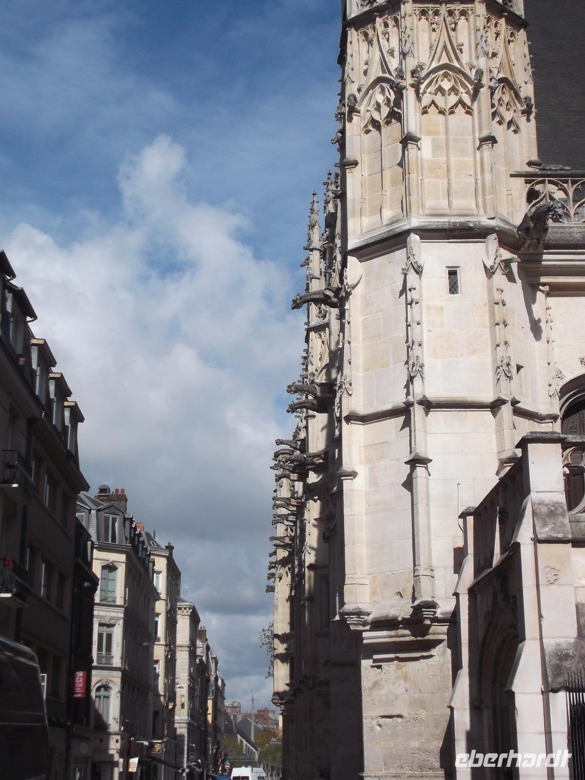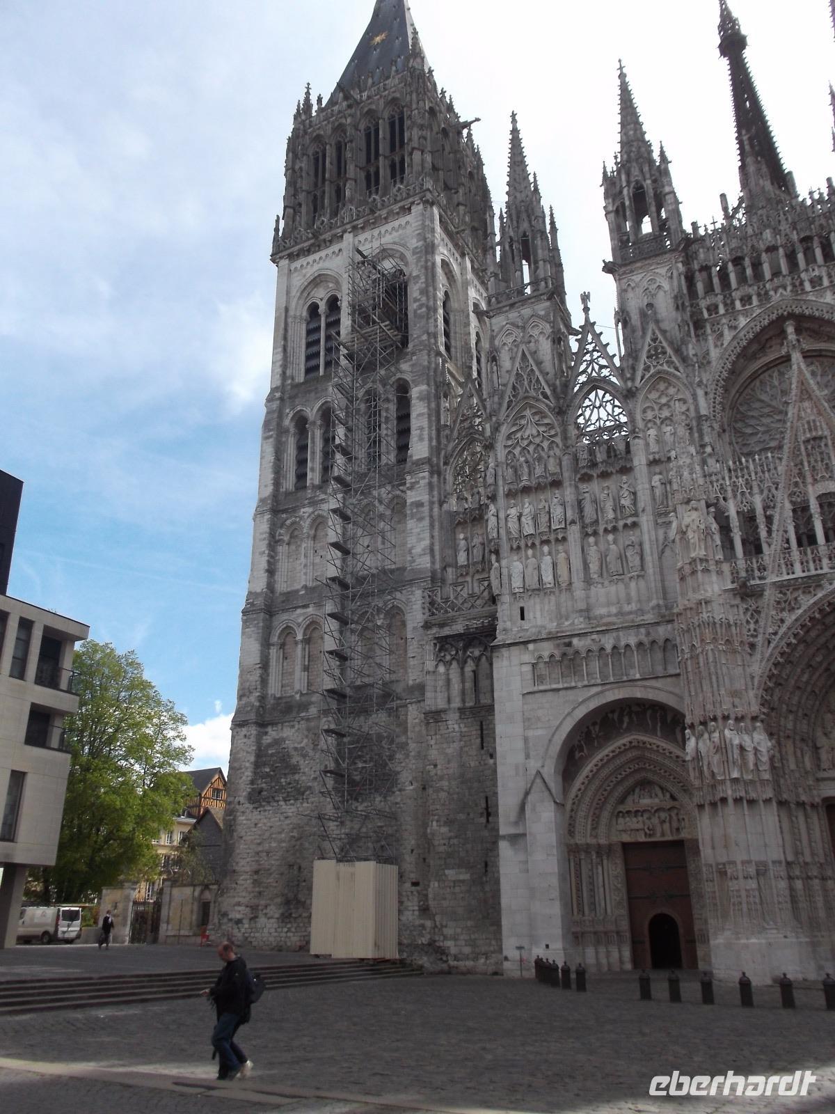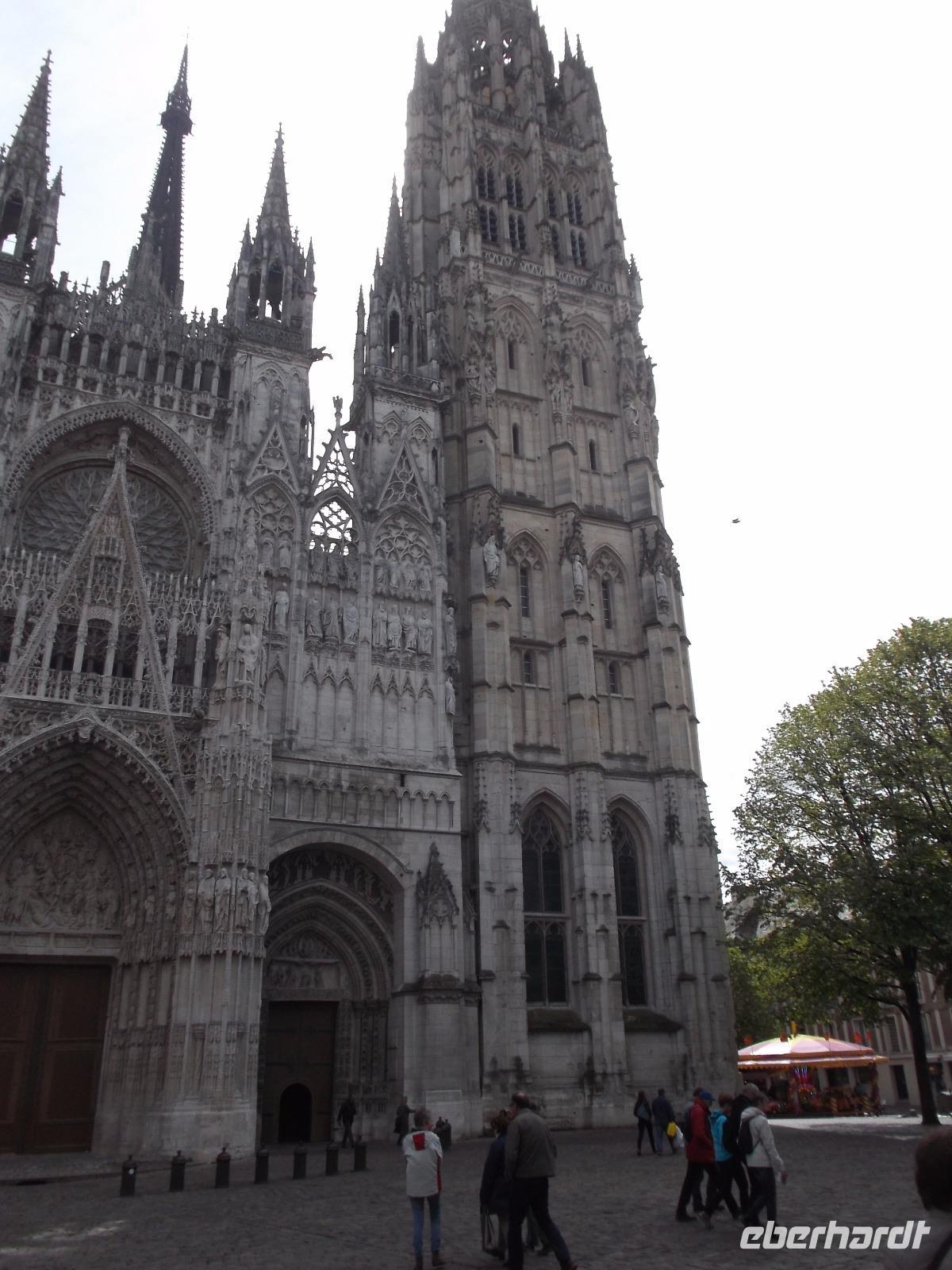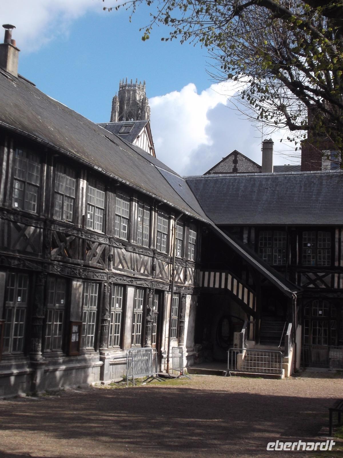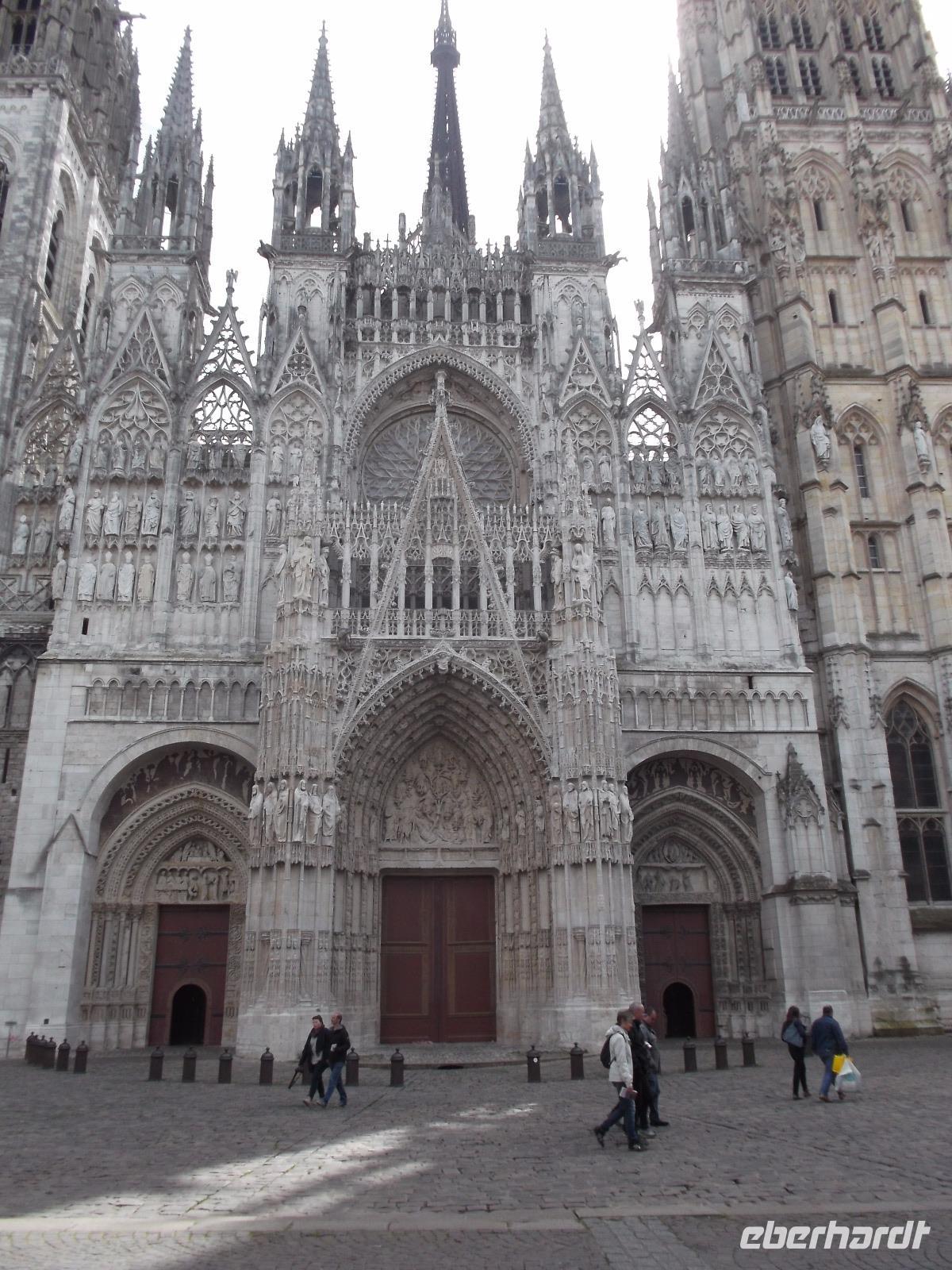 Zu Beginn des Tages erwartete uns ein ausführlicher Stadtrundgang in der normannischen Hauptstadt Rouen. Er begann am Platz vor der herrlichen Kathedrale - wie die schon zwei Tage zuvor kurz besuchte von Metz eine der bedeutendsten und schönsten in Frankreich und ein weiteres Paradestück der französischen Gotik. Vom gegenüberliegenden Renaissancehaus, heute Tourismus-Amt, hat der Maler Claude Monet die herrliche Westfassade immer wieder gemalt und mit den entstandenen 33 Bildern eine der bekanntesten Motivreihen des Impressionismus geschaffen, die ihm letztlich zum künstlerischen Durchbruch verhalf. Die filigran wirkenden Strebewerke und Verzierungen der Seitenaufbauten, die beiden Türme der Kirche, Wimperge und verschwenderisches Maßwerk, eine Fensterrosette und vieles mehr gehören zu den Besonderheiten der Kathedrale von Rouen. Es begeistert der Figurenschmuck der westlichen Schaufassade zwischen den Türmen, von denen einer „Butterturm" genannt wird, da sein Bau aus Sonderzahlungen in der Fastenzeit, dem sogenannten „Butterpfennig" finanziert wurde: Das Innere nimmt - trotz niedrigerer Gewölbehöhe als in Metz - auch mit einer phantastischen Raumwirkung und dem Eindruck sich wahrlich inmitten der Gotik zu befinden, gefangen. Wir hatten etwas Zeit, den eindrucksvollen Kirchenraum zu erkunden, bevor wir ihn durch das nördliche Seitenportal - aussen verziert mit „Höllenbildern", die vor den Gefahren sündhaften Lebens warnen sollen, wieder verließen. An der Nordseite der Kirche finden beginnen die Viertel mit den uralten malerischen Fachwerkhäusern der Altstadt von Rouen und hier befindet sich auch - direkt an die Kirche gebaut - der nur noch als Ruine erhaltene alte Bischofspalastes. Hier war der Schauplatz des Prozesses gegen die französische Nationalheilige Jeanne d'Arc. Diese, bekannt als die „Jungfrau von Orleans" spielt eine bedeutende Rolle in der Geschichte. Sie hatte im 15. Jahrhundert im grausamen „hundertjährigen Krieg" Englands gegen Frankreich Partei ergriffen und als in Rüstung dem französischen Heer voranreitende Anführerin wohl die Wende des Krieges und damit wohl den Sieg Frankreichs herbeigeführt. Als 1430 die Engländer sie gefangen nahmen, veranstaltete man hier in Rouen einen Schauprozess wegen Ketzerei verurteilte sie 1431 genau in dem Gerichtssaal an der Kathedrale von Rouen zum Tode auf dem Scheiterhaufen.